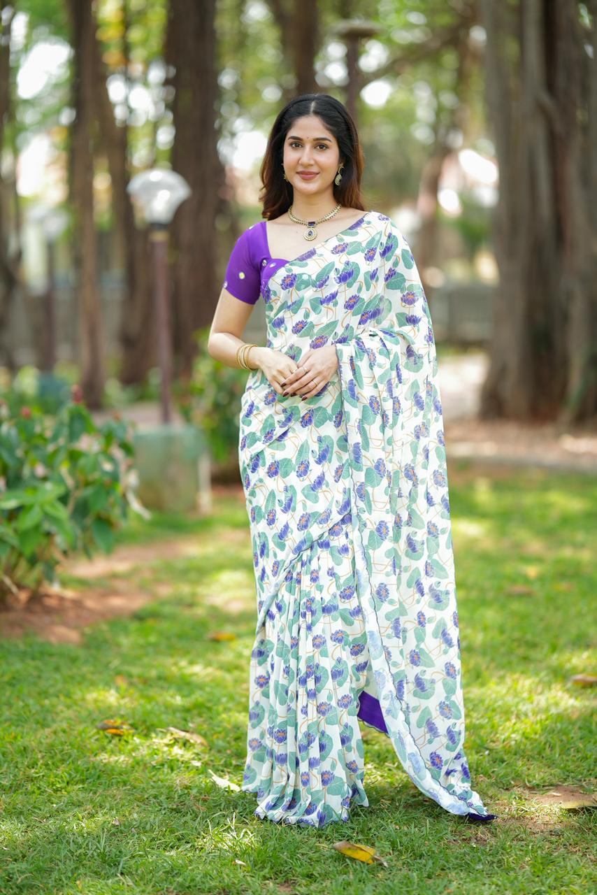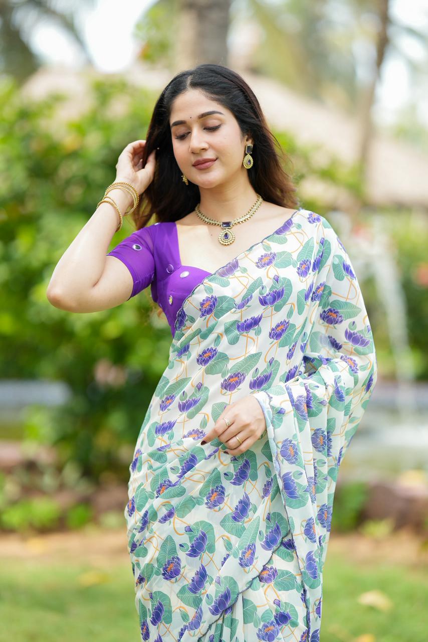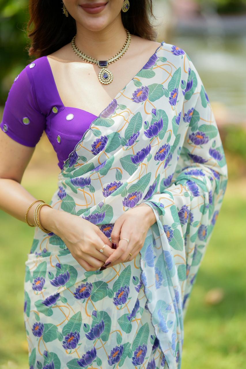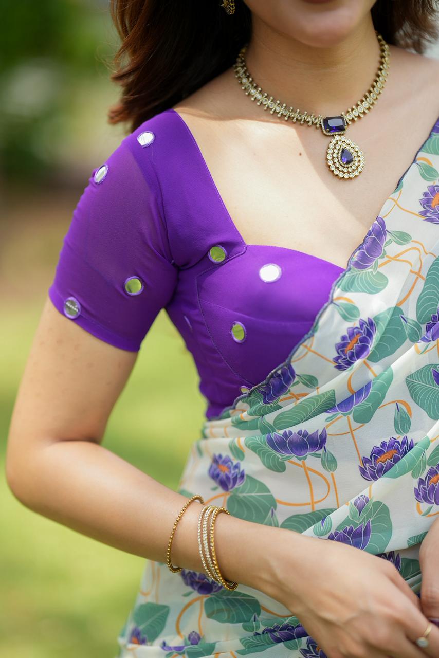 Paired with the saree is a striking royal purple blouse designed with sculpted cups and delicate mirror embellishments that shimmer subtly with movement. The structured silhouette beautifully balances the softness of the floral drape, while the mirror accents add a festive sparkle that elevates the entire ensemble.