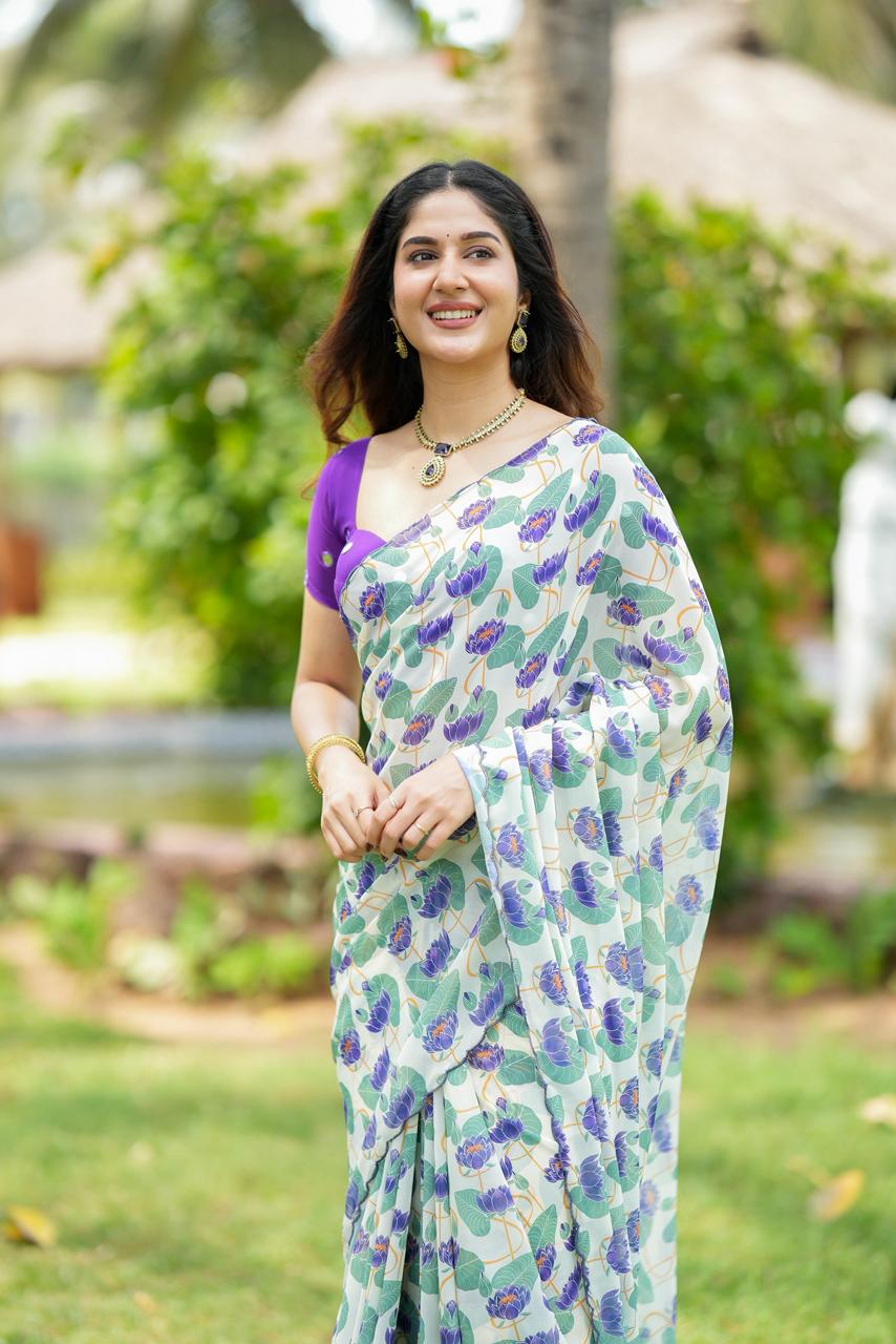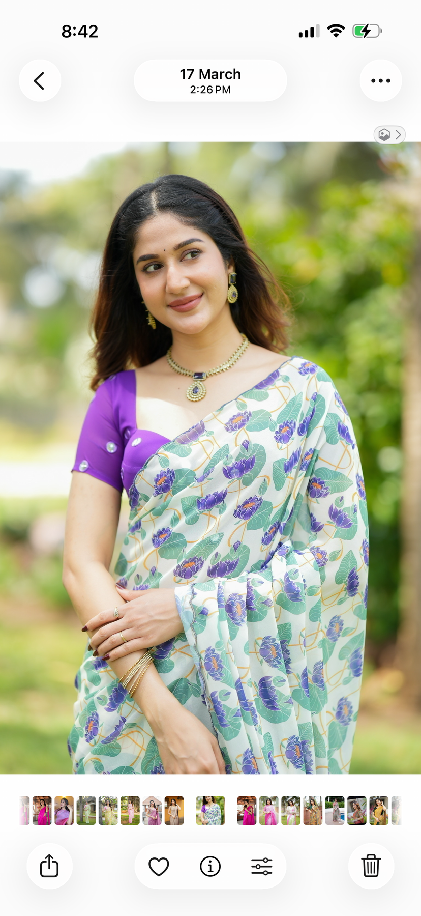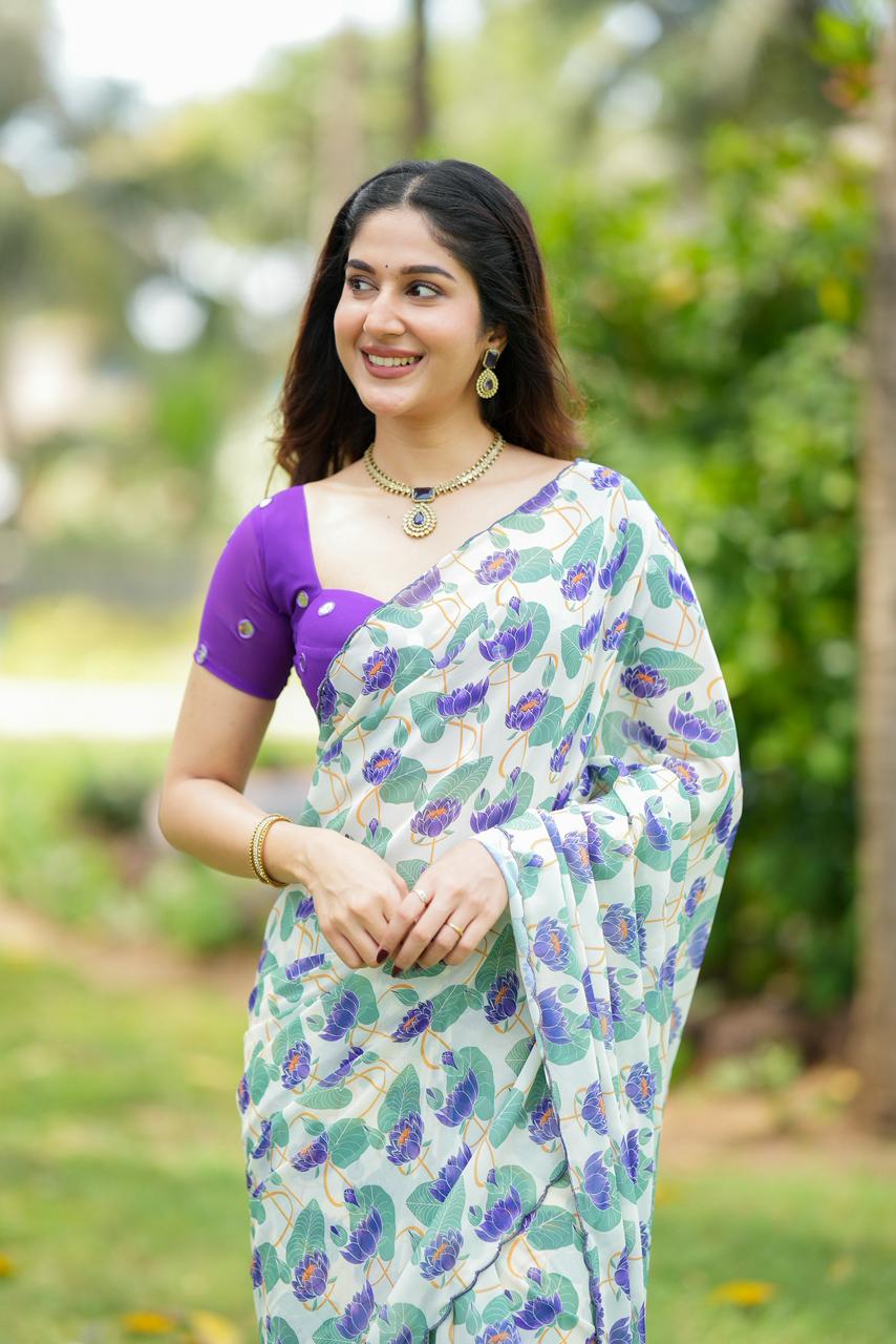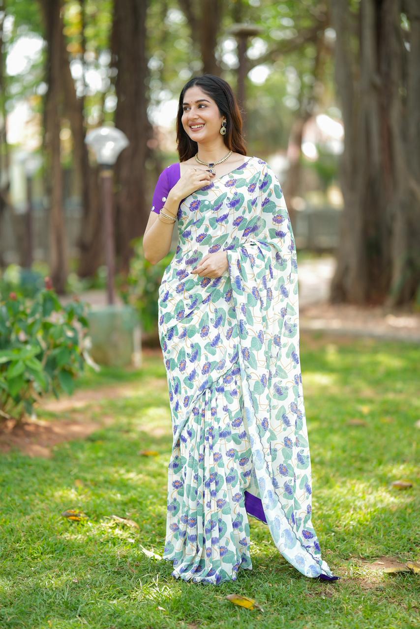 Paired with the saree is a striking royal purple blouse designed with sculpted cups and delicate mirror embellishments that shimmer subtly with movement. The structured silhouette beautifully balances the softness of the floral drape, while the mirror accents add a festive sparkle that elevates the entire ensemble.