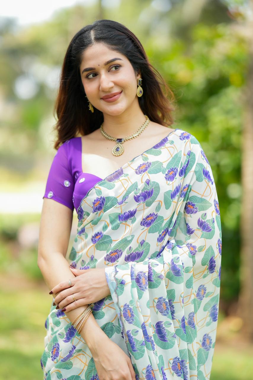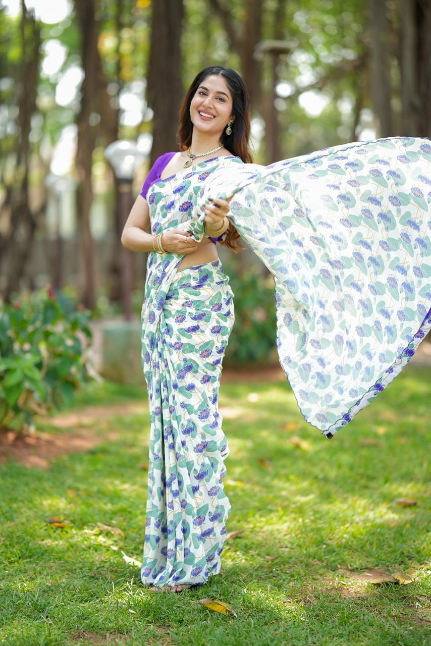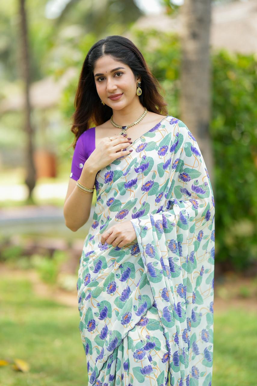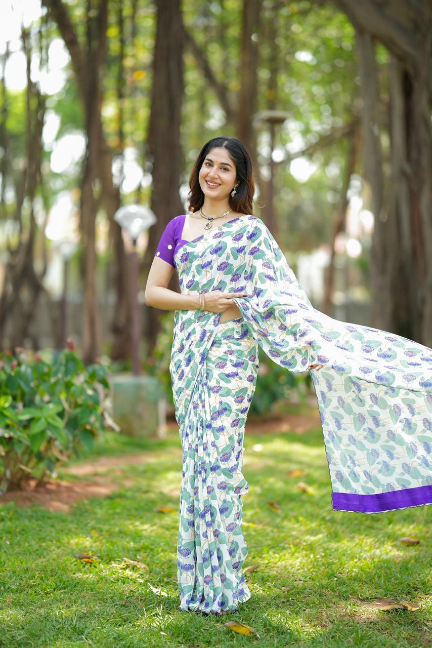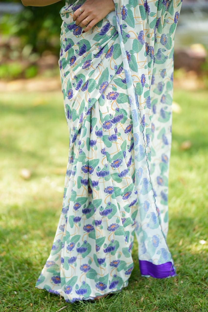 Graceful and captivating, Neel Kamala Luxe draws its inspiration from the serene beauty of blooming lotus ponds. The saree features a soft ivory base adorned with elegant violet lotus motifs and lush green leaves, creating a refreshing nature-inspired aesthetic. The artistic floral layout evokes calm sophistication, making the drape both timeless and distinctive.
