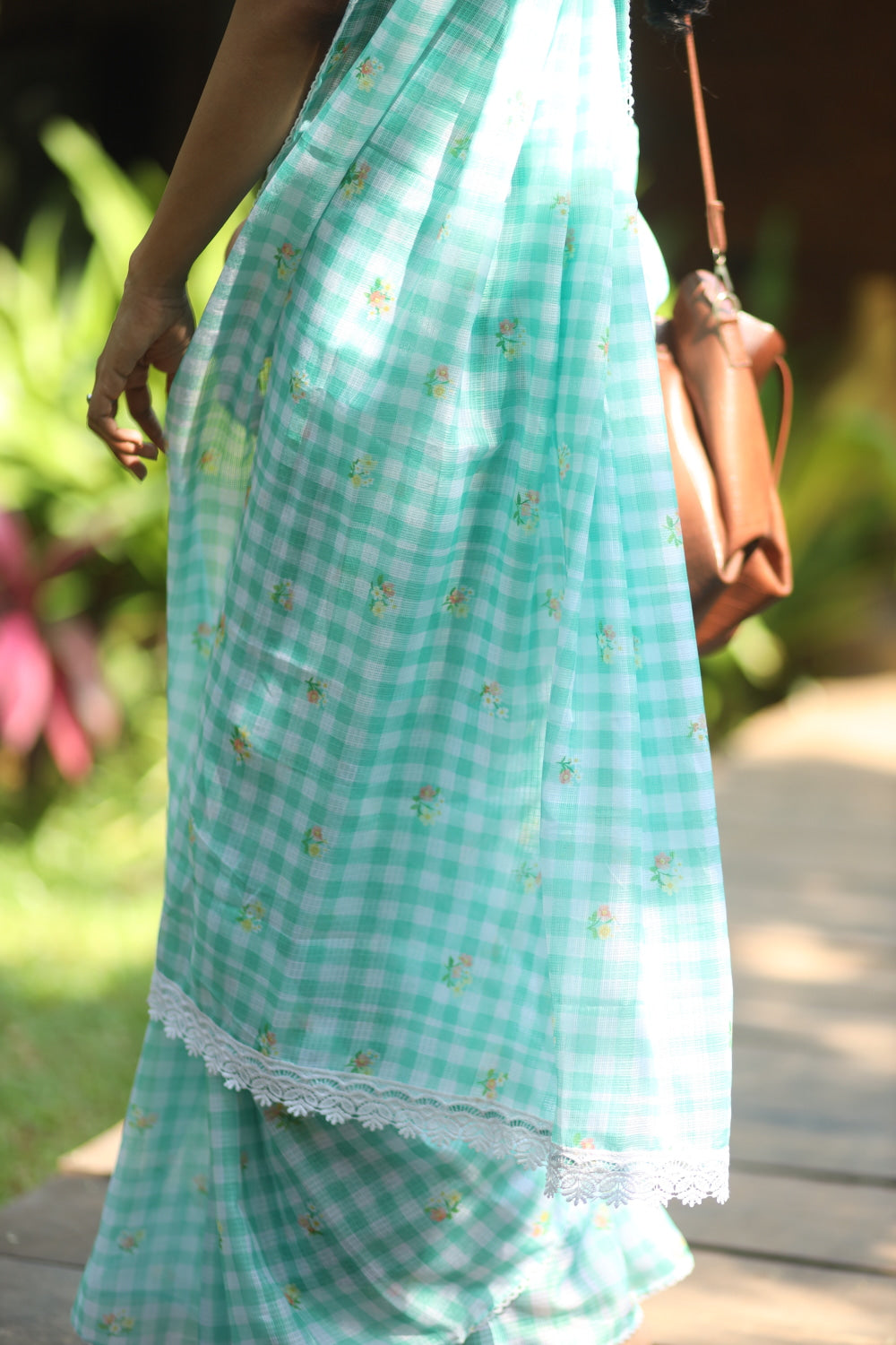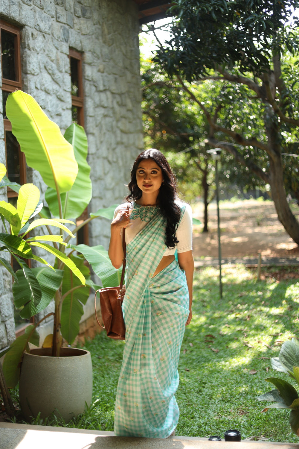 Fresh, breezy, and made for sunlit days, Sivya Mint Summer EDIT captures the essence of effortless summer styling. The saree features a refreshing mint gingham base sprinkled with delicate floral motifs, creating a light, playful aesthetic that feels both soft and uplifting.