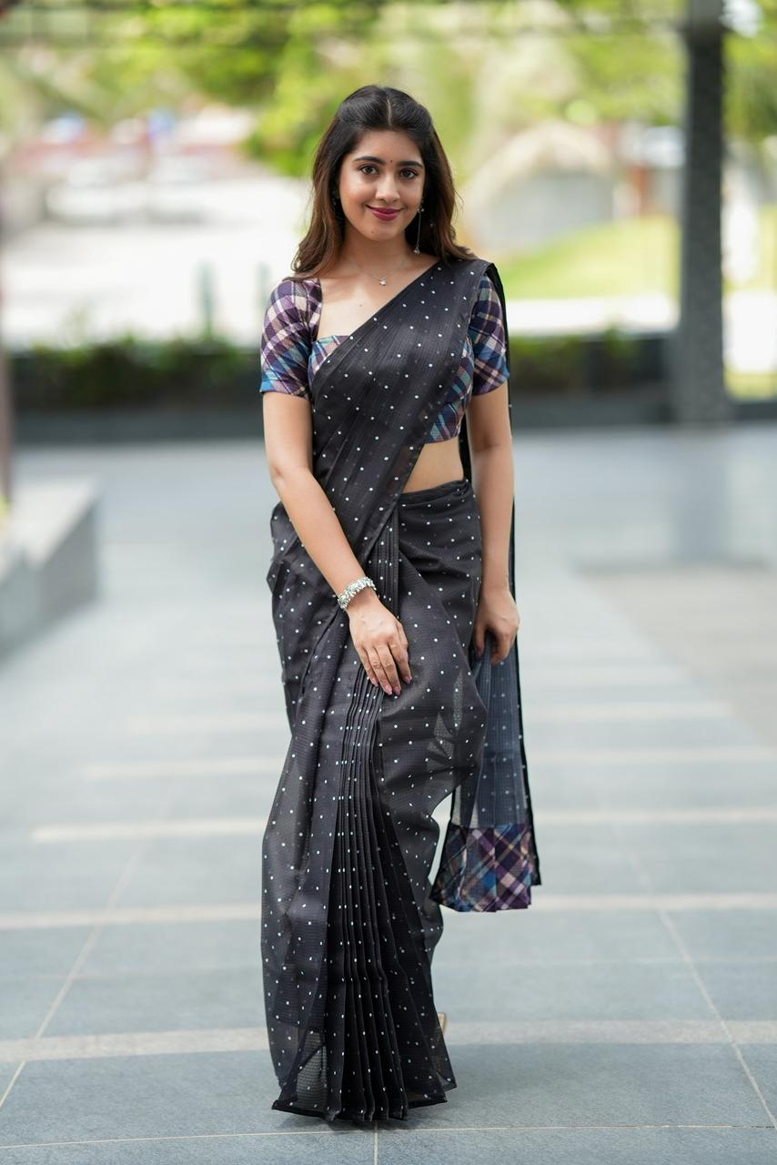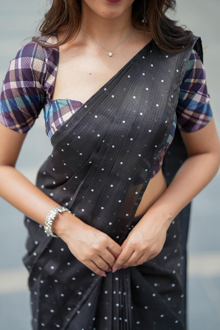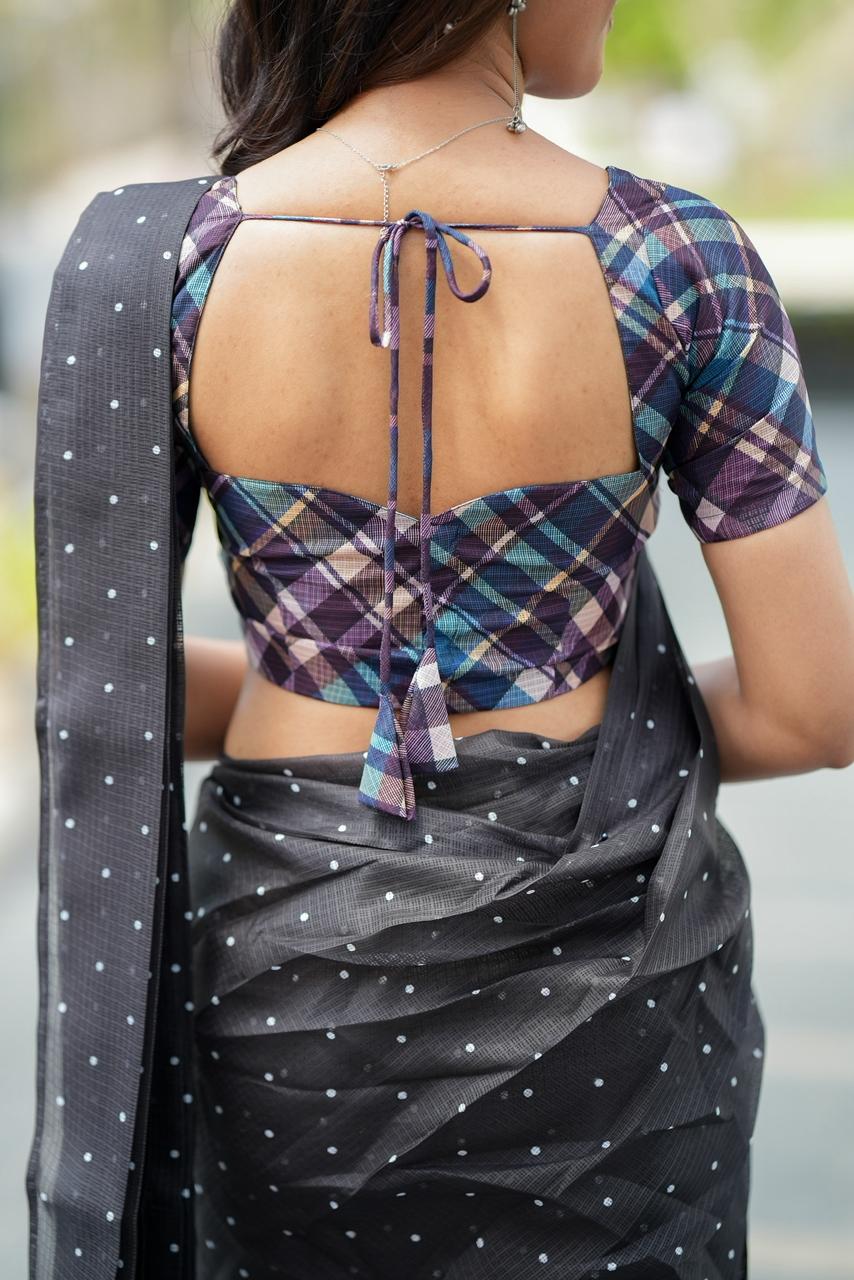 The blouse brings in a striking contrast with its vibrant checkered design in rich tones of teal, navy, wine, and muted beige. The structured silhouette and sharp lines add a fashion-forward attitude, perfectly balancing the softness of the dotted saree.