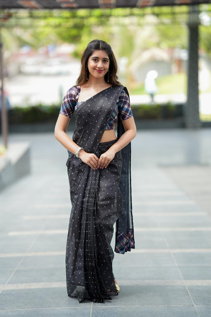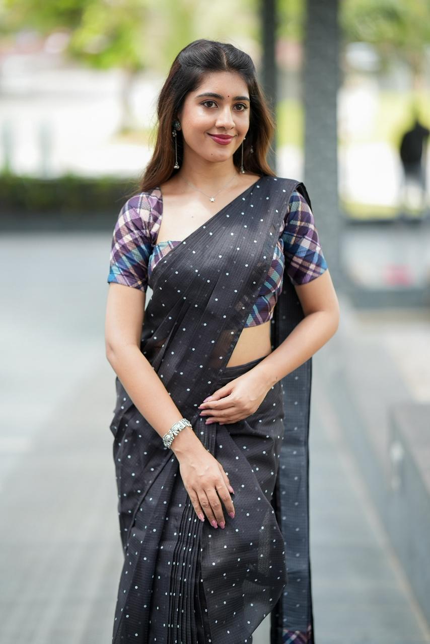 Playful yet powerfully chic, Syndra Polka Luxe is a bold expression of modern elegance with a Gen-Z edge. The saree features a deep noir-black drape adorned with delicate polka dots, creating a timeless pattern reimagined with a sleek, contemporary finish.