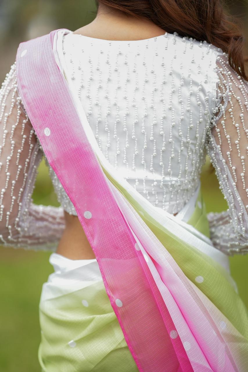 Ethereal, elegant, and effortlessly captivating, Tivya Pearl Luxe is the definition of soft glamour with a modern touch. The saree features a delicate blush-pink-Olive-White Ombre drape with subtle polka accents, creating a dreamy and minimal aesthetic that feels fresh and feminine.