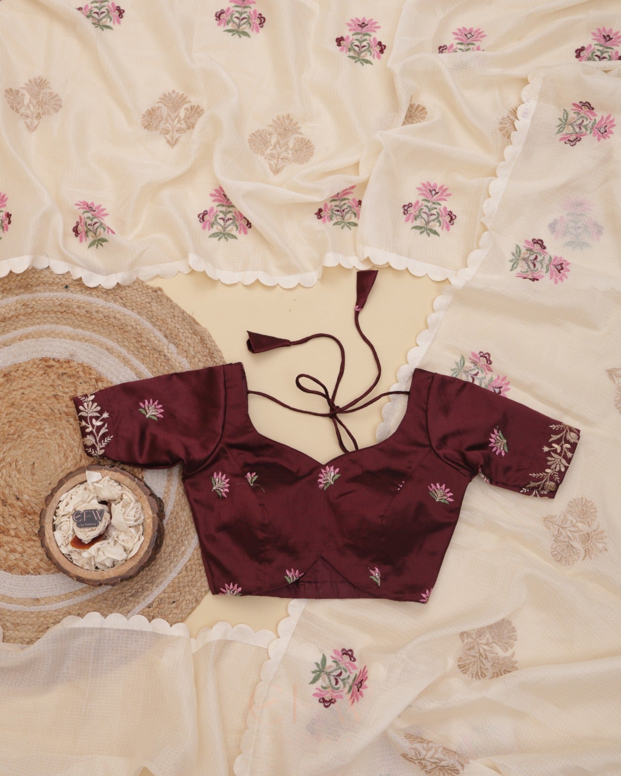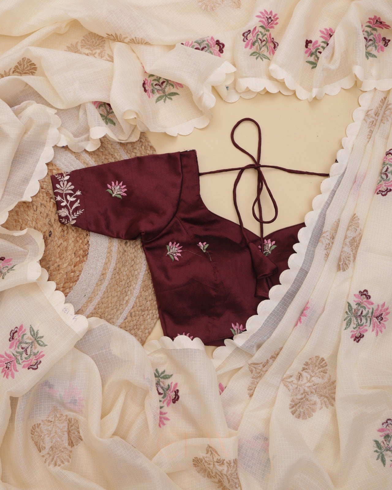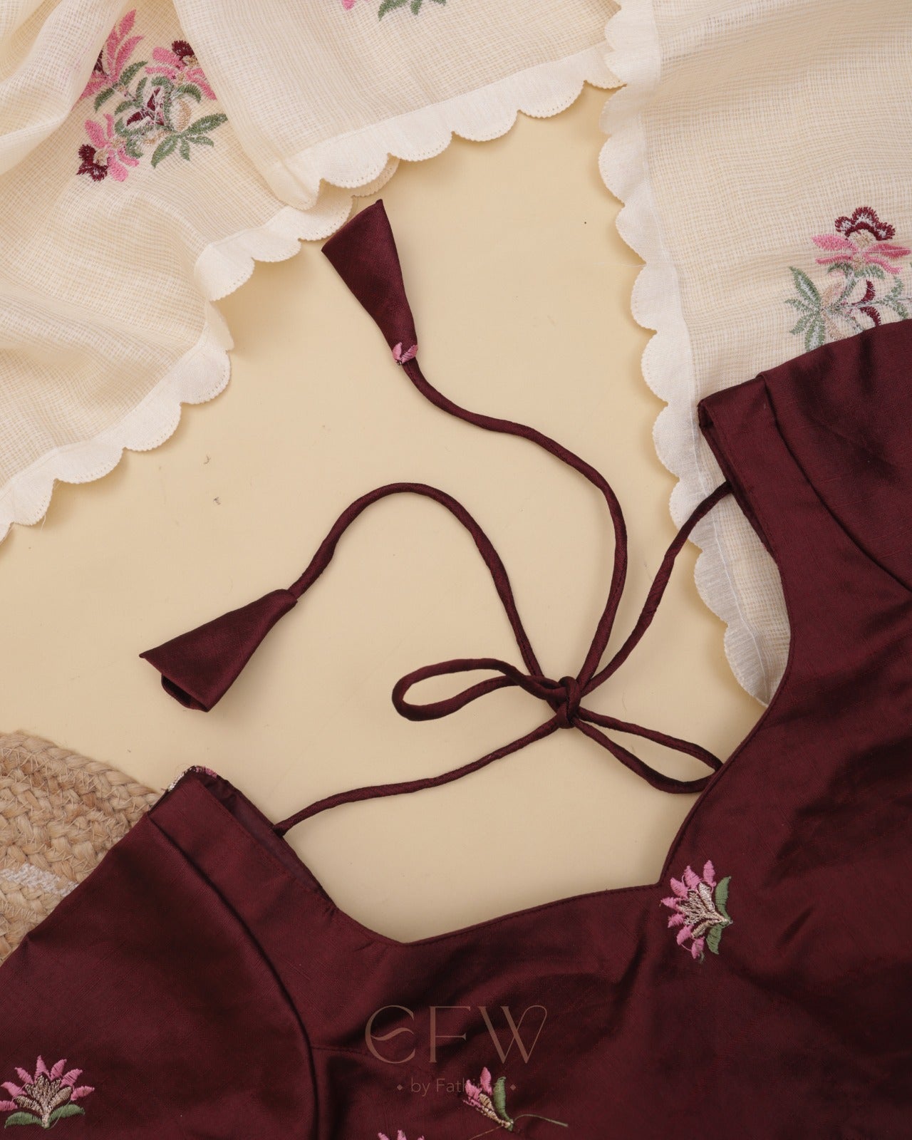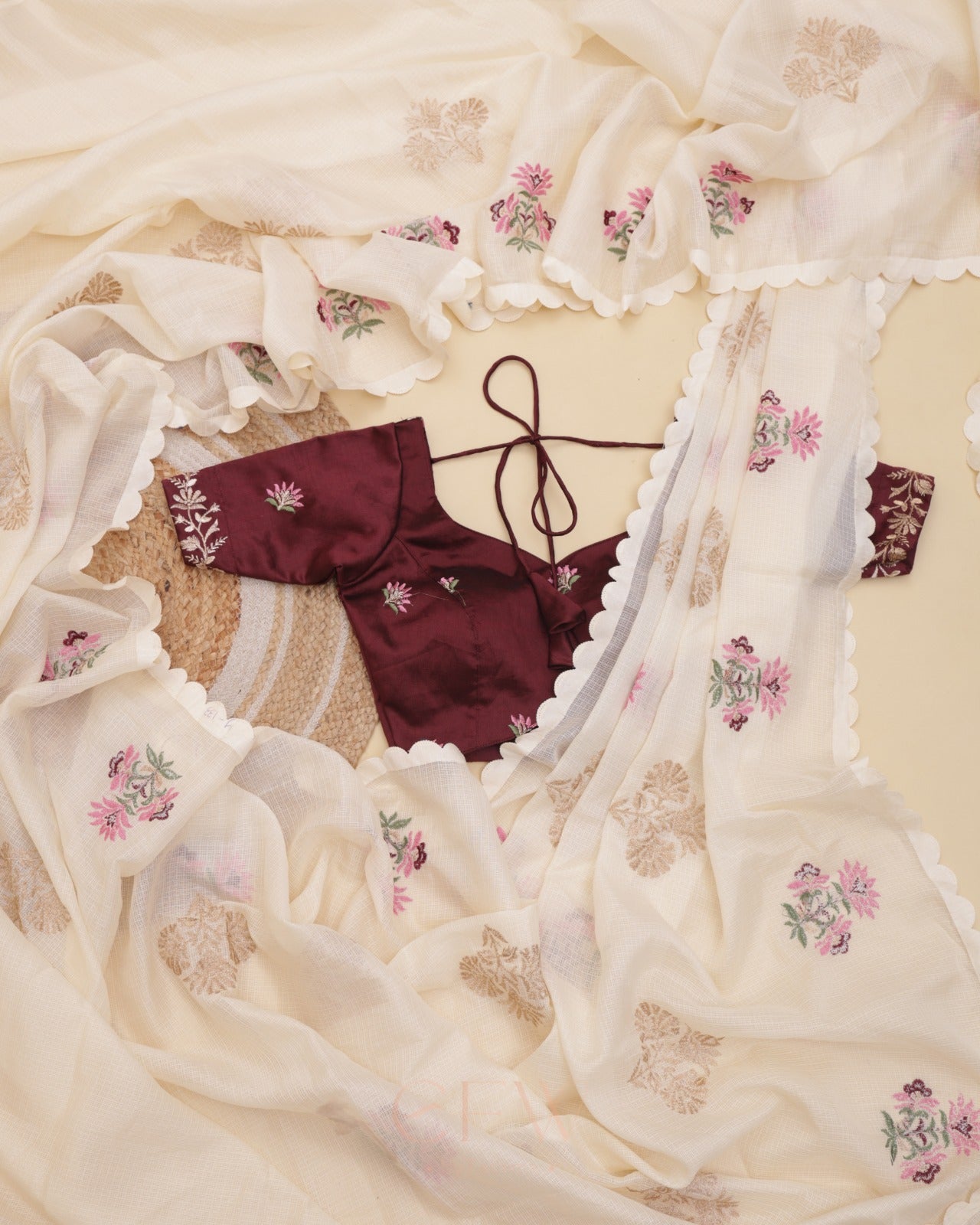 A Maroon Muse & Ivory Whispers Some days call for softness — in your words, your mood, and your drape. Soft, breathable ivory Kota saree with floral embroidery — paired with our maroon embroidered blouse featuring statement sleeves and delicate tassels. This wasn’t just an outfit. It was poetry stitched in silk and finished with love. Only very limited pieces — and we mean it this time