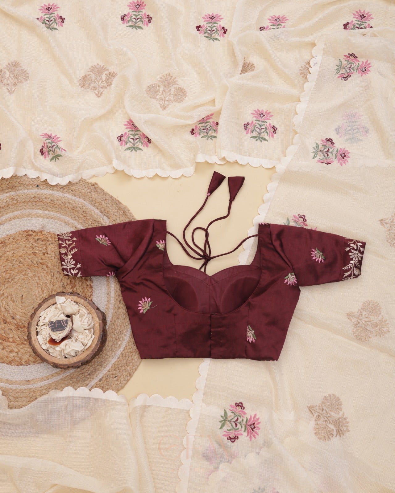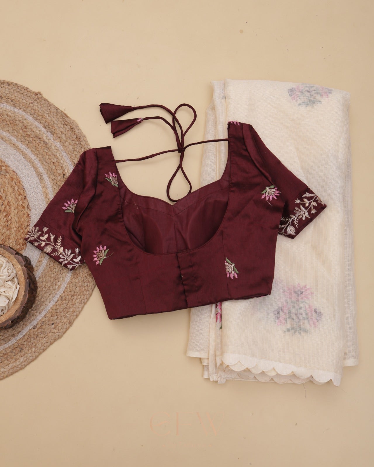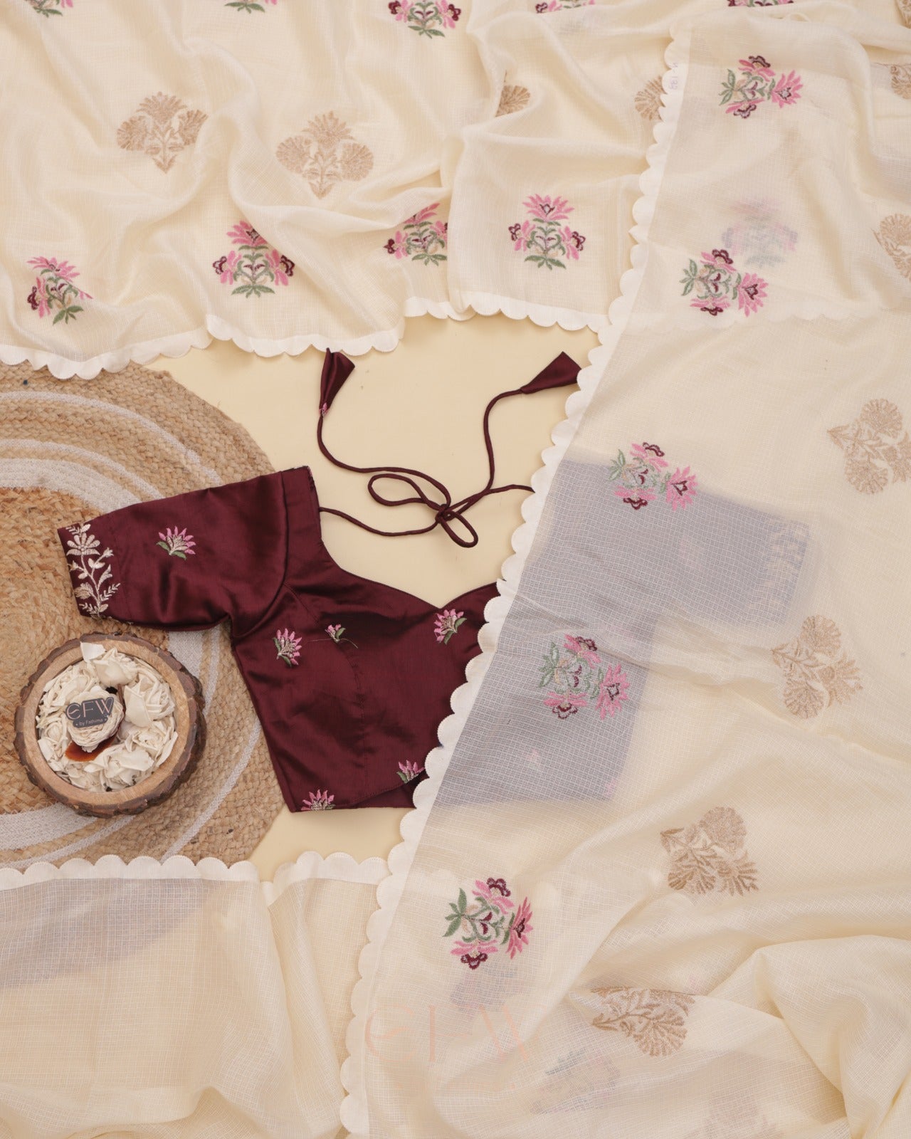 A Maroon Muse & Ivory Whispers Some days call for softness — in your words, your mood, and your drape. Soft, breathable ivory Kota saree with floral embroidery — paired with our maroon embroidered blouse featuring statement sleeves and delicate tassels. This wasn’t just an outfit. It was poetry stitched in silk and finished with love. Only very limited pieces — and we mean it this time