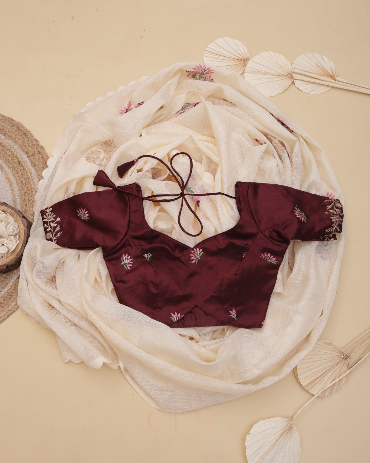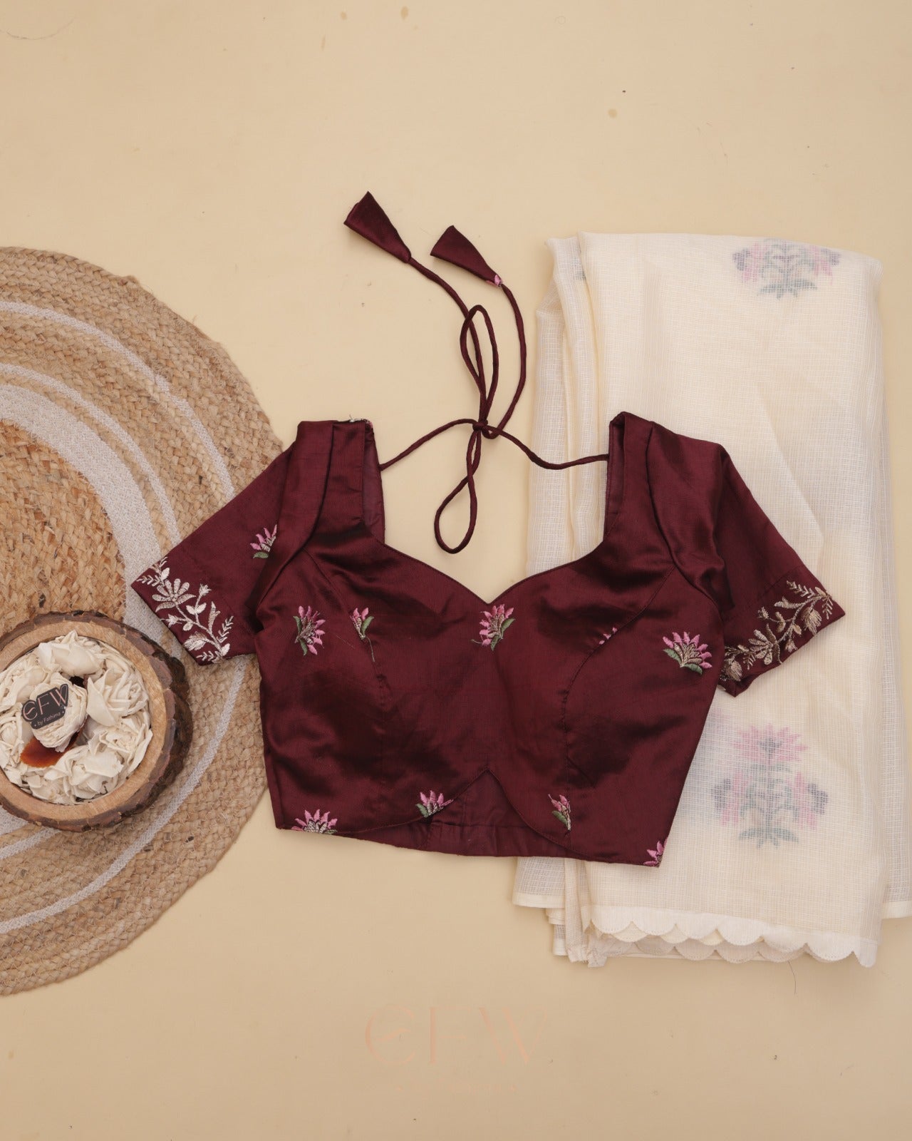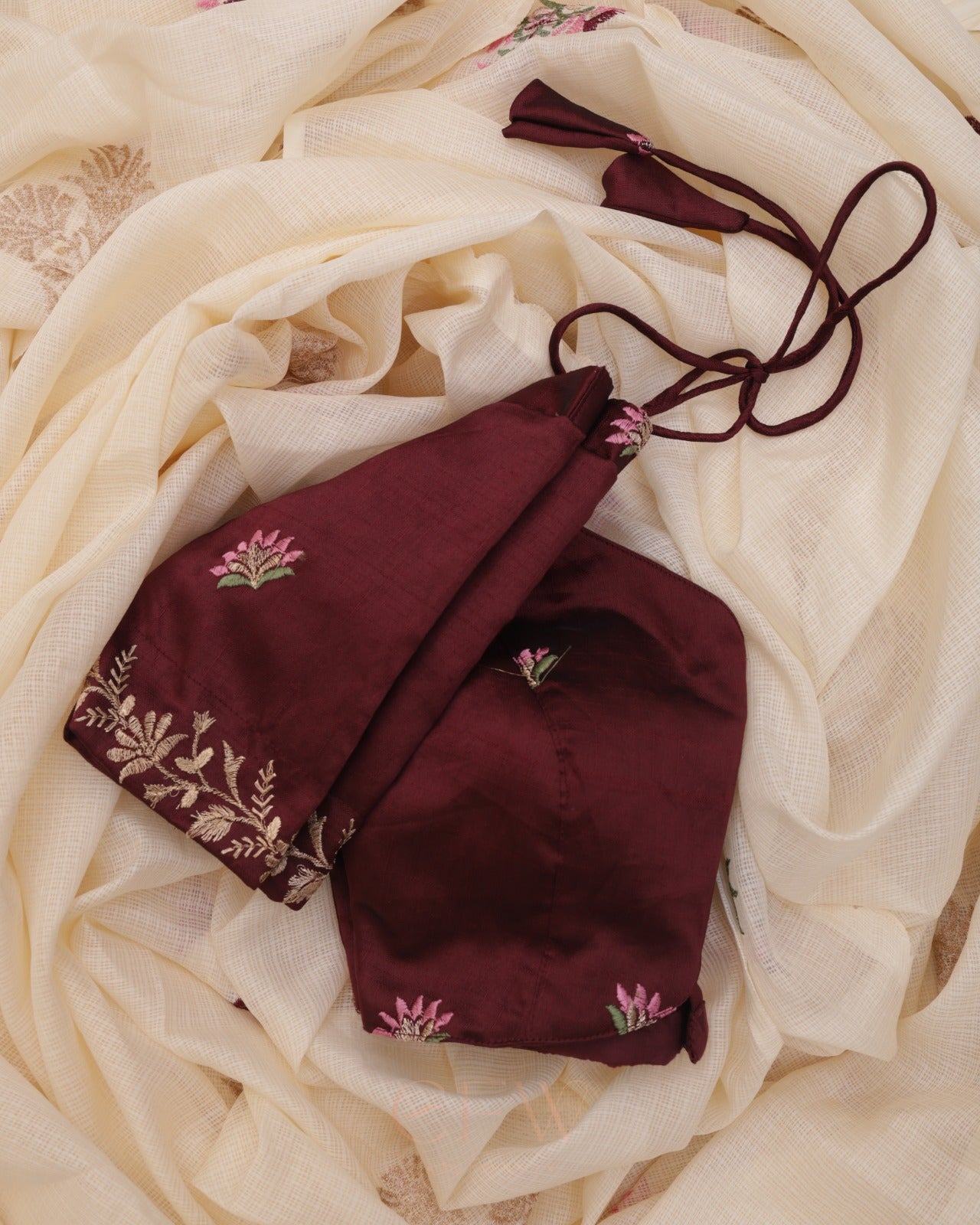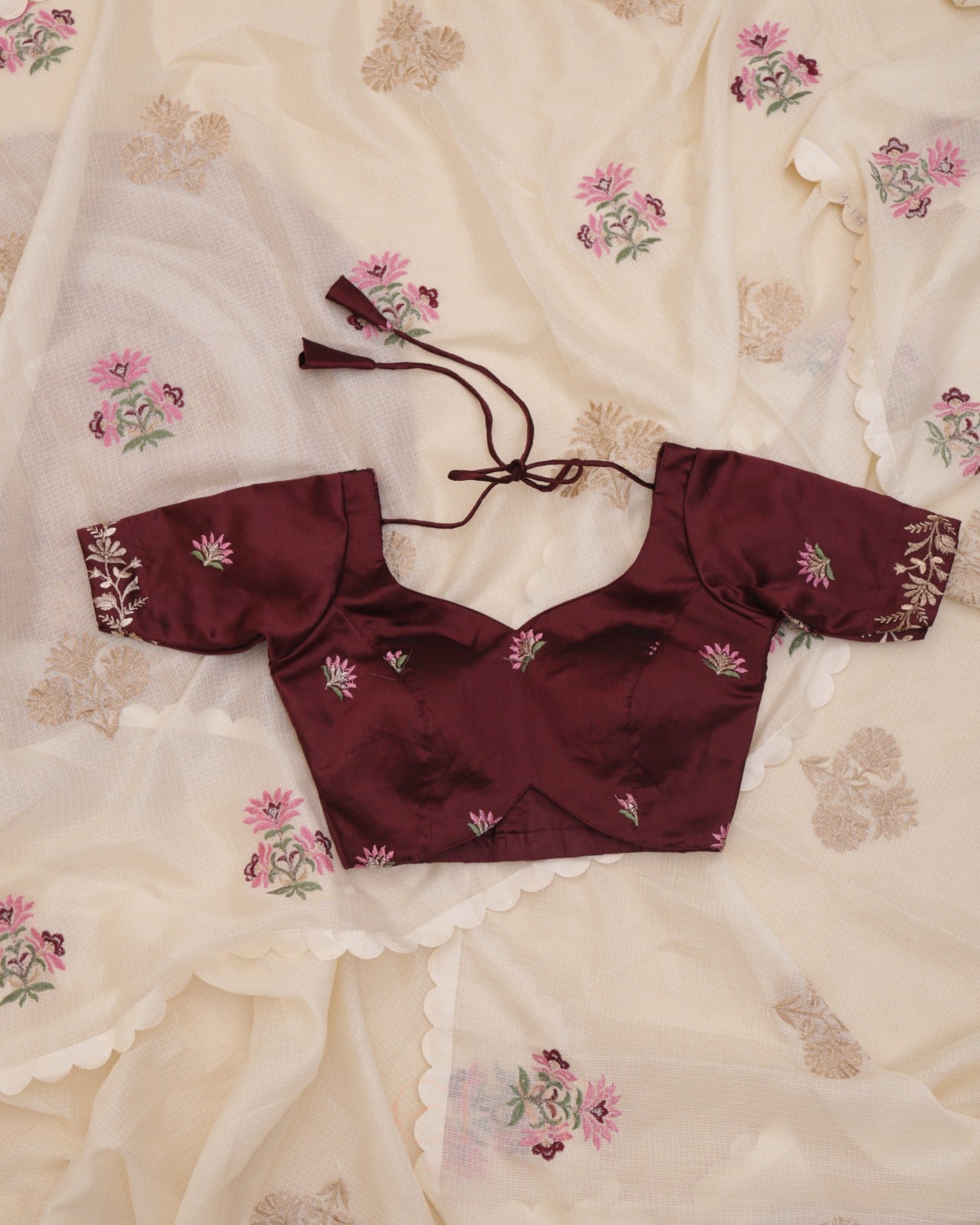 A Maroon Muse & Ivory Whispers Some days call for softness — in your words, your mood, and your drape. Soft, breathable ivory Kota saree with floral embroidery — paired with our maroon embroidered blouse featuring statement sleeves and delicate tassels. This wasn’t just an outfit. It was poetry stitched in silk and finished with love. Only very limited pieces — and we mean it this time