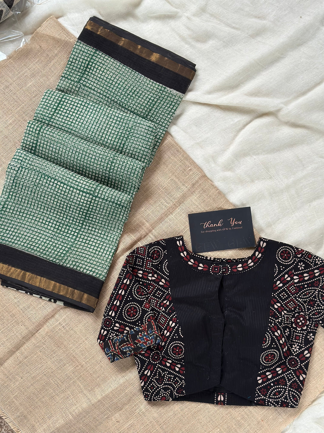 The attached blouse in the image is available separately for purchase from the link below. The saree includes an unstitched blouse.