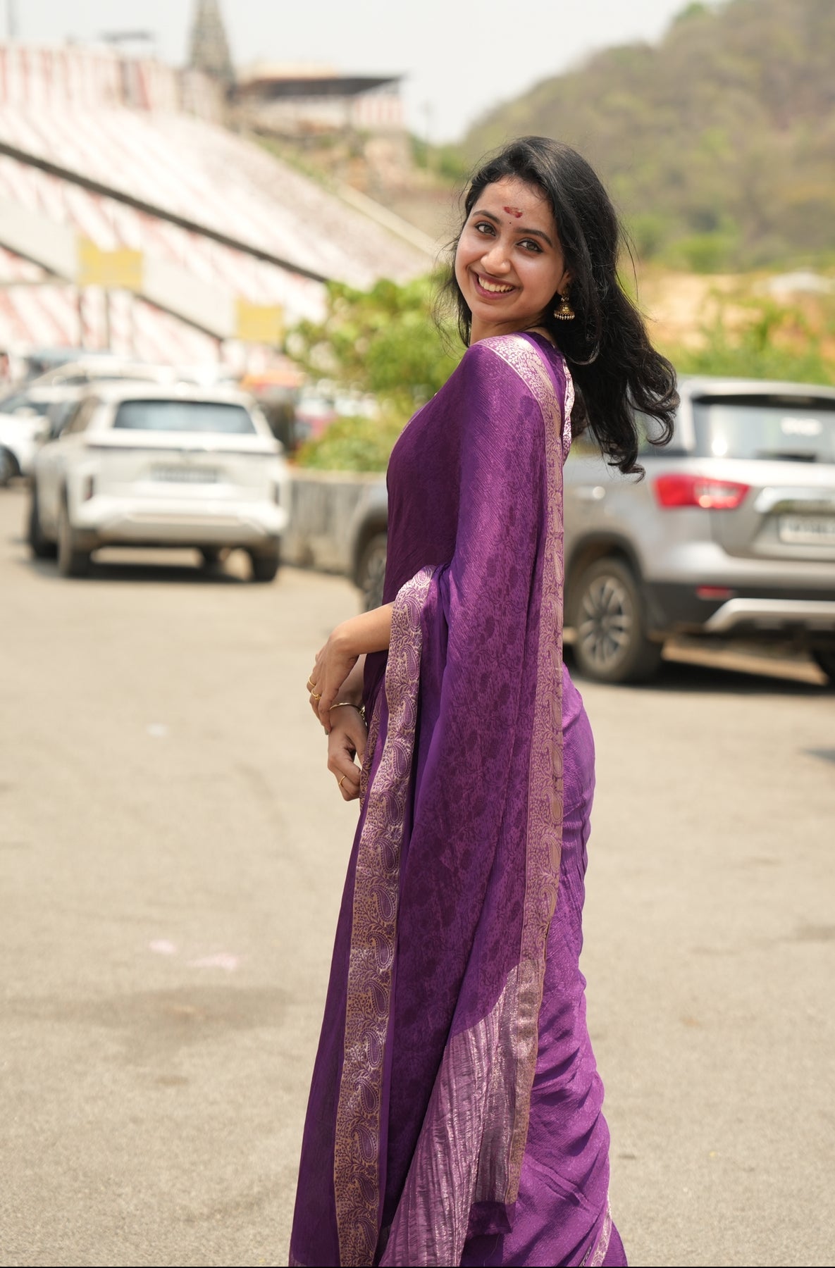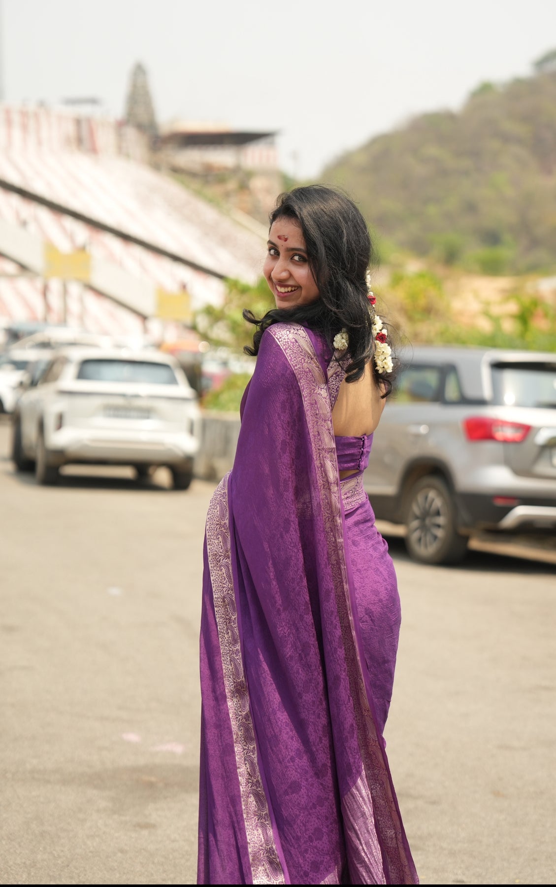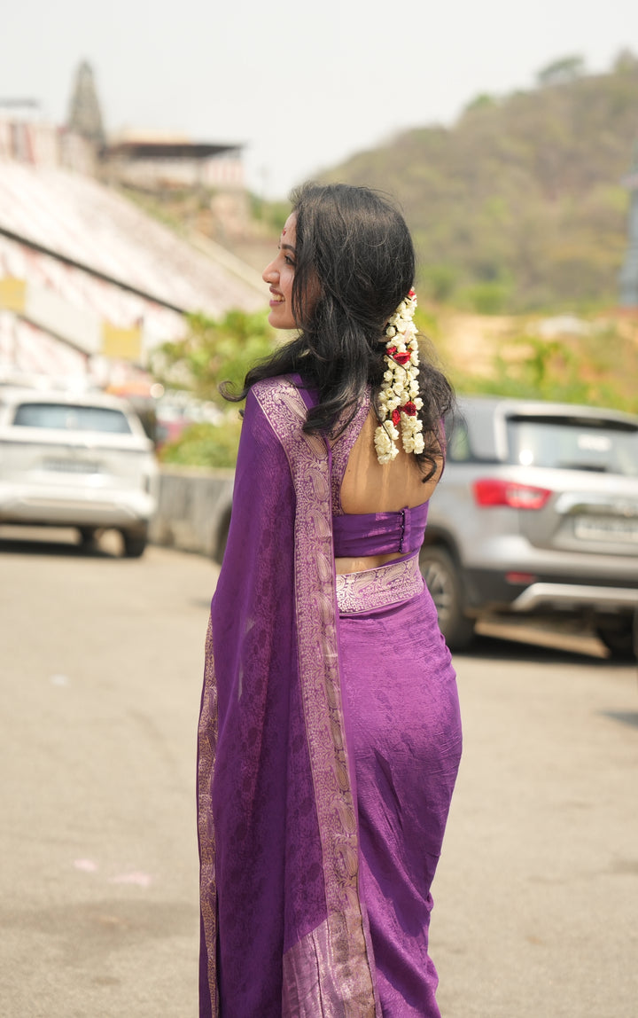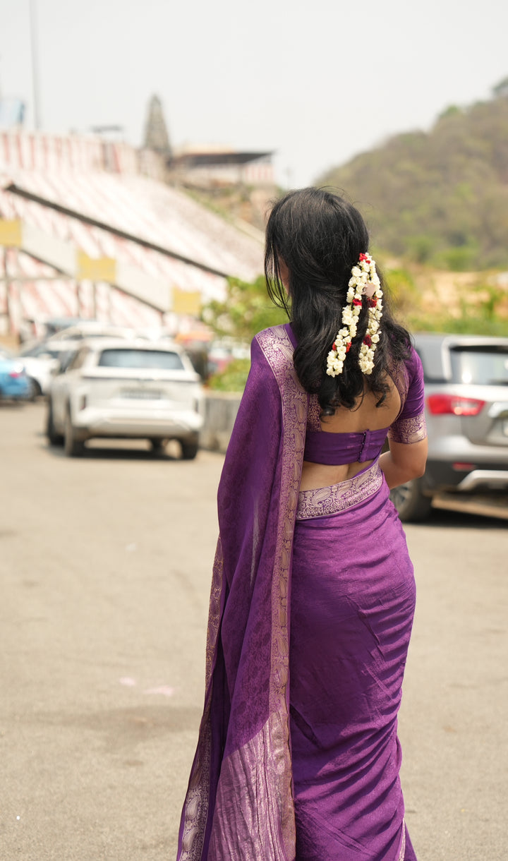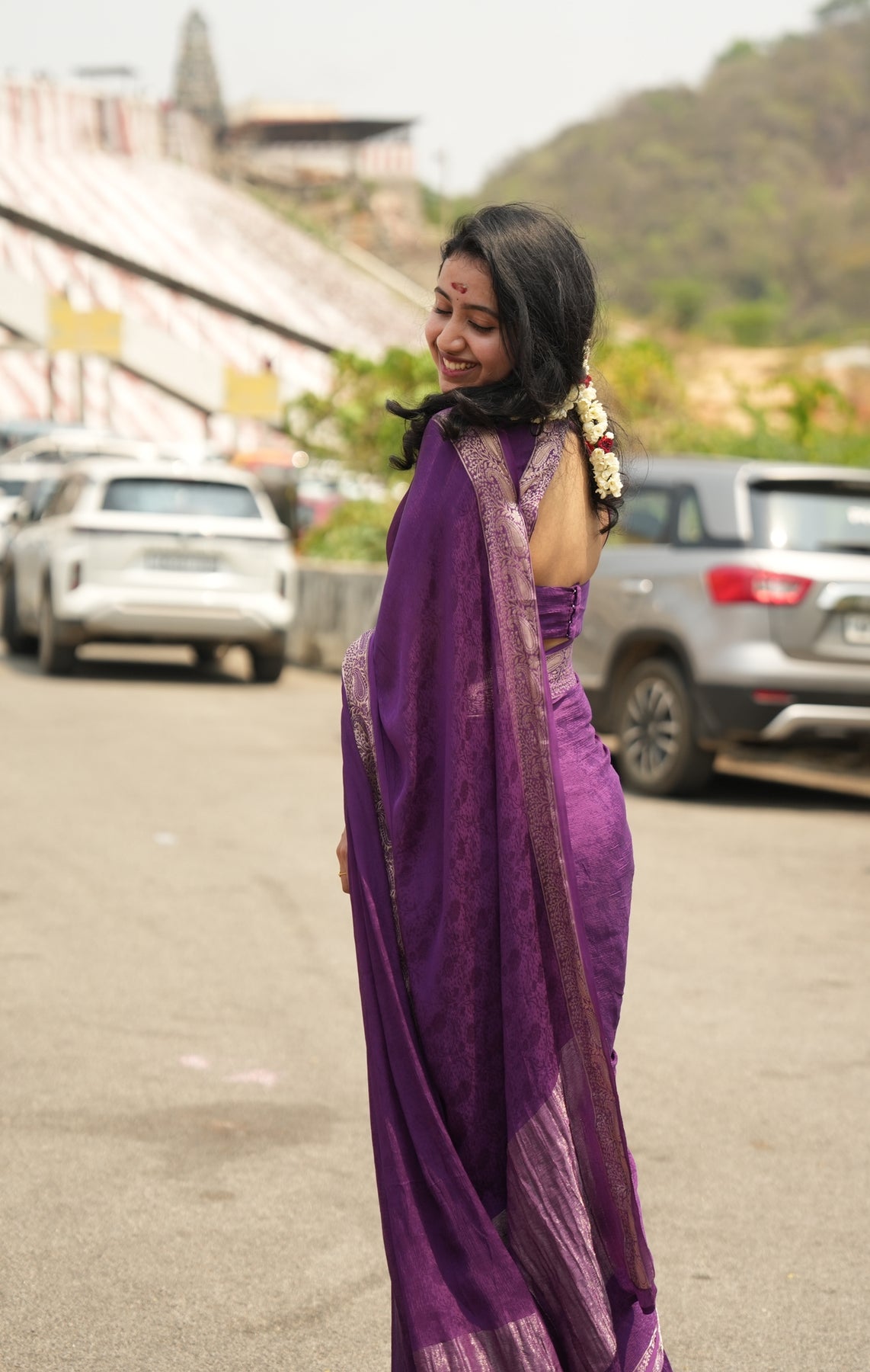 Warning: Prepare for endless stares and compliments in this dreamy dark purple saree! Soft chinon silk that feels like a whisper and drapes like a dream, complete with a gorgeous border and a Banarasi silk blouse for that extra touch of elegance.