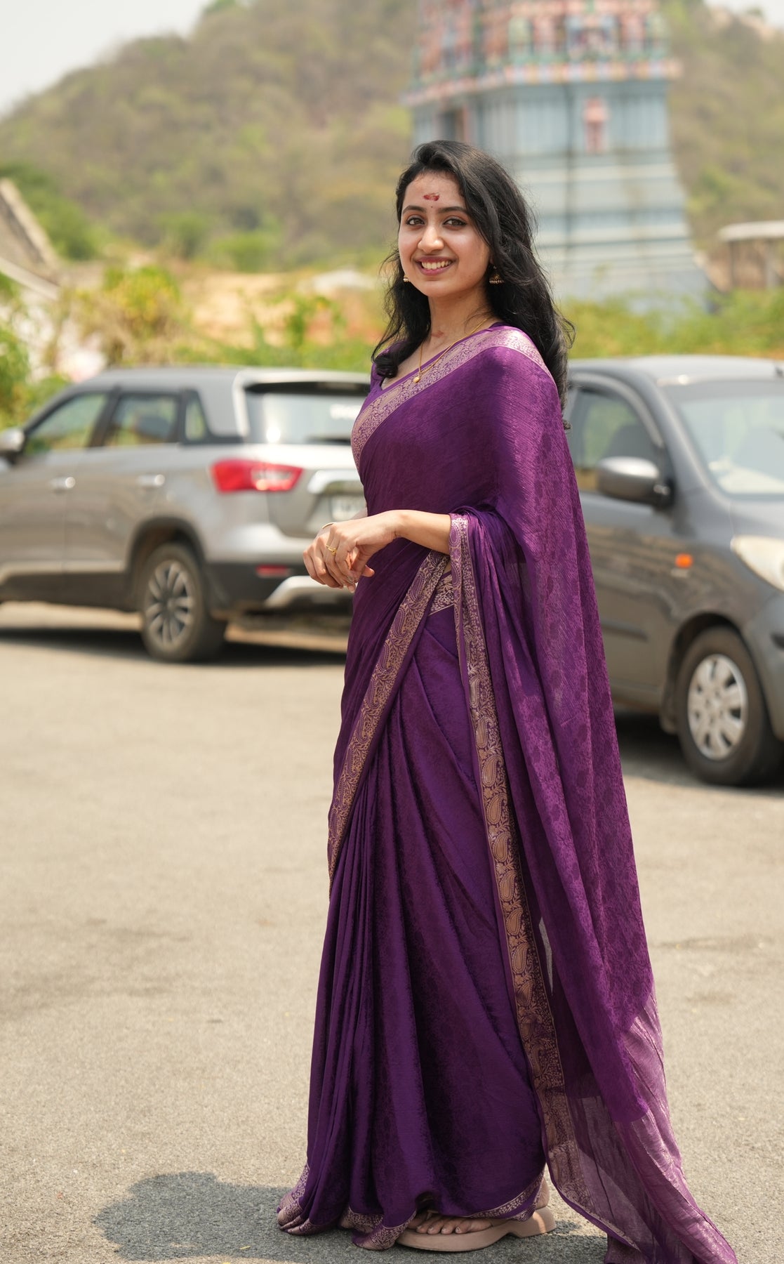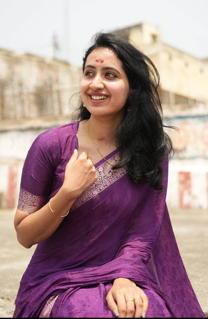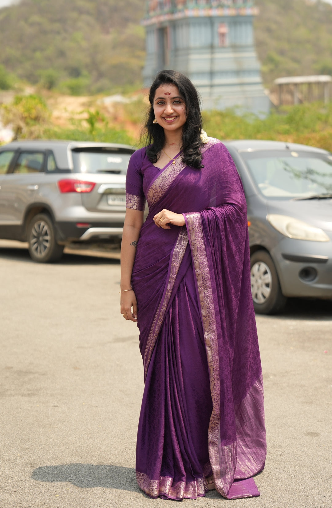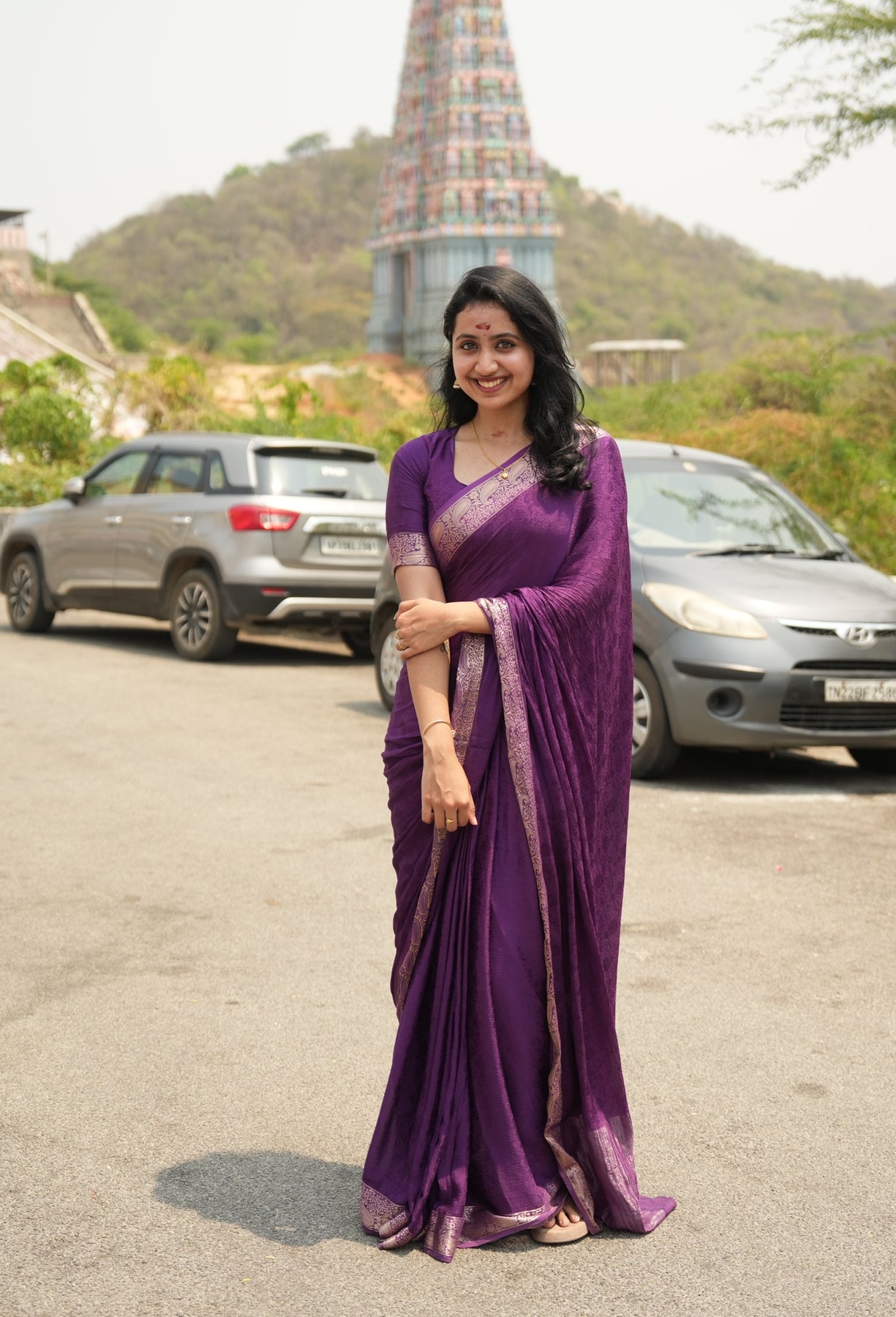 Warning: Prepare for endless stares and compliments in this dreamy dark purple saree! Soft chinon silk that feels like a whisper and drapes like a dream, complete with a gorgeous border and a Banarasi silk blouse for that extra touch of elegance.