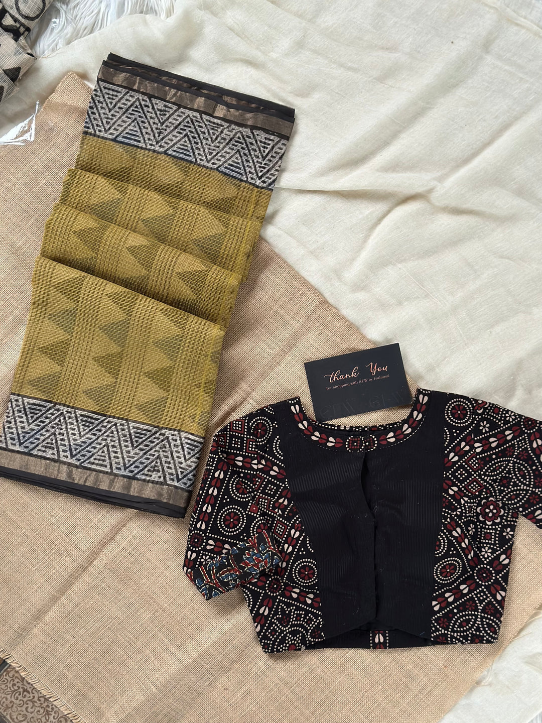 A beautiful soft cozy pure kota doriya saree with beautiful handblock prints with golden zari border