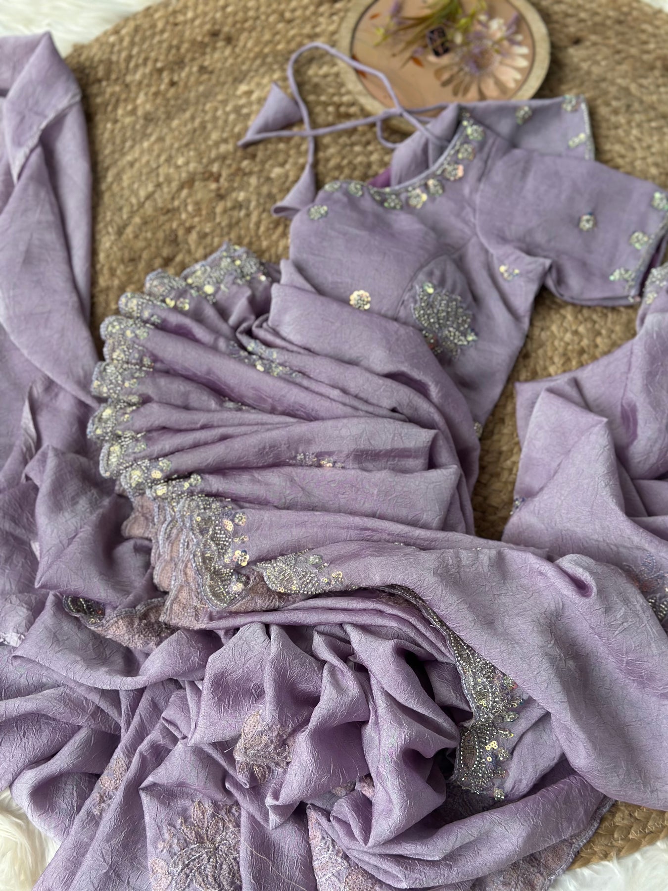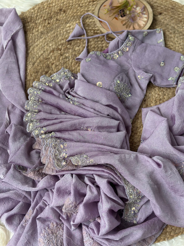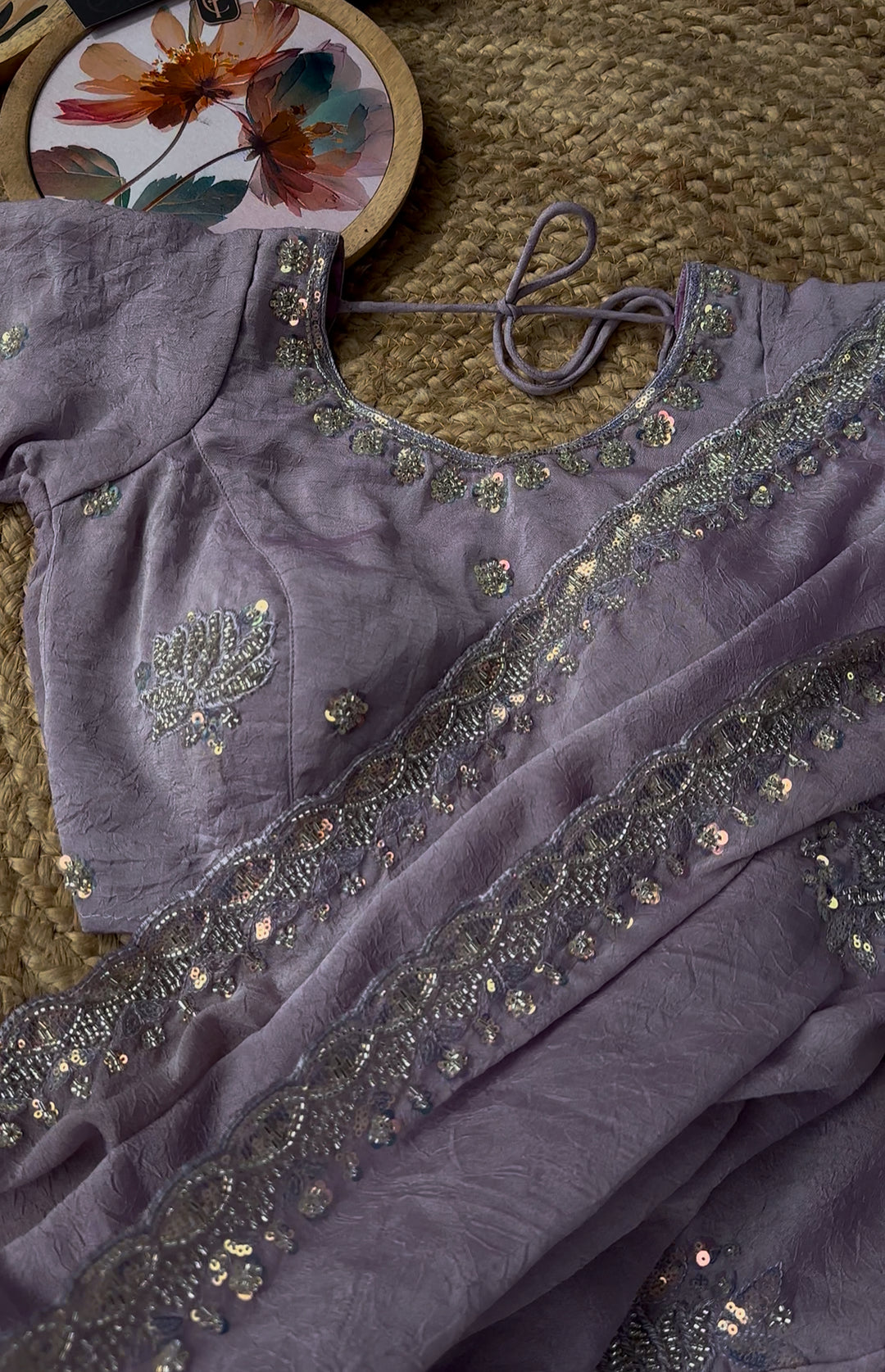 Premium beaded wirk sarees are the real deal! Just look at this beauty—a dreamy lilac shade adorned with stunning sequins and transparent beaded work that screams elegance! ✨ And that customized blouse? Simple, chic, and oh-so-classy!