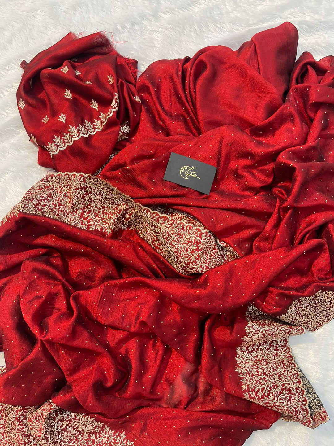Drape yourself in regal allure with our 'Crimson charm Elegance Saree.' This exquisite piece, crafted in luxurious silk, boasts a red maroon shade adorned with intricate golden embroidery and delicate stone work along the border. A timeless ensemble perfect for festive occasions, it captures the essence of traditional elegance. Embrace the richness of this saree, a true celebration of grace and sophistication