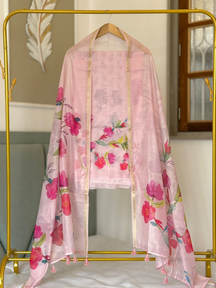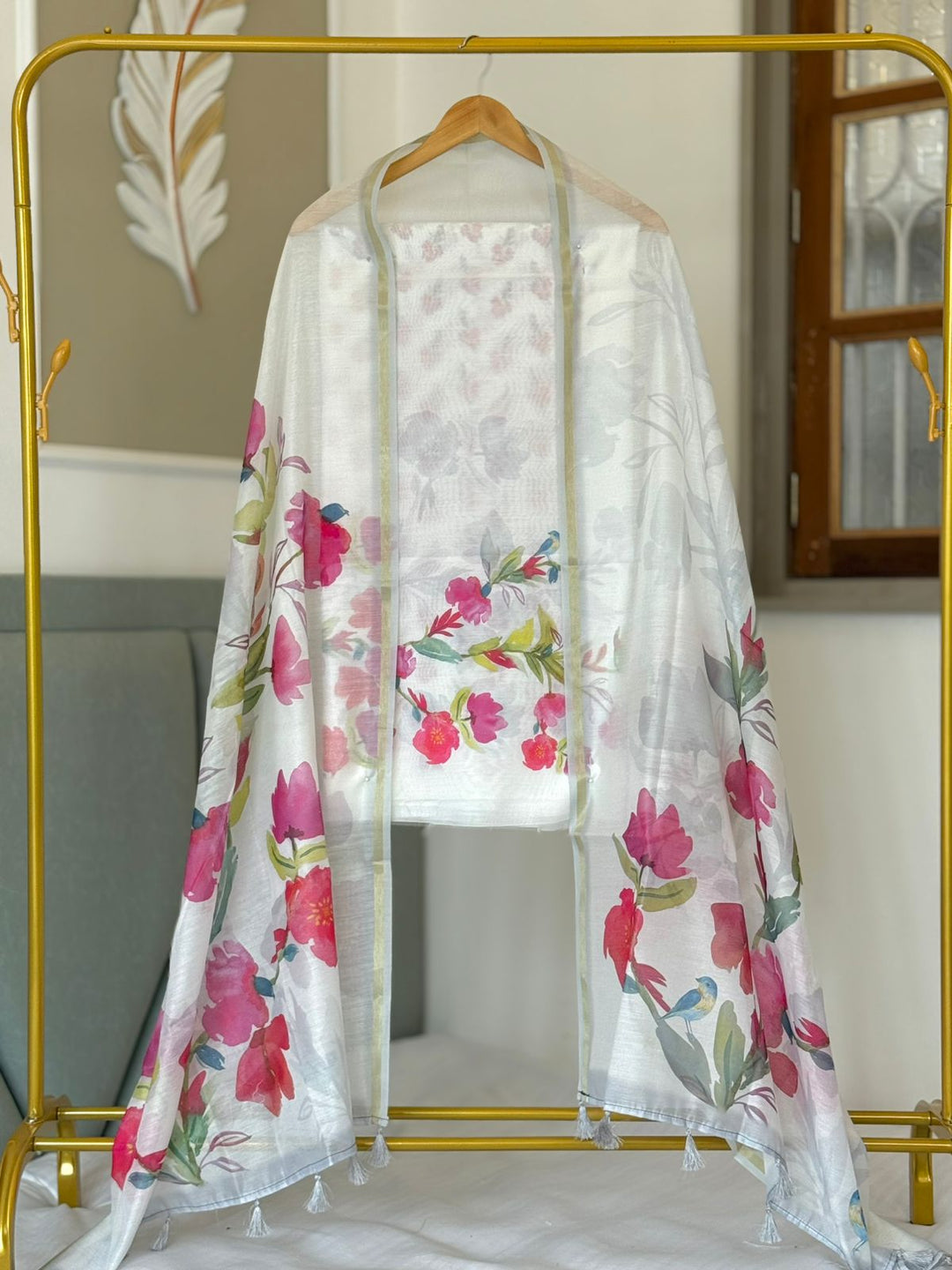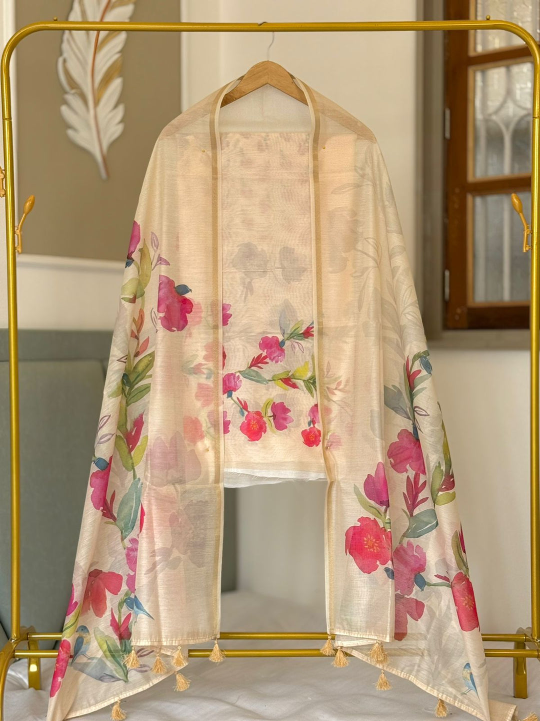 Discover the exclusive BANARASI Collection featuring a chanderi floral digital print top, complemented by a matching chanderi floral print dupatta. This set is completed with a plain cotton silk bottom, blending traditional elegance with contemporary style.