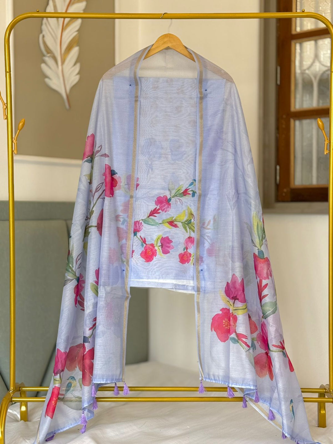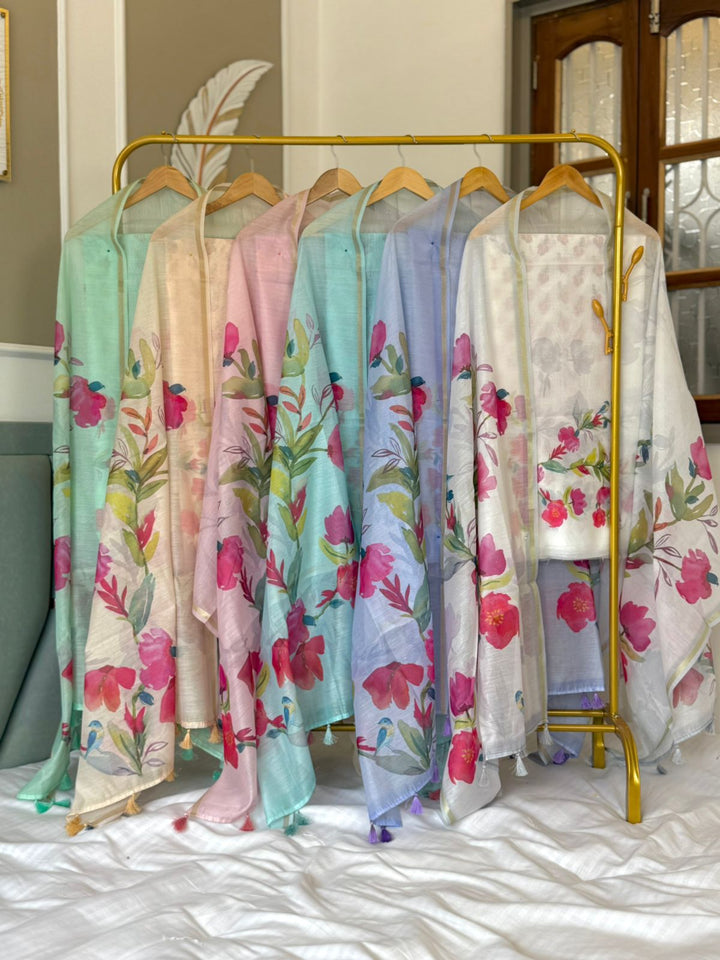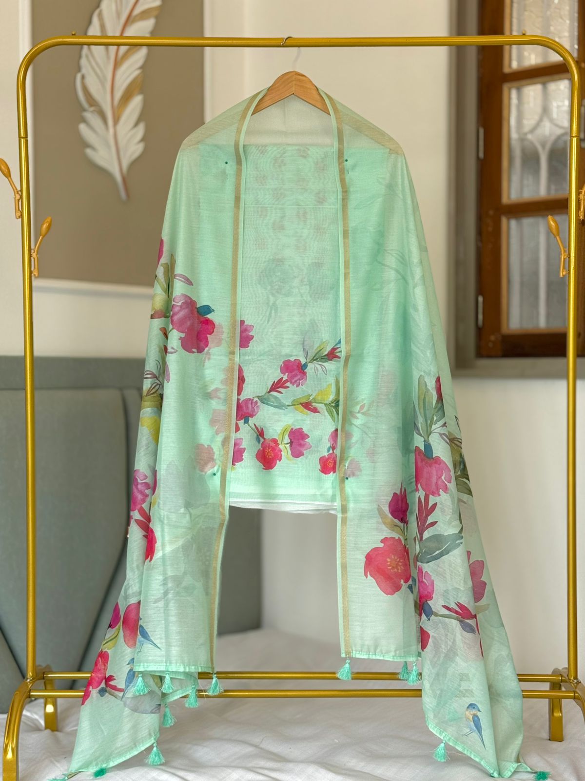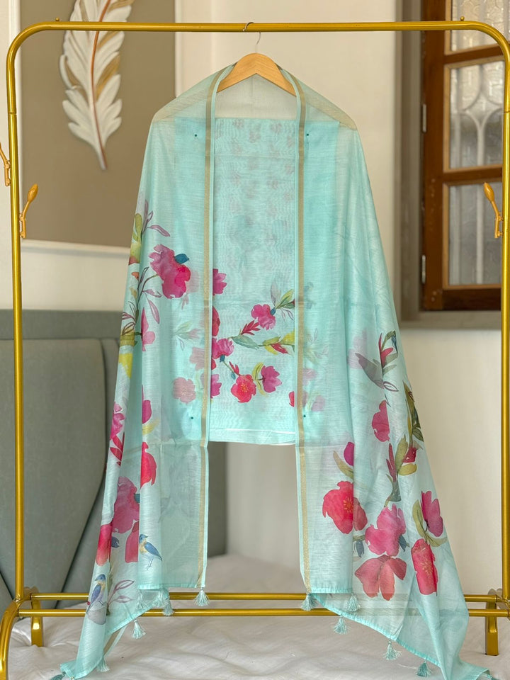 Discover the exclusive BANARASI Collection featuring a chanderi floral digital print top, complemented by a matching chanderi floral print dupatta. This set is completed with a plain cotton silk bottom, blending traditional elegance with contemporary style.
