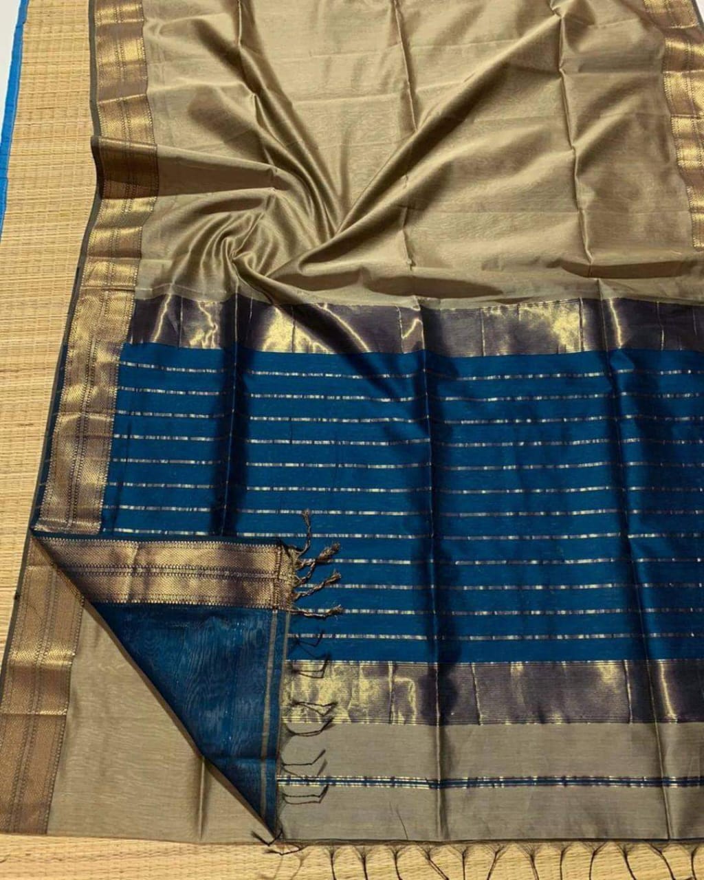 Indulge in the timeless, sophisticated beauty of ILAKYA. Crafted with pure maheshwari handloom silk, this stunning saree features an alluring golden double border and an elegant pallu. Available in a stunning color, it also comes with a contrasting blouse. Elevate your style with this exquisite piece.