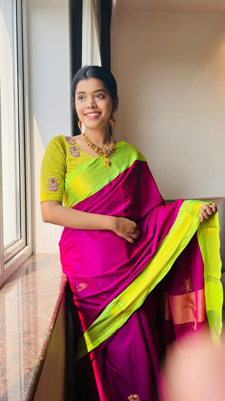 This exclusive rich cotton silk comes with a gold weaving border.