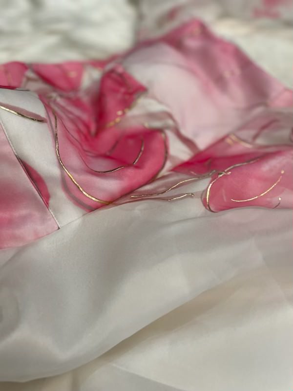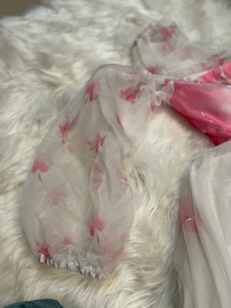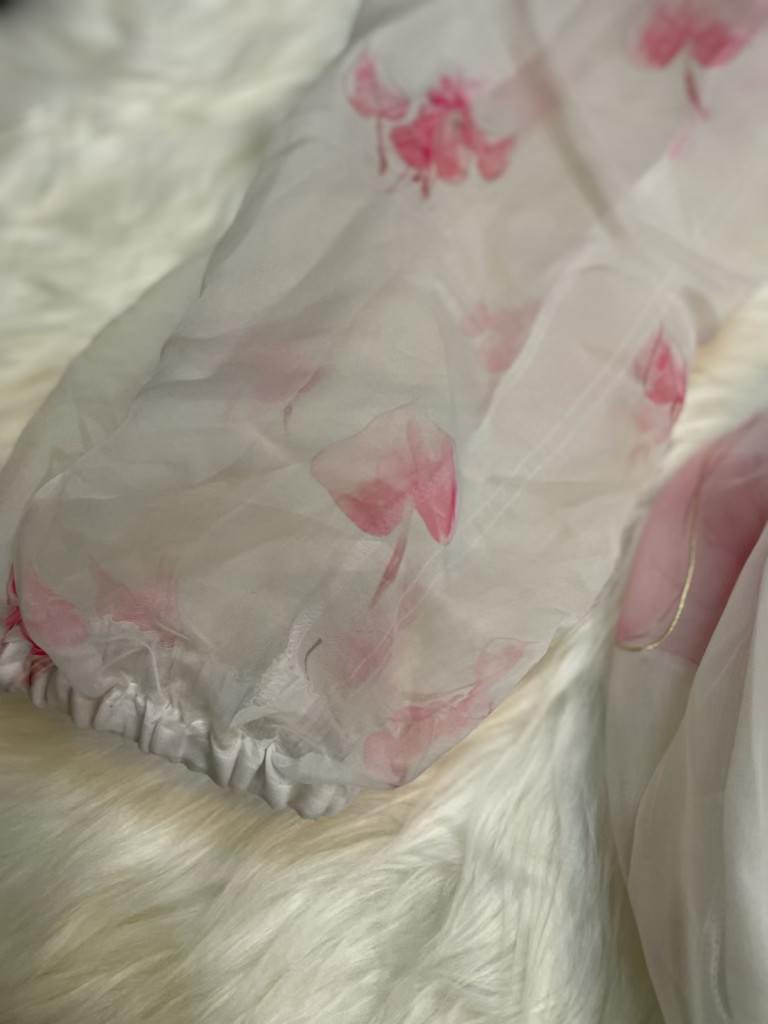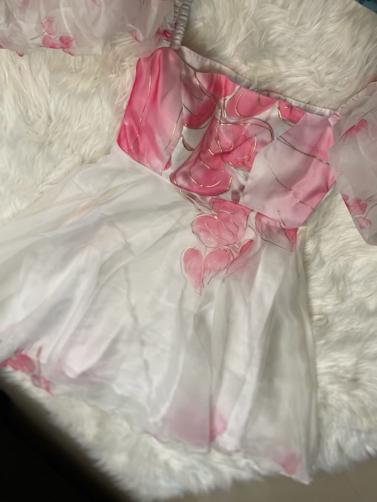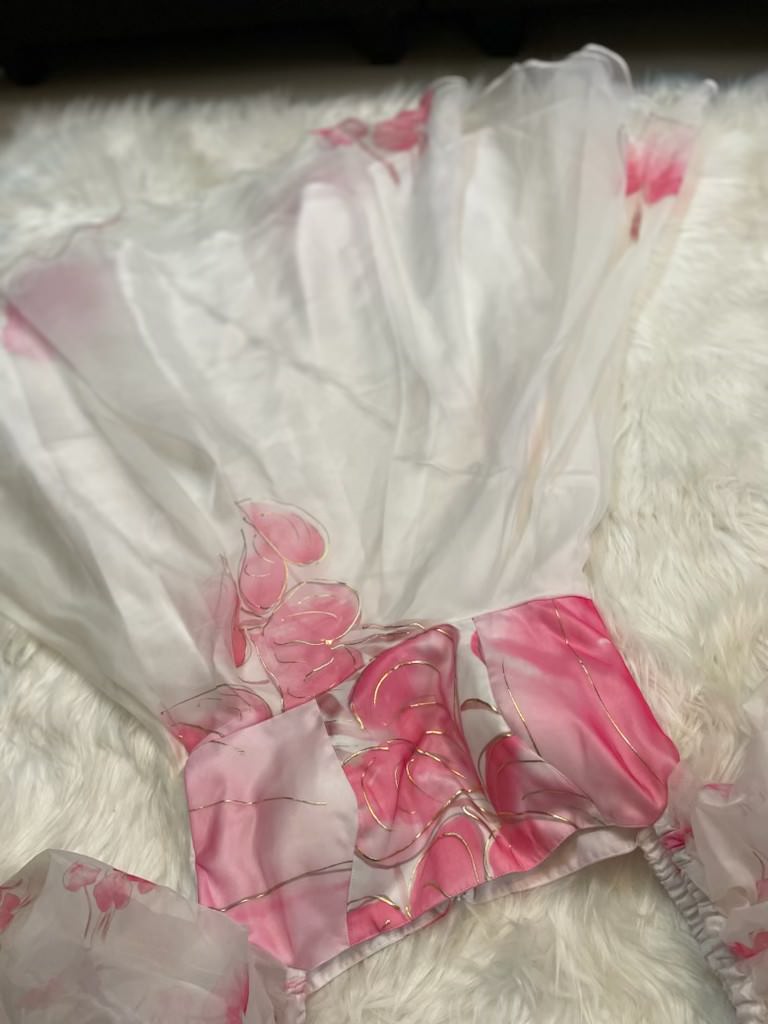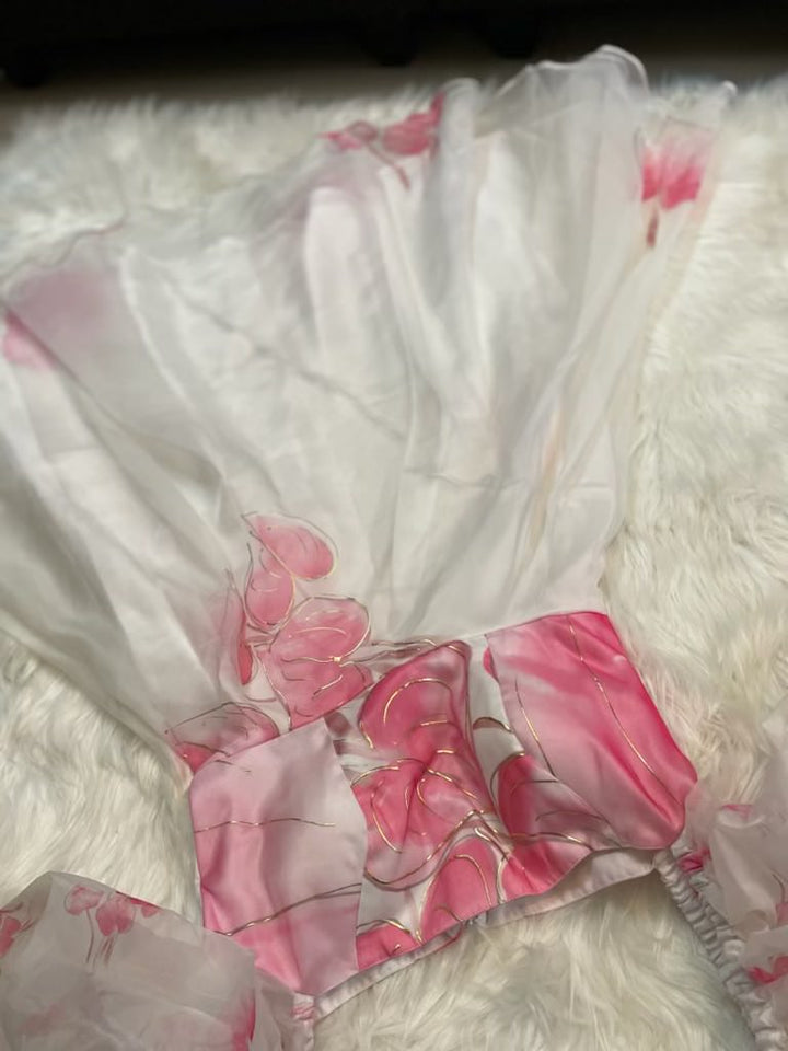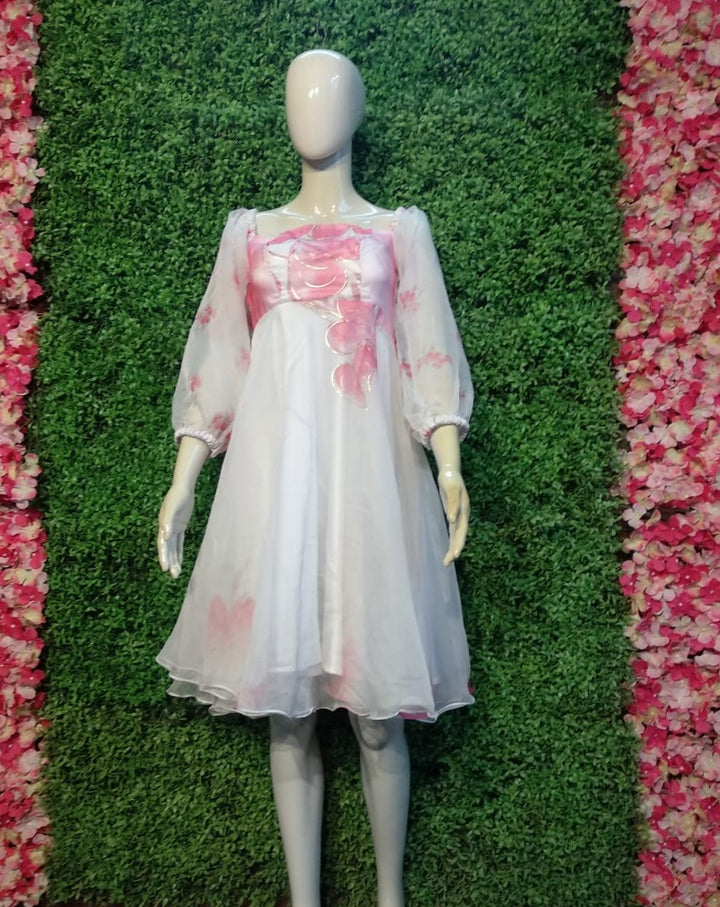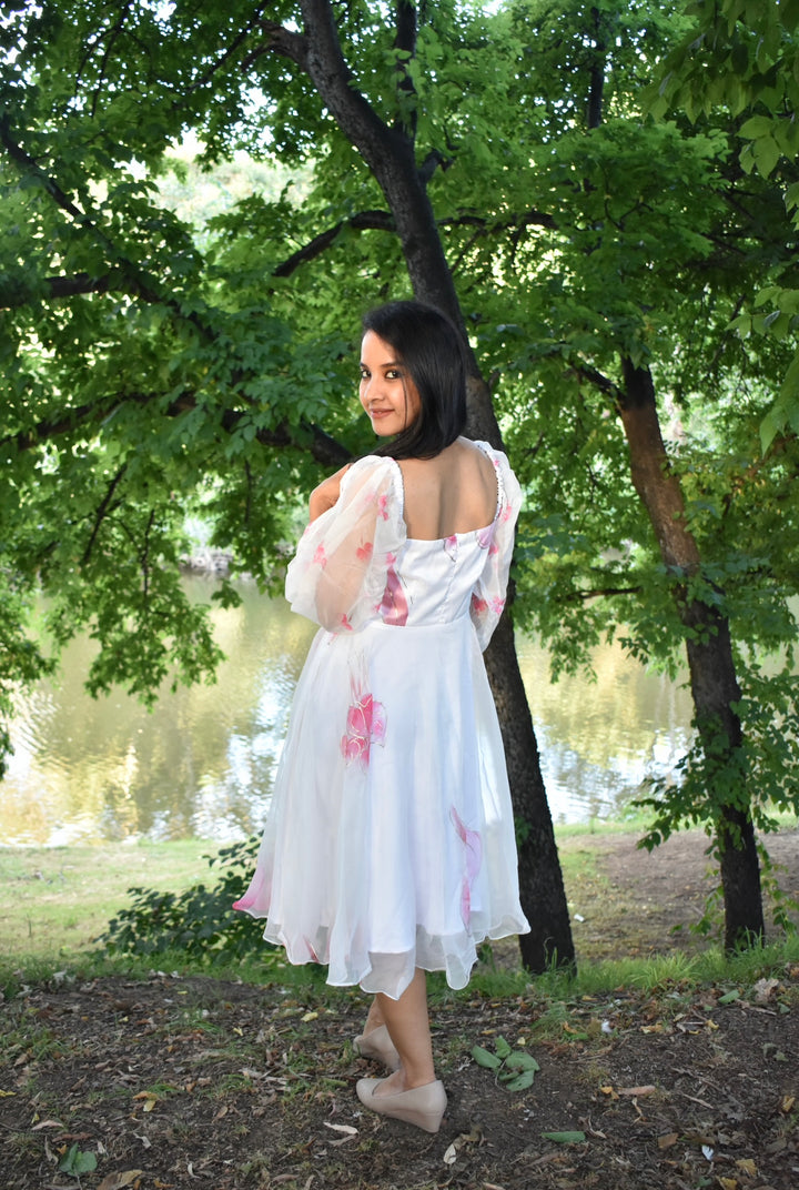 White floral print organza fit & flare dress with straight neckline and elasticated puff slevee, Above knee length in flared hem with satin lining.