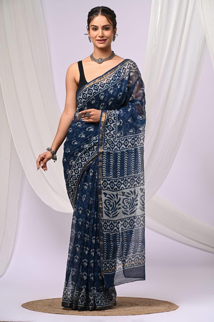 Crafted in pure, soft, breathable Kota Doriya fabric, this beauty features hand-block Bagru prints that speak tradition with a twist. Finished with an exquisite, vintage-inspired golden border — it’s the perfect blend of comfort, class, and culture.