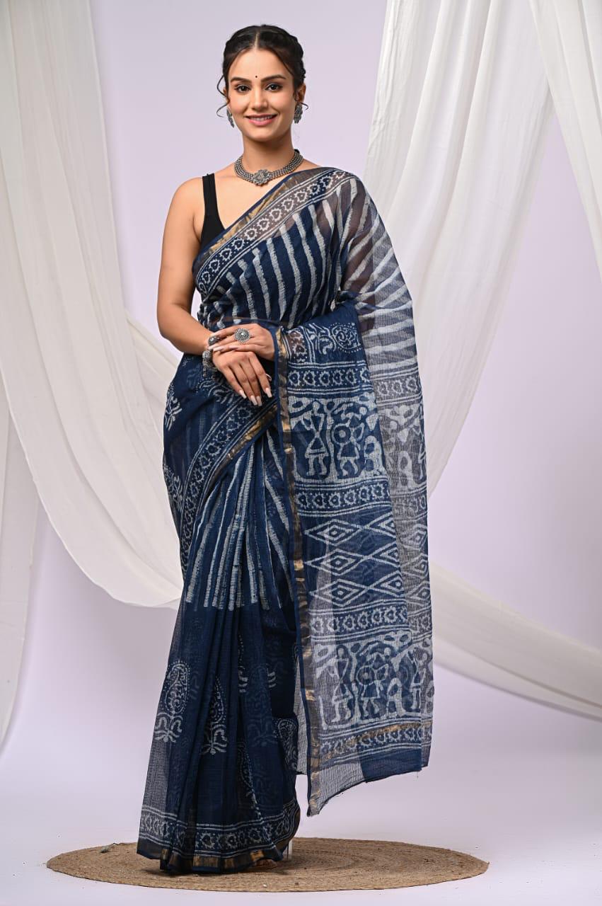 Crafted in pure, soft, breathable Kota Doriya fabric, this beauty features hand-block Bagru prints that speak tradition with a twist. Finished with an exquisite, vintage-inspired golden border — it’s the perfect blend of comfort, class, and culture.
