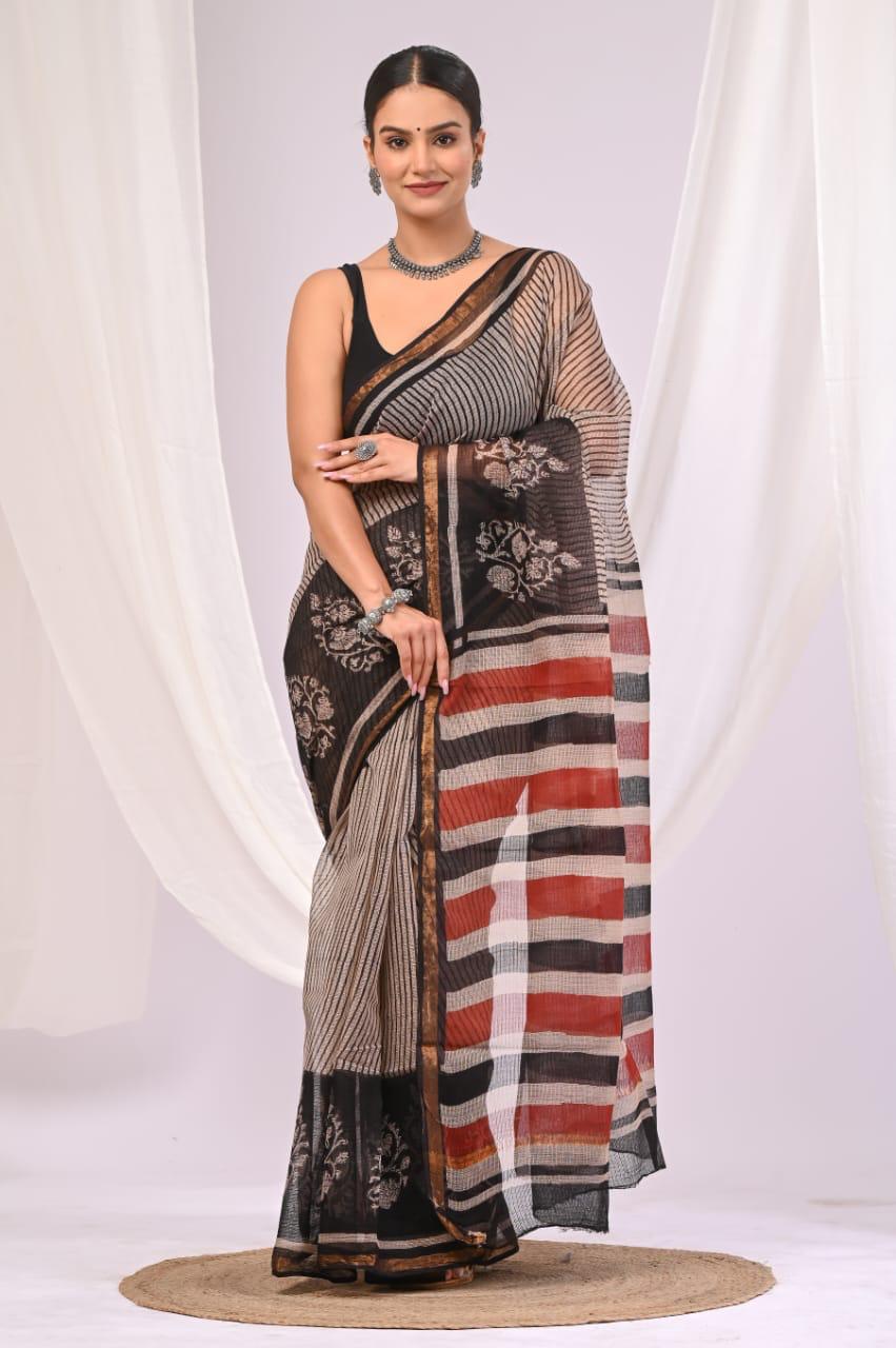 Crafted in pure, soft, breathable Kota Doriya fabric, this beauty features hand-block Bagru prints that speak tradition with a twist. Finished with an exquisite, vintage-inspired golden border — it’s the perfect blend of comfort, class, and culture.