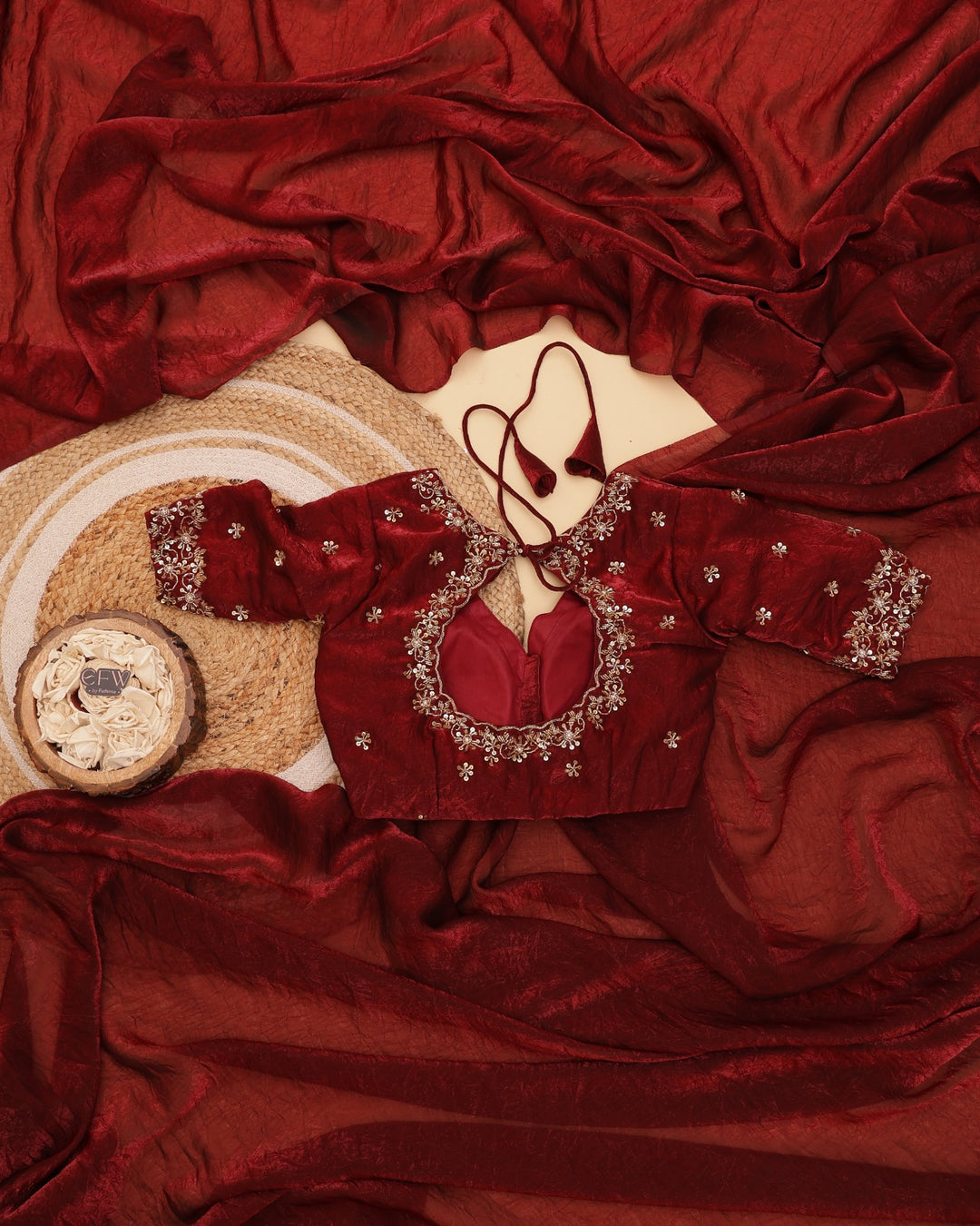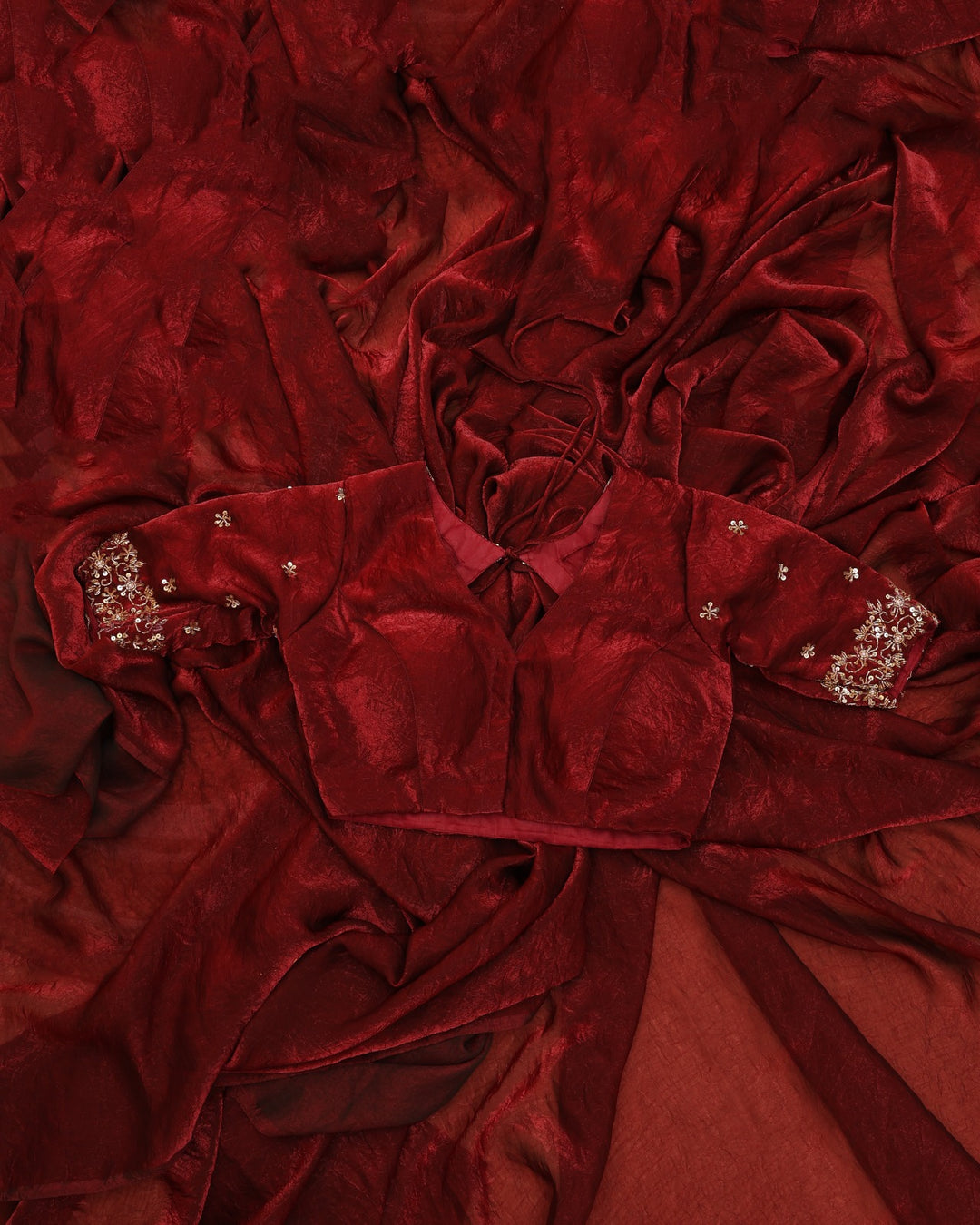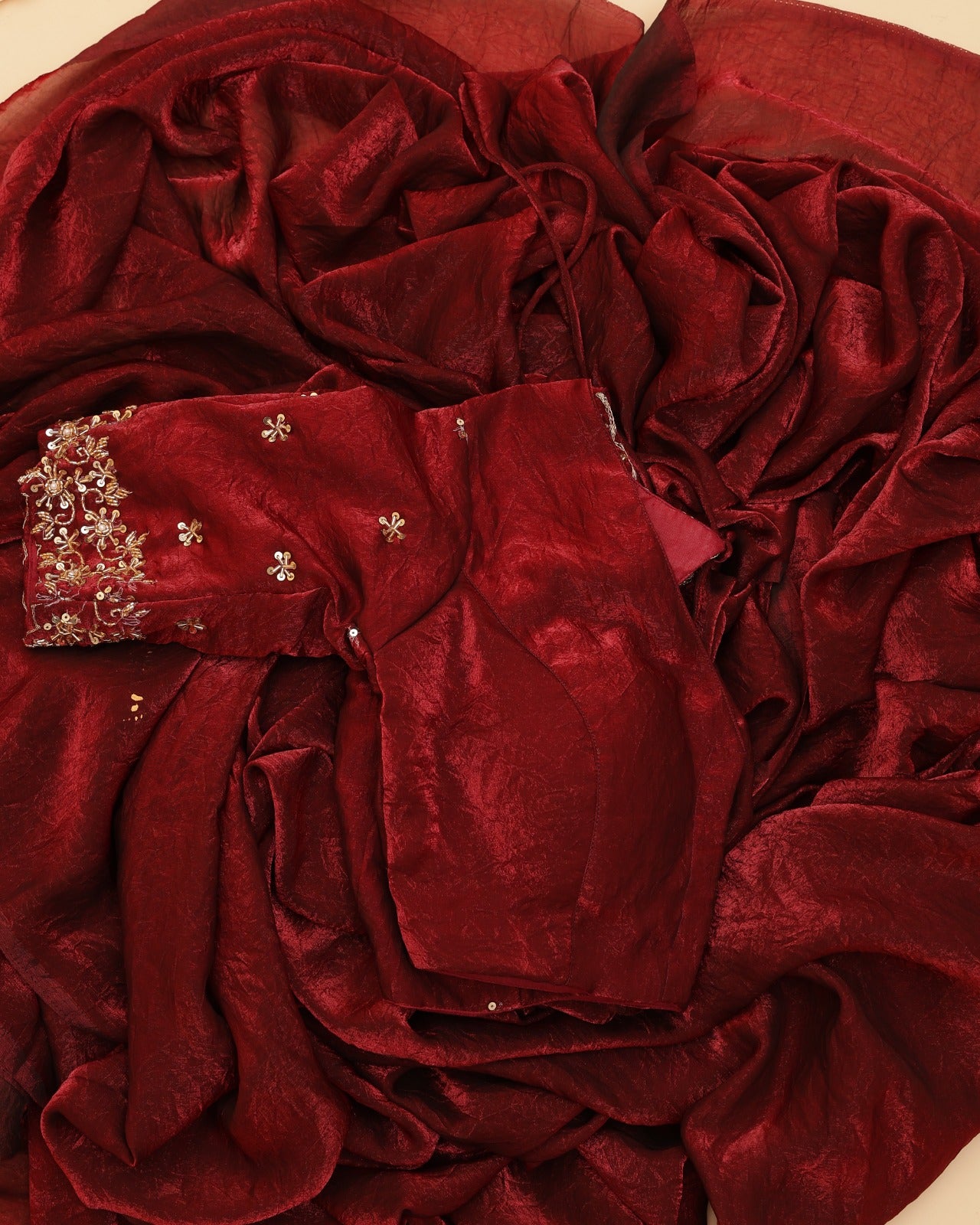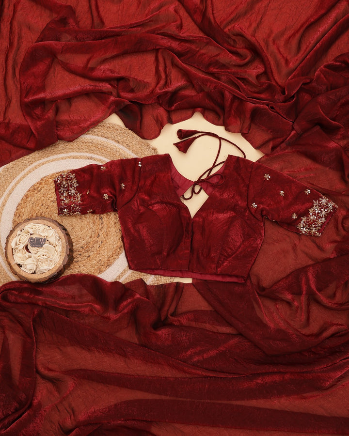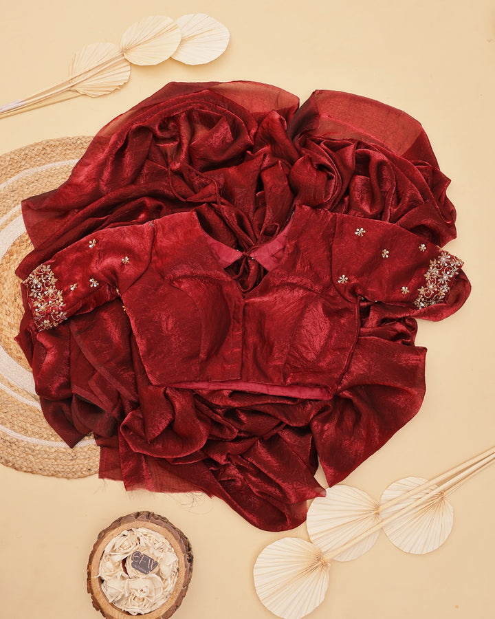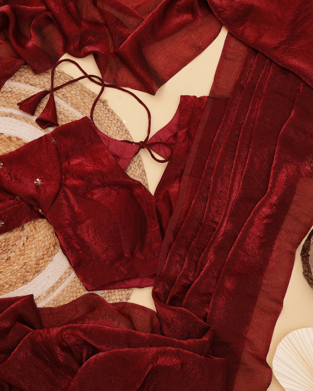 Meet KUDRAT, your new obsession in mossy dark maroon space silk. With its fluid shine and graceful drape, this saree doesn’t just make an entrance — it owns the room.