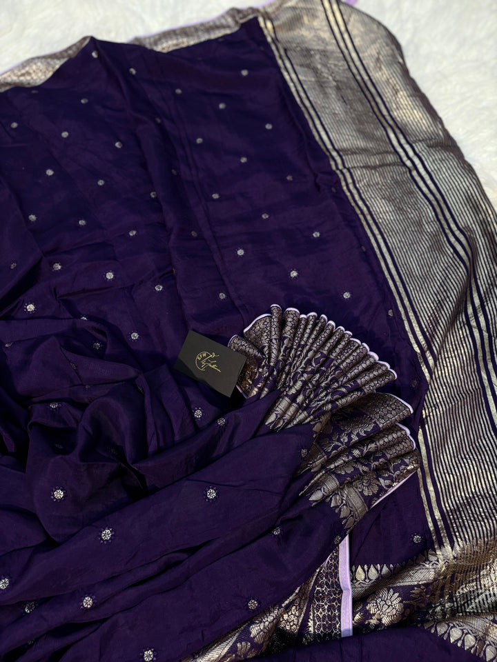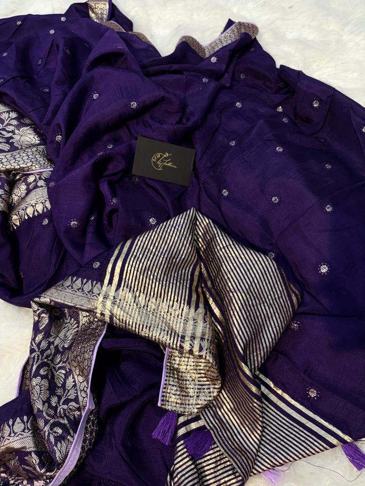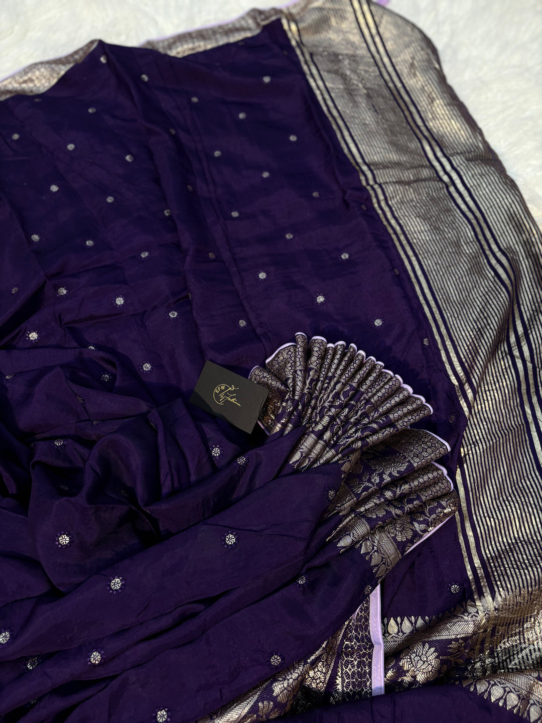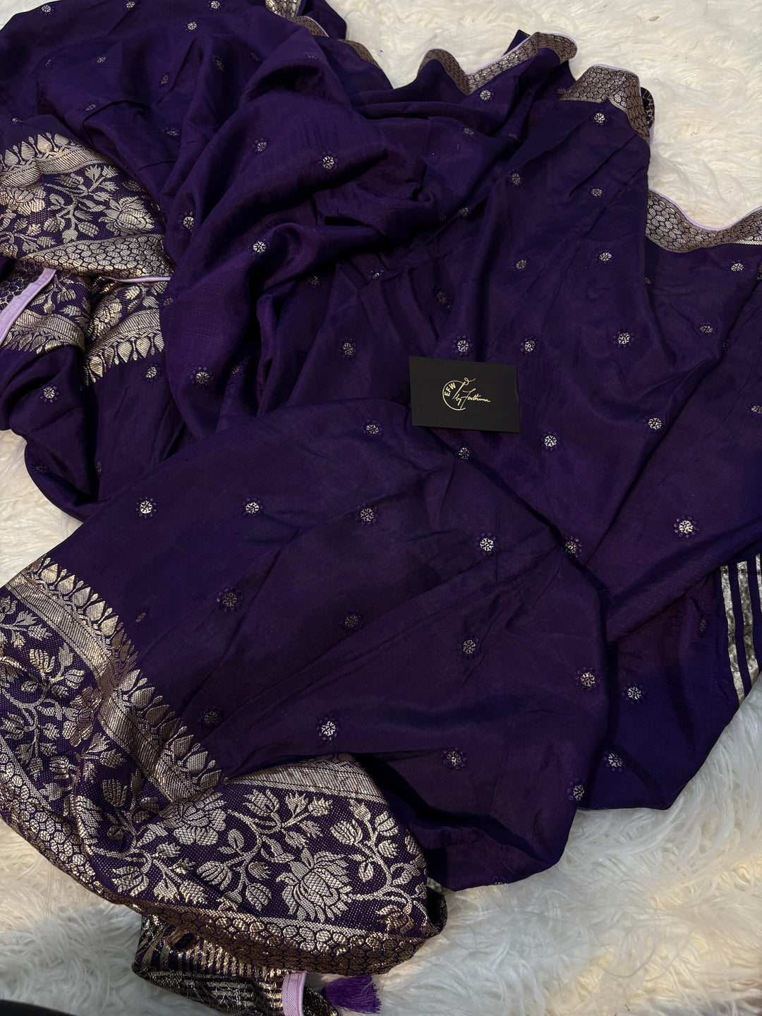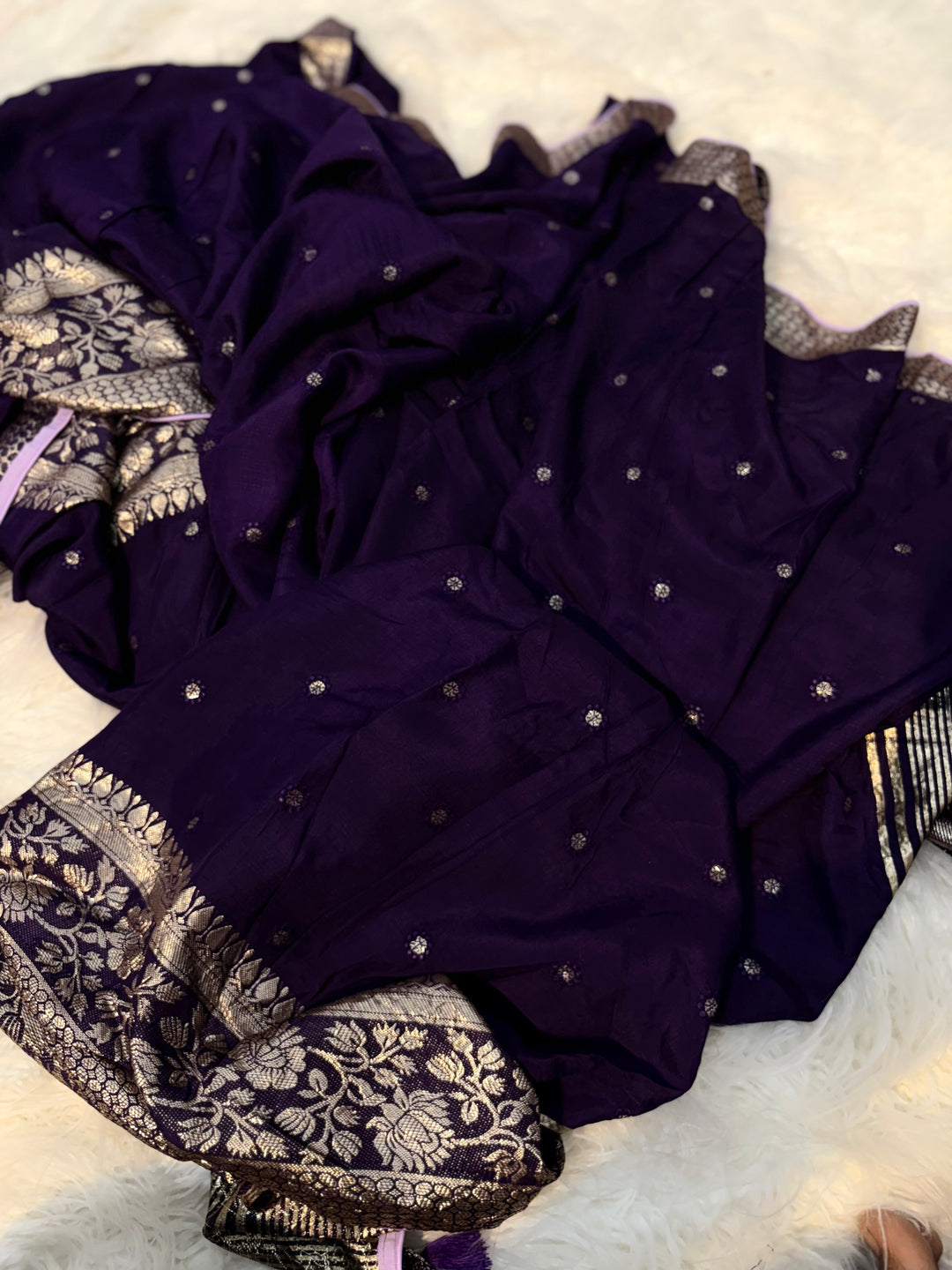 Ready to steal the spotlight? This gorgeous pure viscose chinonĀ silk saree in a fabulous purple shade is the ultimate showstopper! With a fancy thread sequins embroidered workĀ itās got all the drama you need to slay the day. Paired with a same chinon silkĀ blouse because why not go extra, right?Ā
