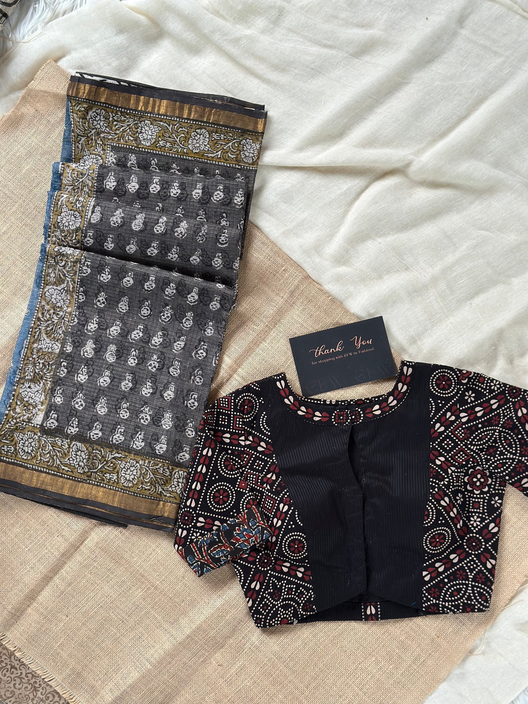 A beautiful soft cozy pure kota doriya saree with beautiful handblock prints with golden zari border