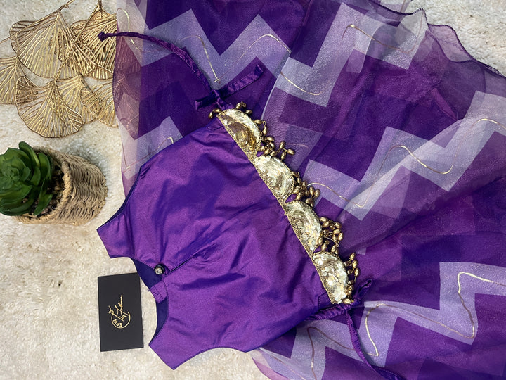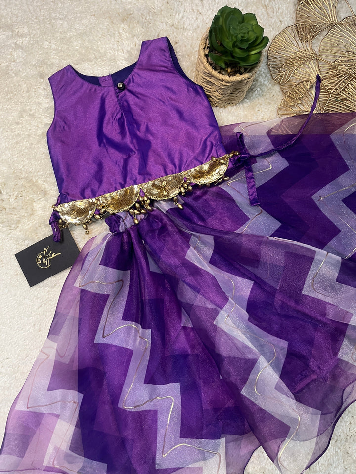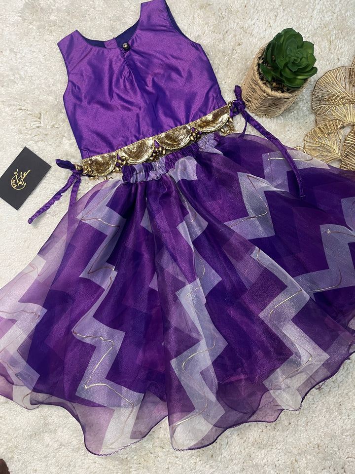 This exquisite purple party dress is perfect for little girls looking to shine at special occasions. The sleeveless bodice is crafted from luxurious fabric with a subtle sheen, exuding elegance and comfort. The highlight of the outfit is the layered skirt featuring a modern zigzag pattern in shades of purple, lavender, and white, adding a whimsical touch. A beautifully designed gold sequin waistband with scalloped details and dangling embellishments further elevates the outfit’s glamour. Lightweight and breathable, this dress is ideal for birthdays, family celebrations, or formal events, making your little one feel like a princess.