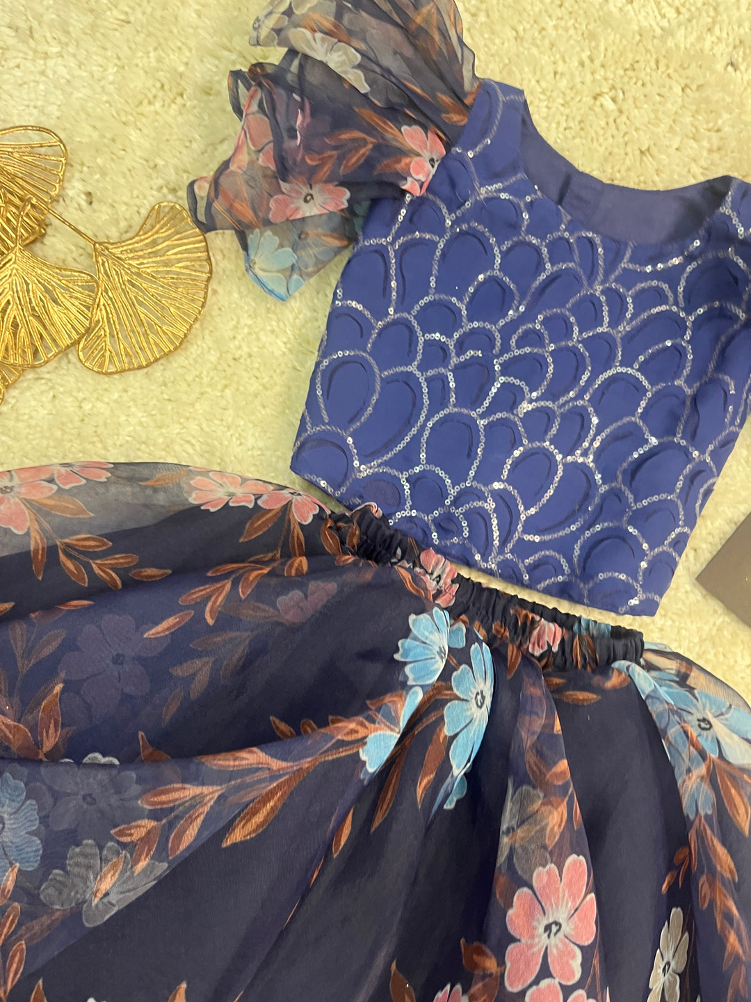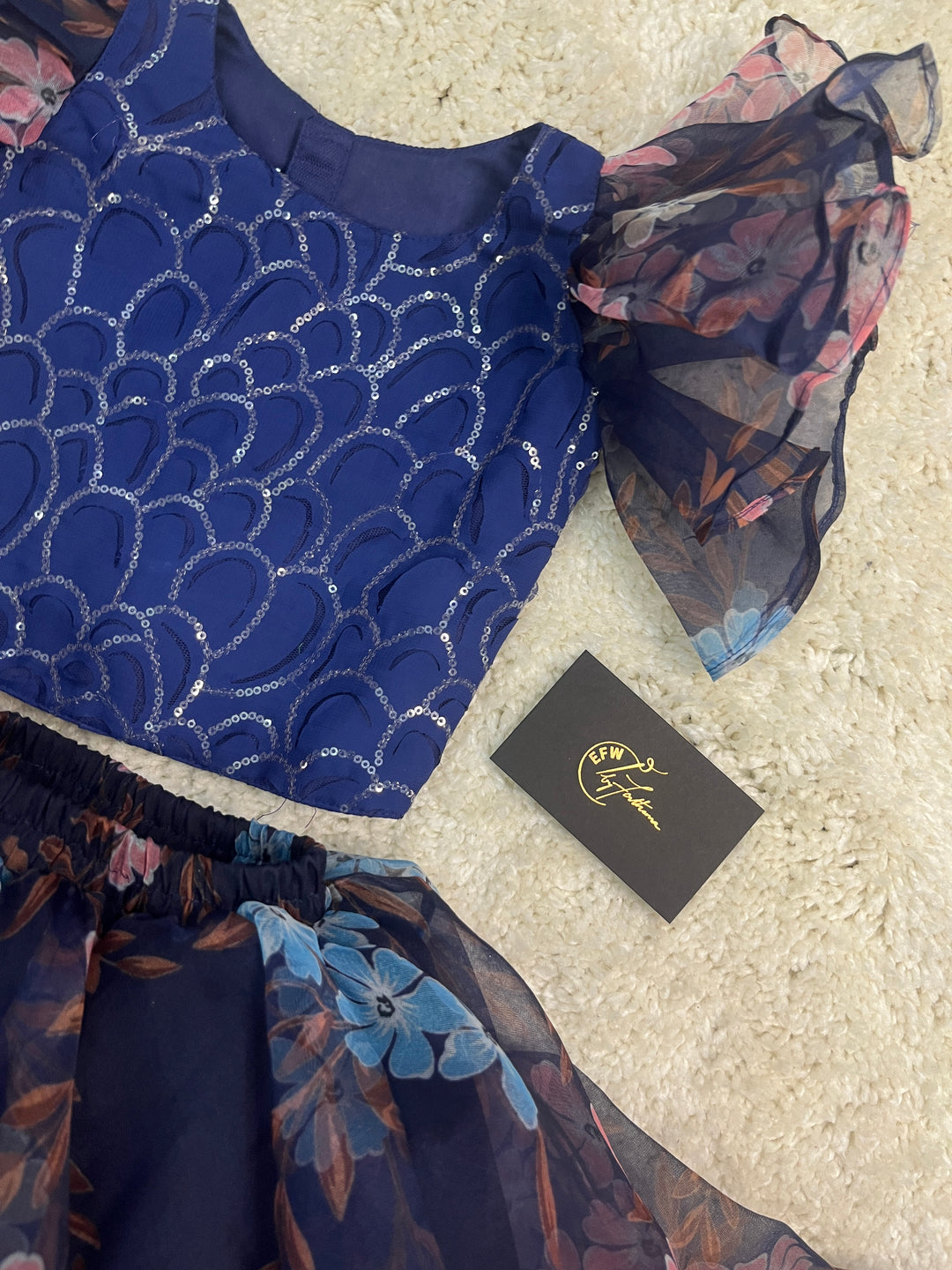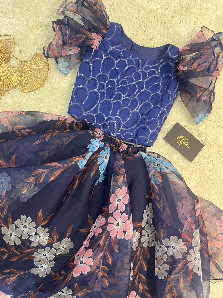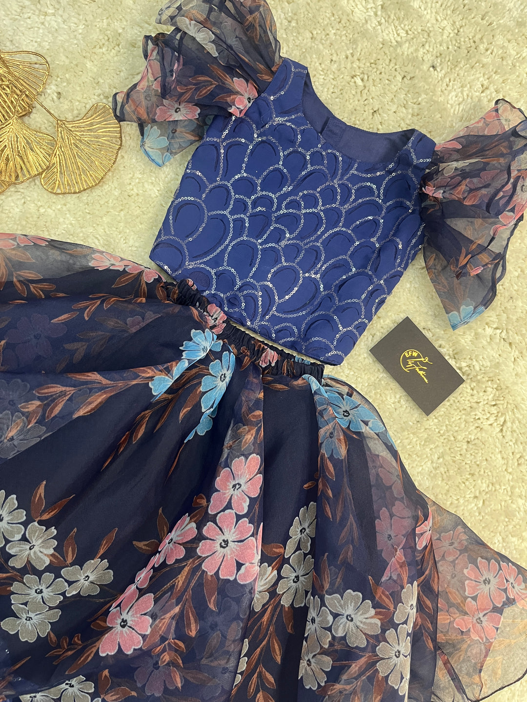 Inspired by the beauty of nature and the elegance of celebrations, the Miraaya outfit captures the essence of grace and charm. The rich navy blue bodice, detailed with shimmering patterns, pairs beautifully with the soft, flowing skirt adorned with delicate floral prints in pastel hues. The dreamy sheer sleeves add a whimsical touch, making this ensemble perfect for your little one’s special moments.