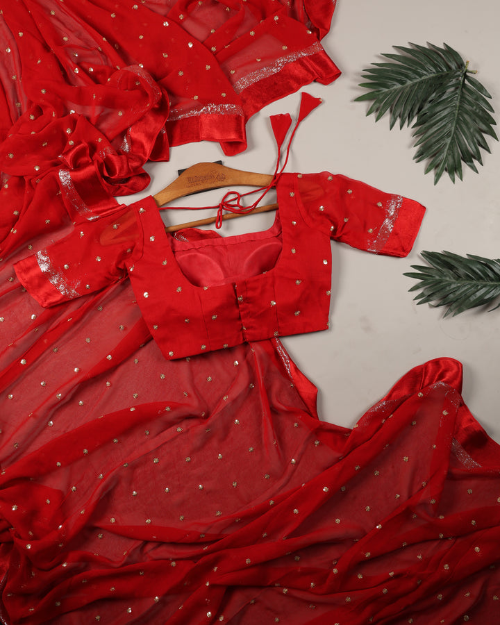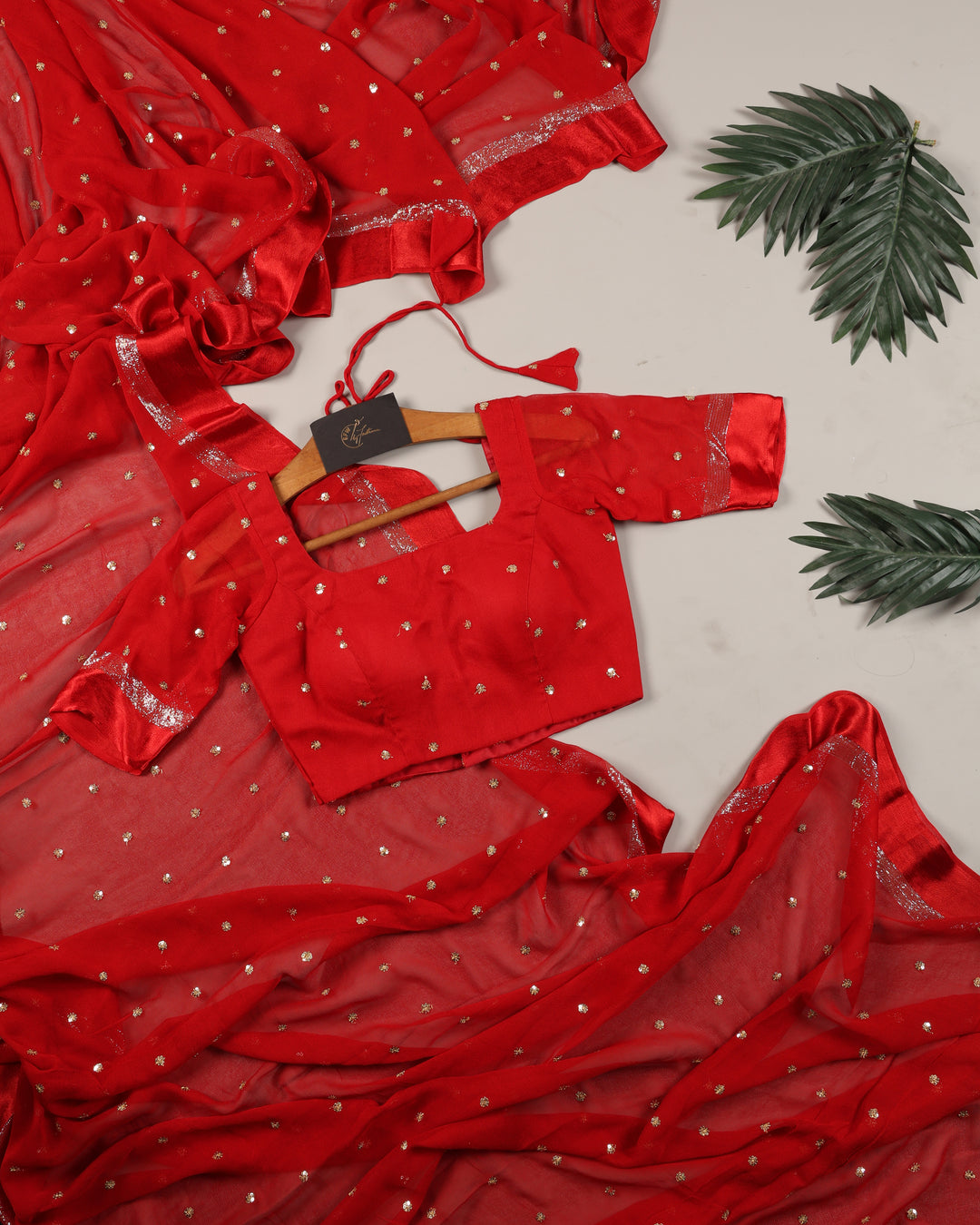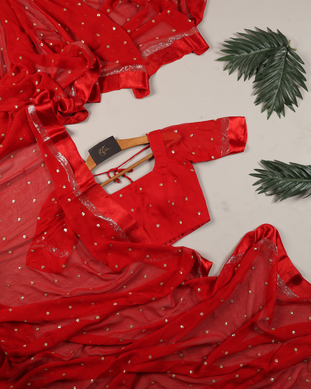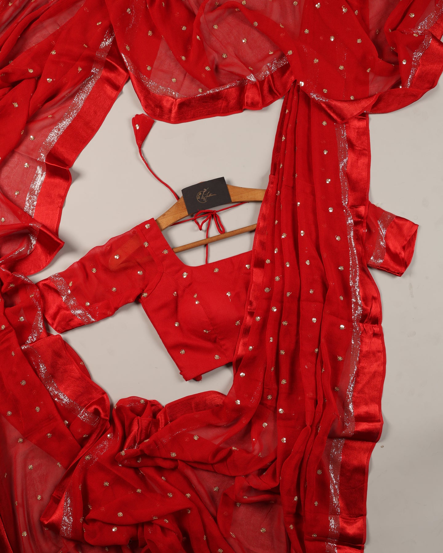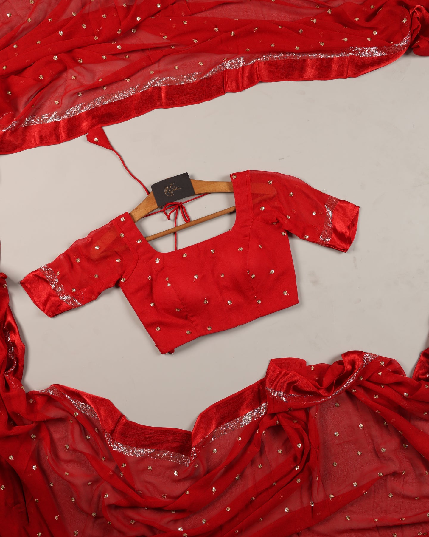Calling all soft saree lovers! Don't miss this chance to stand out! Our exquisite red saree boasts a captivating shimmer with all-over mini silver sequins. The bespoke blouse features a stunning ruffle-sleeves