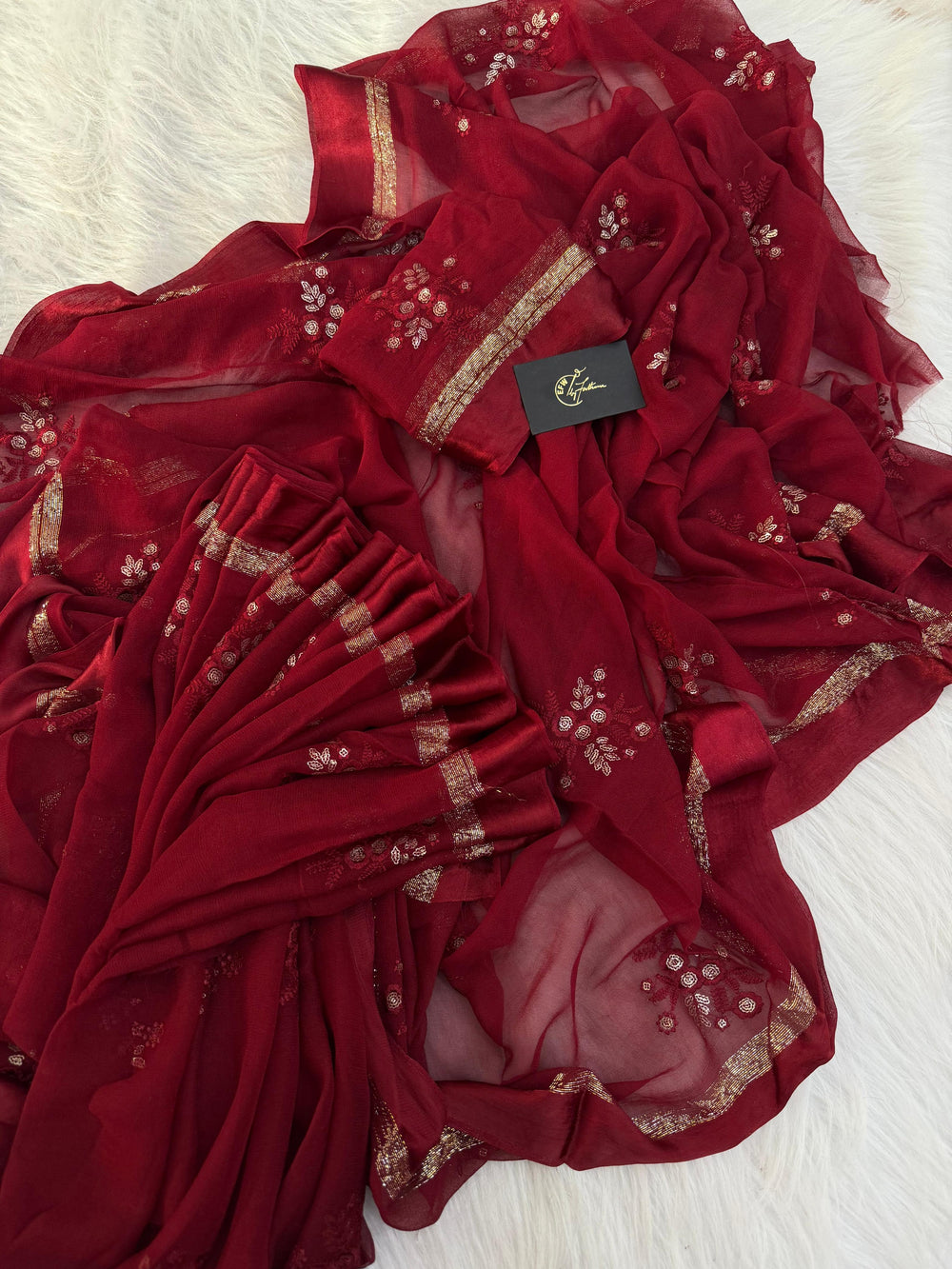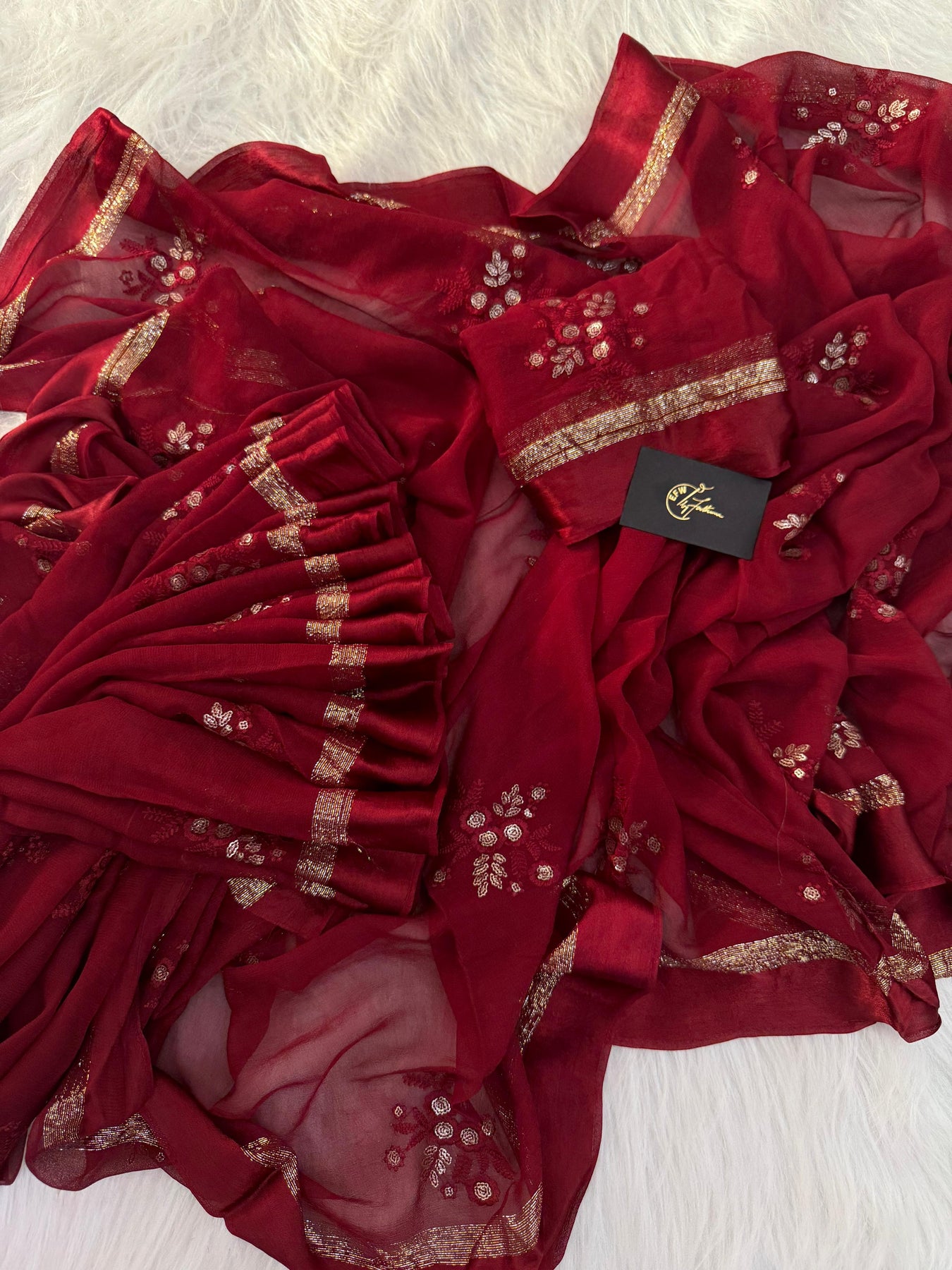 Serving major royal vibes with this Maroon viscose Georgette saree paired with a bomb maroon blouse! 🔥 Full-on golden sequins bling, rich maroon feels, and that satin border? Total slay mode.