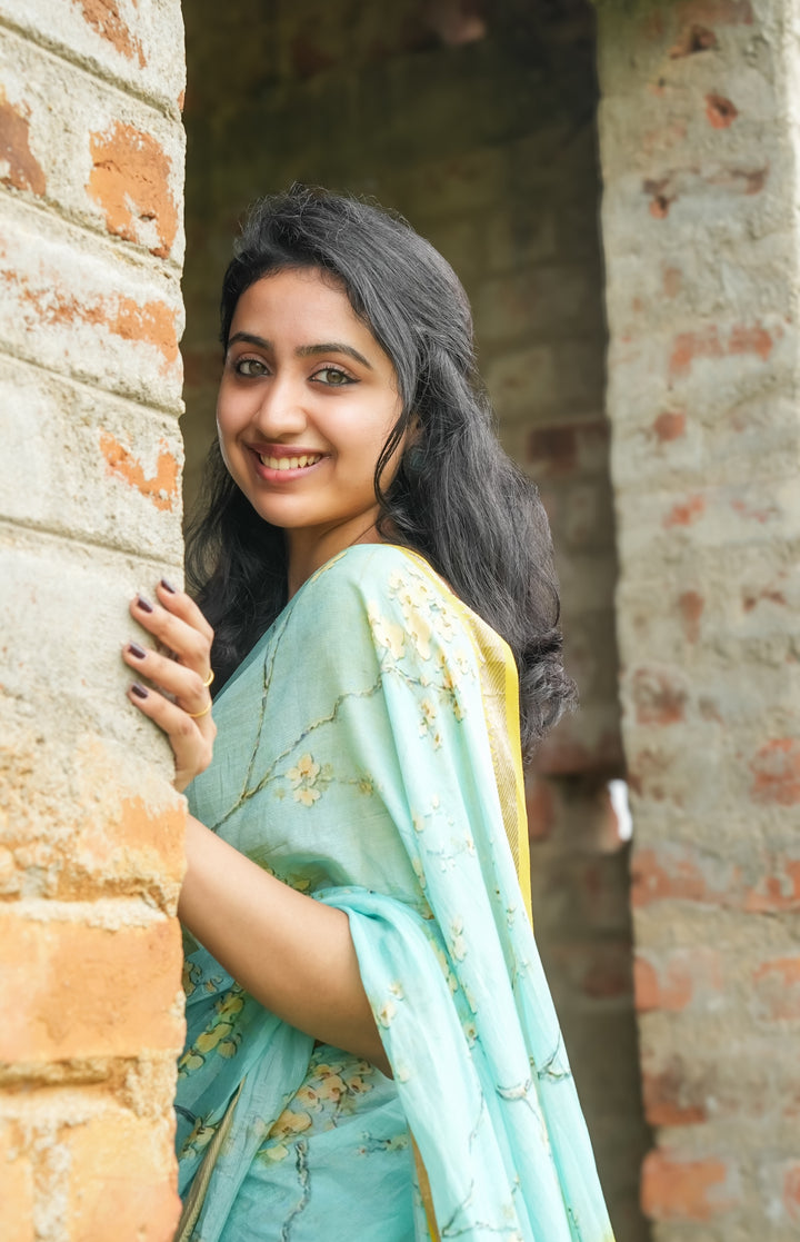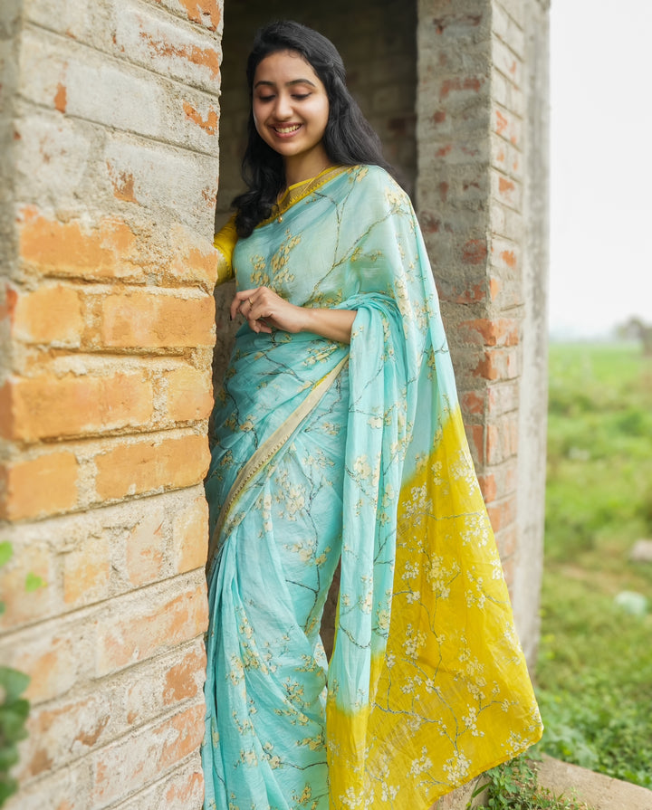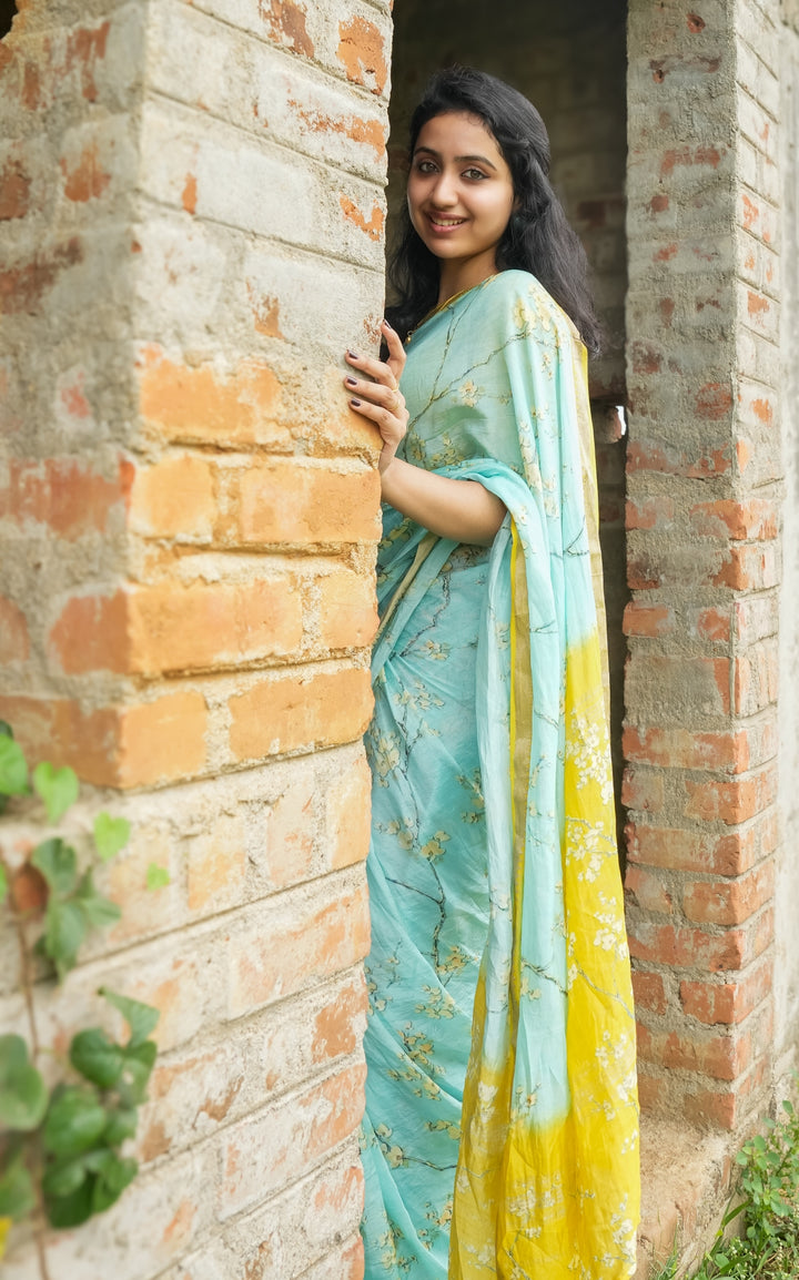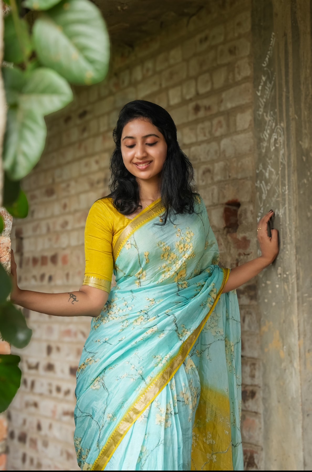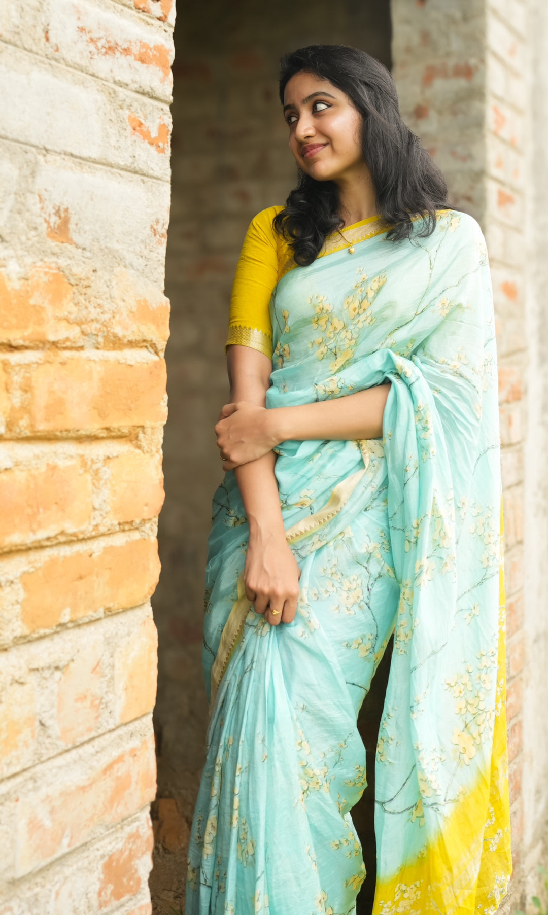 A color combination so breathtaking, it’s love at first sight! This pure Mangalgiri pattu saree in a mesmerizing turquoise blue and yellow blend is a true stunner, adorned with beautiful floral prints and paired with a customized blouse that’s all about the details!