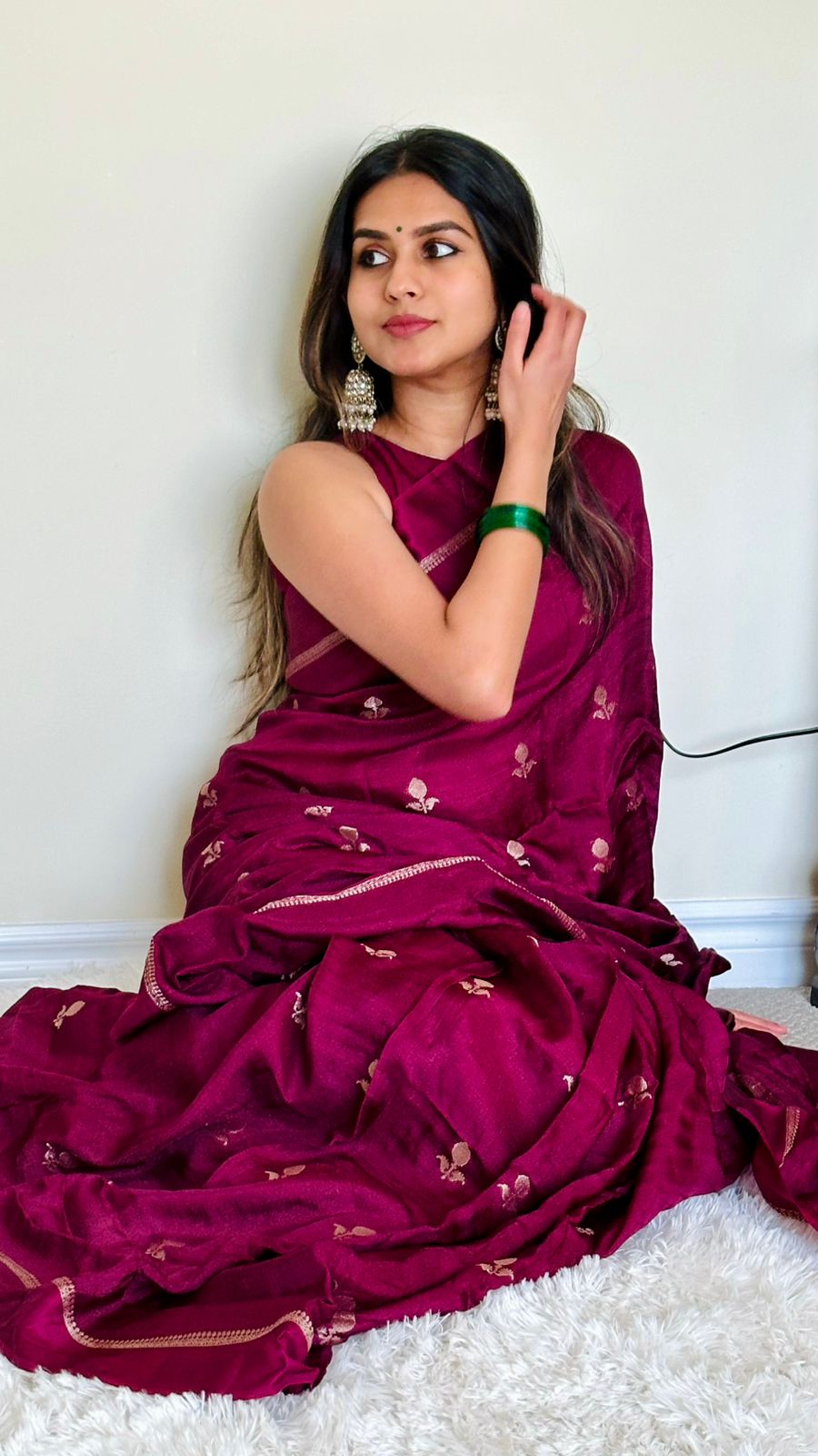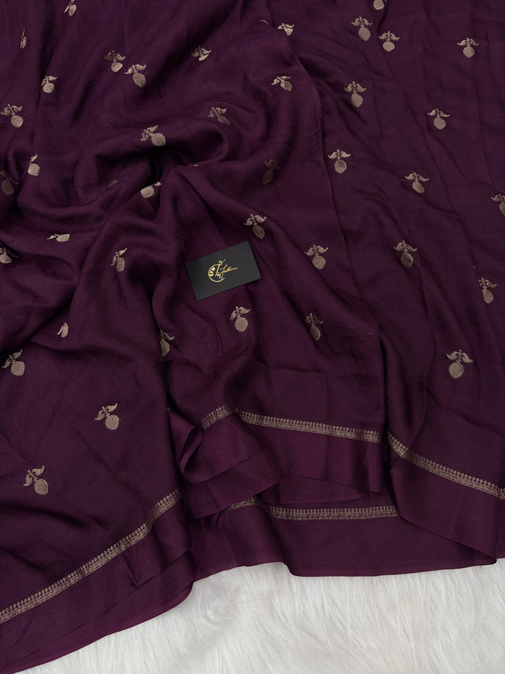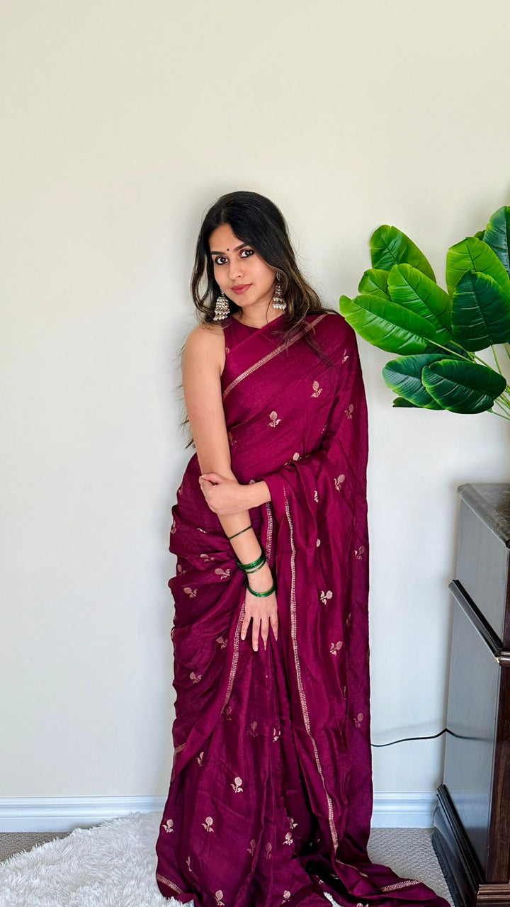 Ready to steal the spotlight? This gorgeous pure viscose khadi silk saree in a fabulous dark purple shade is the ultimate showstopper! With a fancy jacquard border and golden zari work, it’s got all the drama you need to slay the day. Paired with a same kahdhi blouse because why not go extra, right?