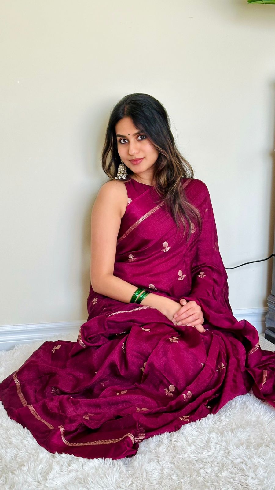 Calling all soft saree lovers! Don't miss this chance to stand out! Our exquisite royal Viscose khaddhi saree boasts a captivating shimmer with all-over mini golden zari floral motifs. ✨ The bespoke blouse features a stunning neck pattern