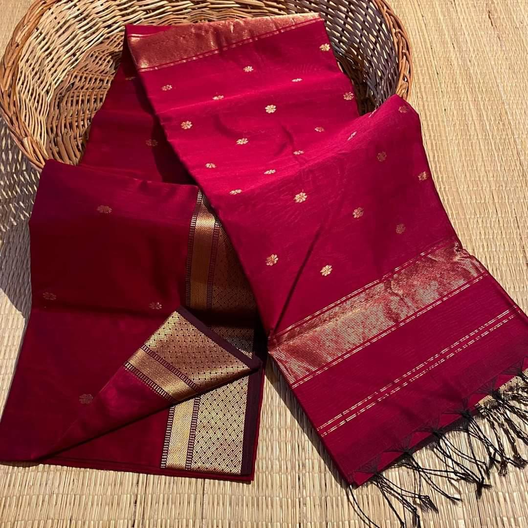 Minnoli is our sophisticated saree made from pure Maheshwari silk. Its beautiful floral buttas and golden woven border throughout add an elegant touch. The lightweight fabric makes it comfortable to wear while its stunning pallu completes the look. Perfect for any occasion.
