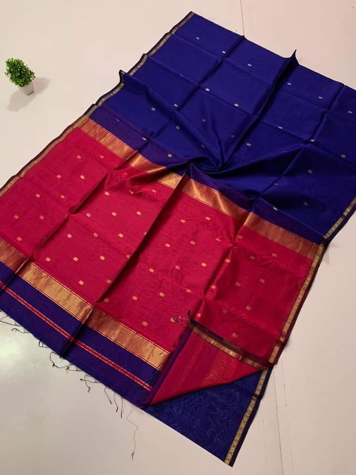 MUDHRA is expertly crafted with pure maheshwari silk and adorned with intricate floral work. The finger line zari border adds a touch of elegance, while the contrast pallu and beautiful floral buttas all over make it a stunning piece. Elevate your wardrobe with this timeless beauty.