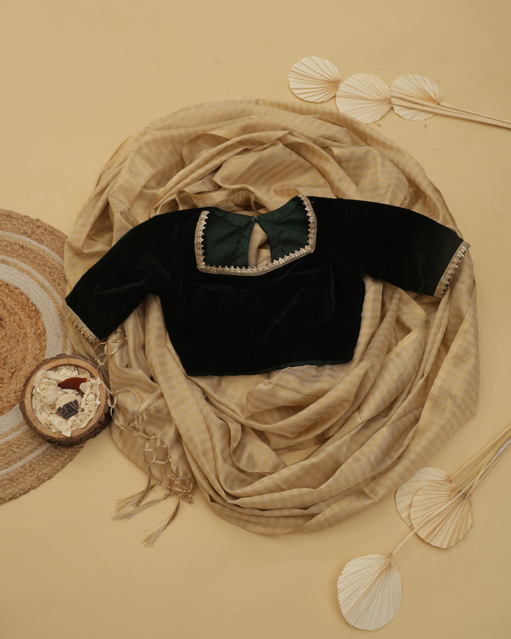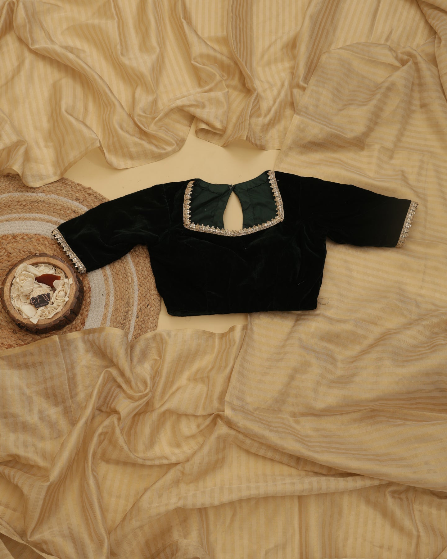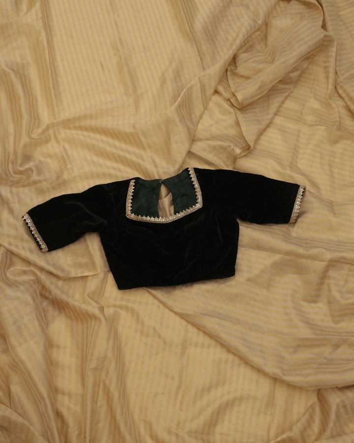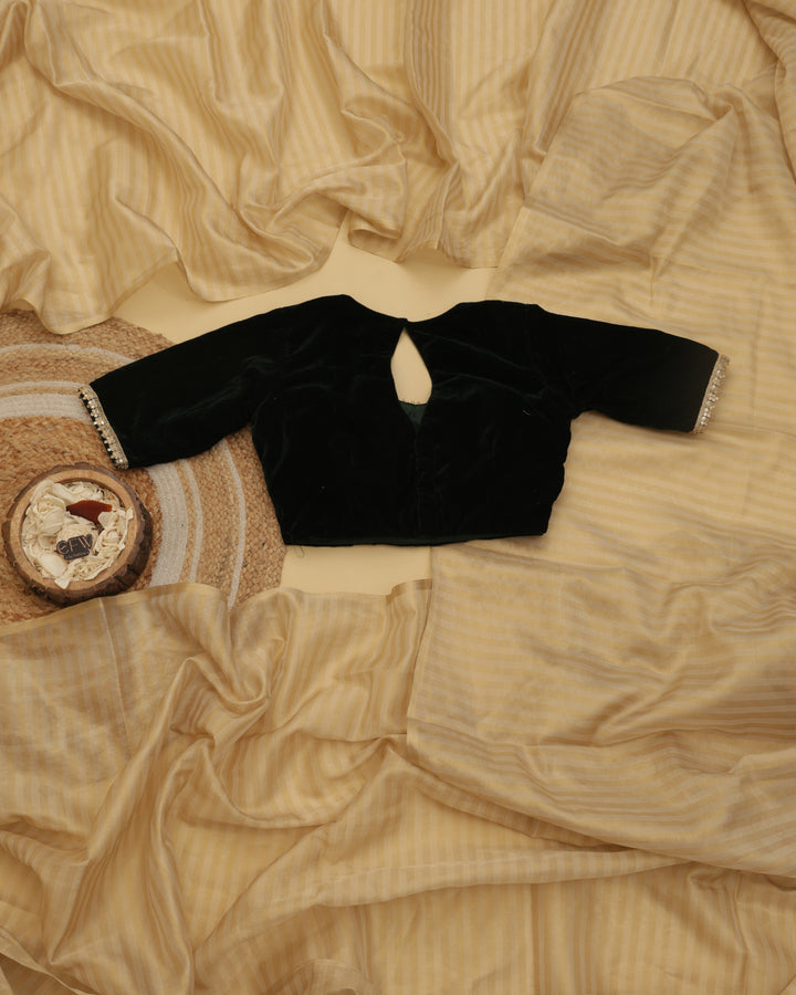 The blouse, tailored in a lush green velvet, adds a regal contrast to the saree’s subtle sheen. It features a square front neckline embellished with mirror and pearl detailing, and a keyhole back cut with tie-up, adding a modern silhouette to its traditional soul. The mid-length sleeves are framed with matching embellishments, creating a balanced look of subtle grandeur.