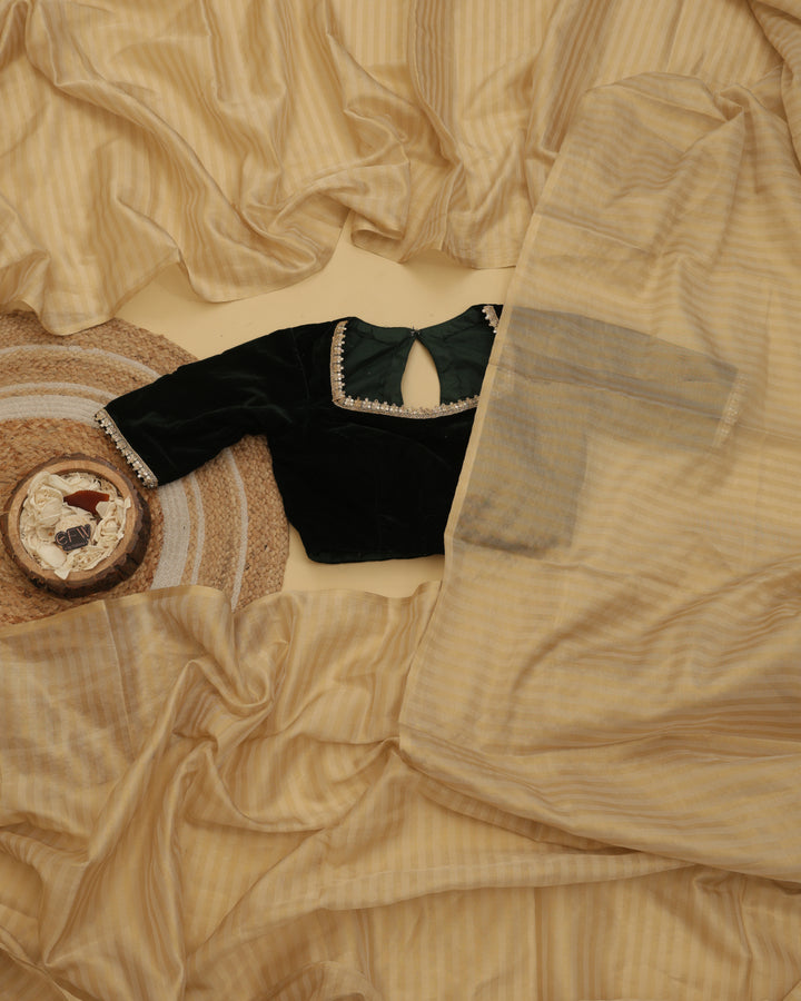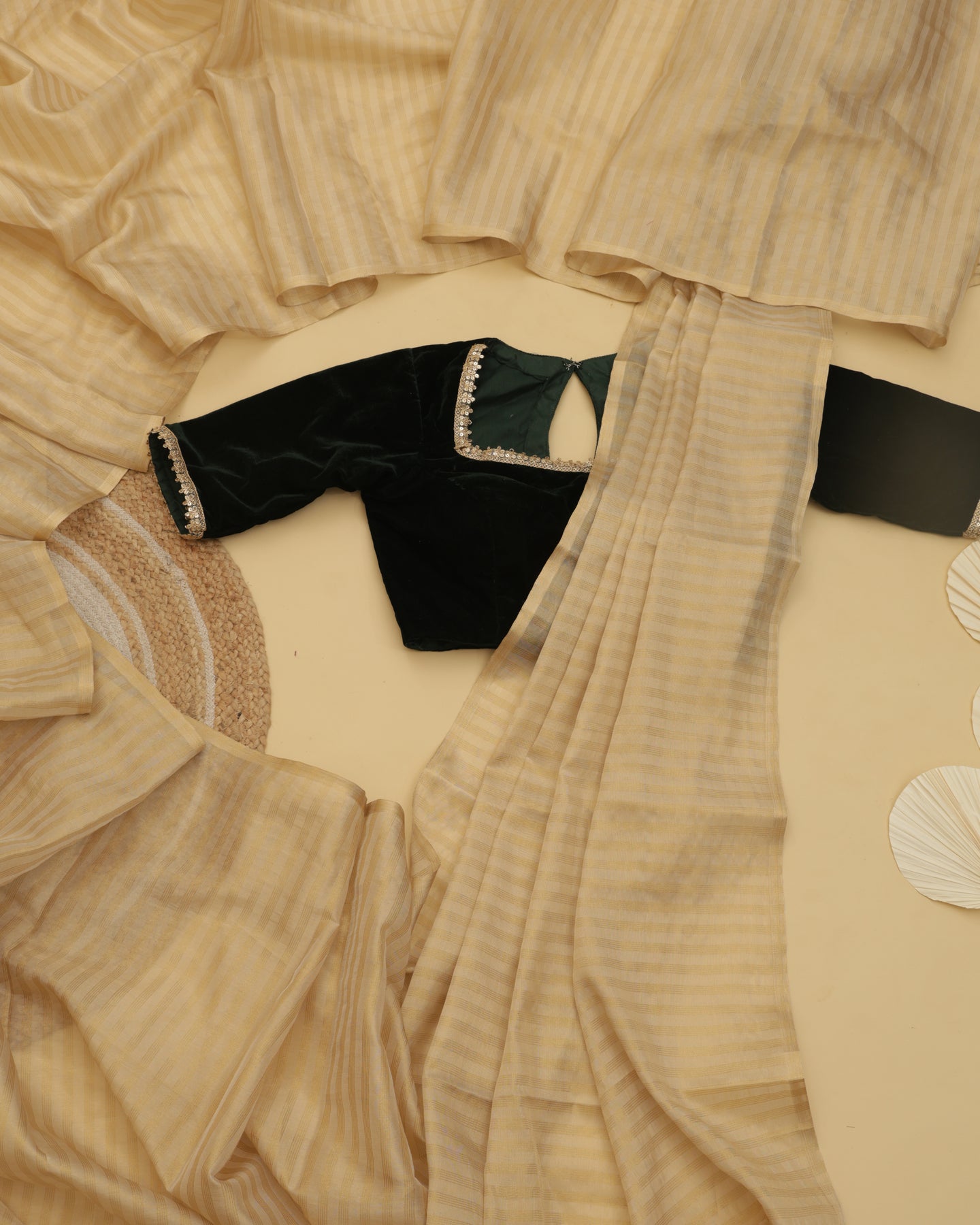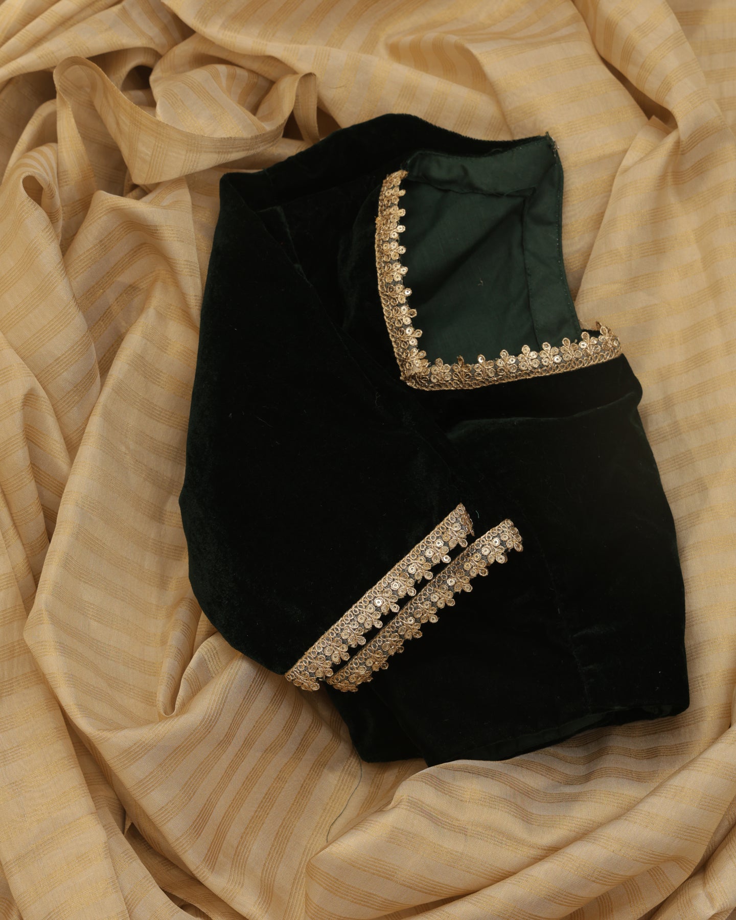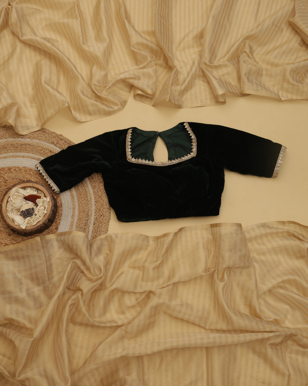 The blouse, tailored in a lush green velvet, adds a regal contrast to the saree’s subtle sheen. It features a square front neckline embellished with mirror and pearl detailing, and a keyhole back cut with tie-up, adding a modern silhouette to its traditional soul. The mid-length sleeves are framed with matching embellishments, creating a balanced look of subtle grandeur.