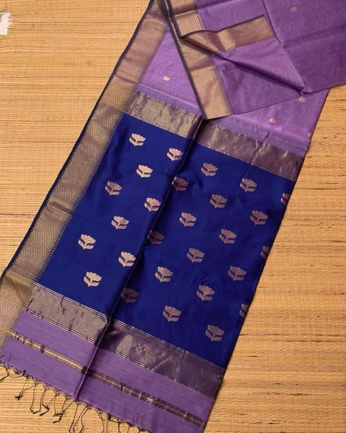 Experience luxury with PANIMALAR, made with pure maheshwari silk for a soft and smooth feel. The stunning golden zari border adds a touch of elegance, while the contrast pallu with Lotus buttas adds a unique and stylish touch. Elevate your style with this elegant and classy saree.