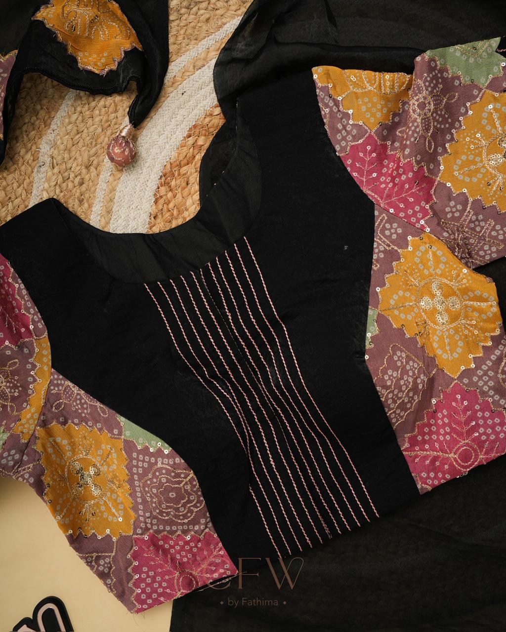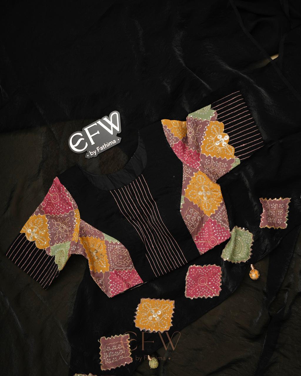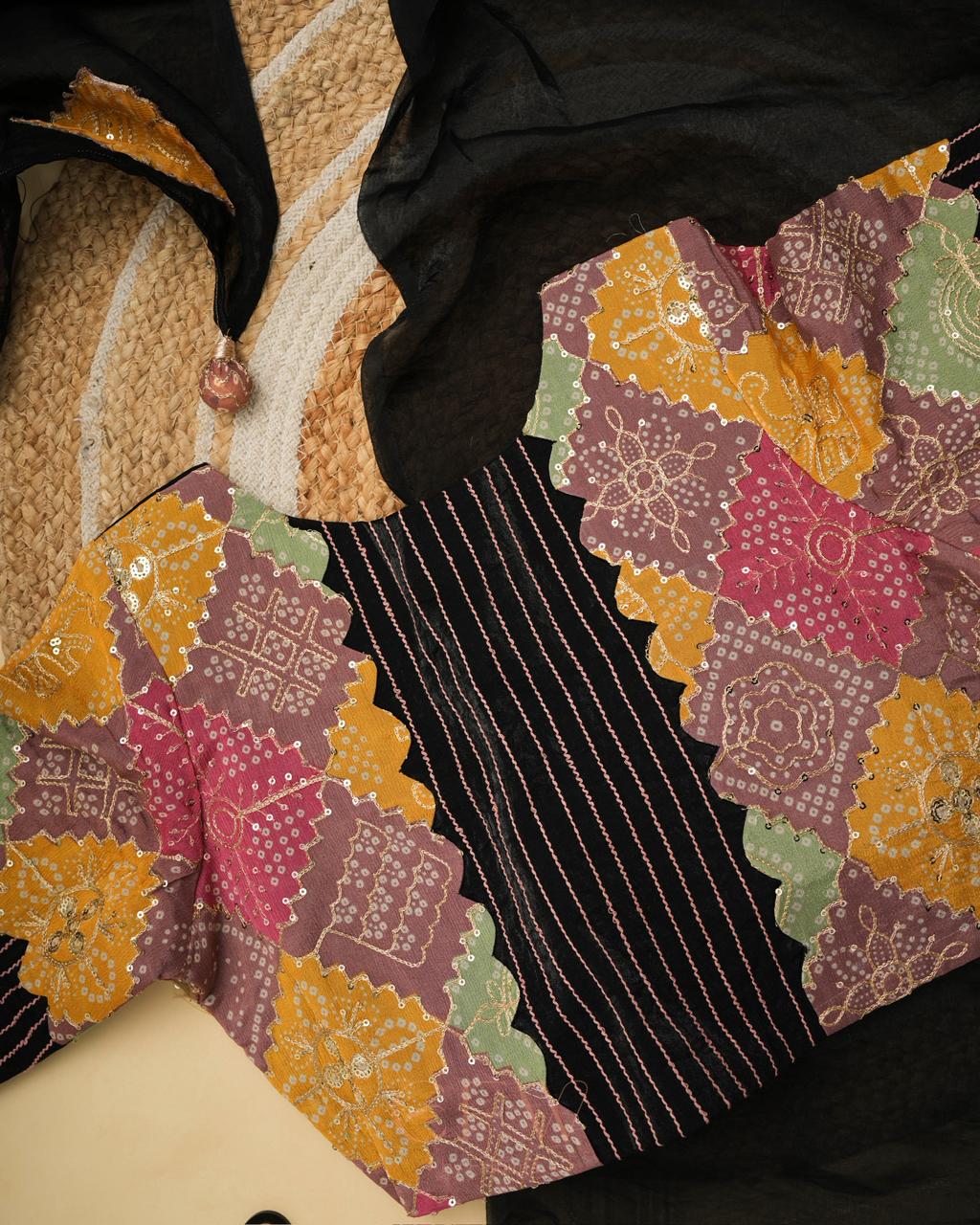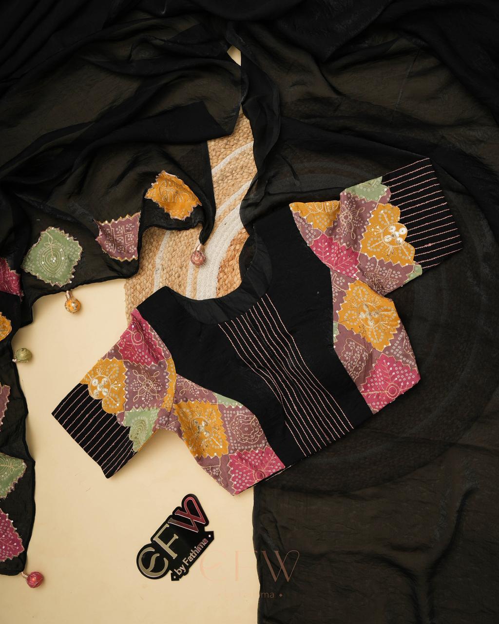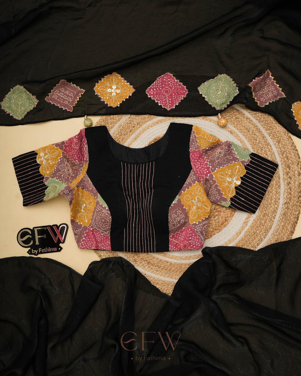 - Blouse: Multi-patchwork (bandhani + solids)