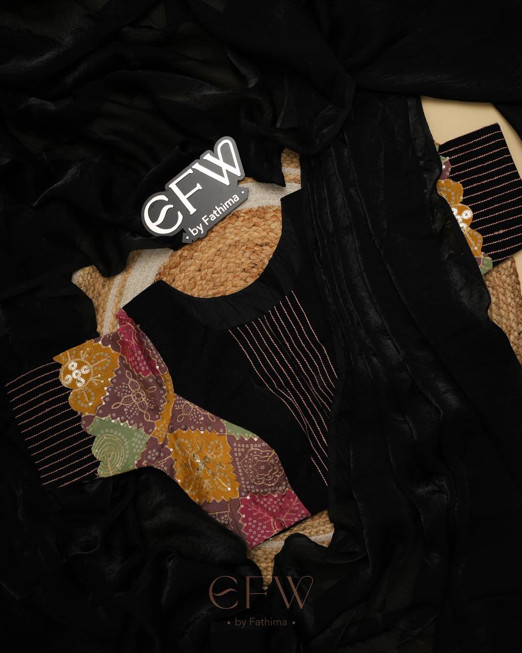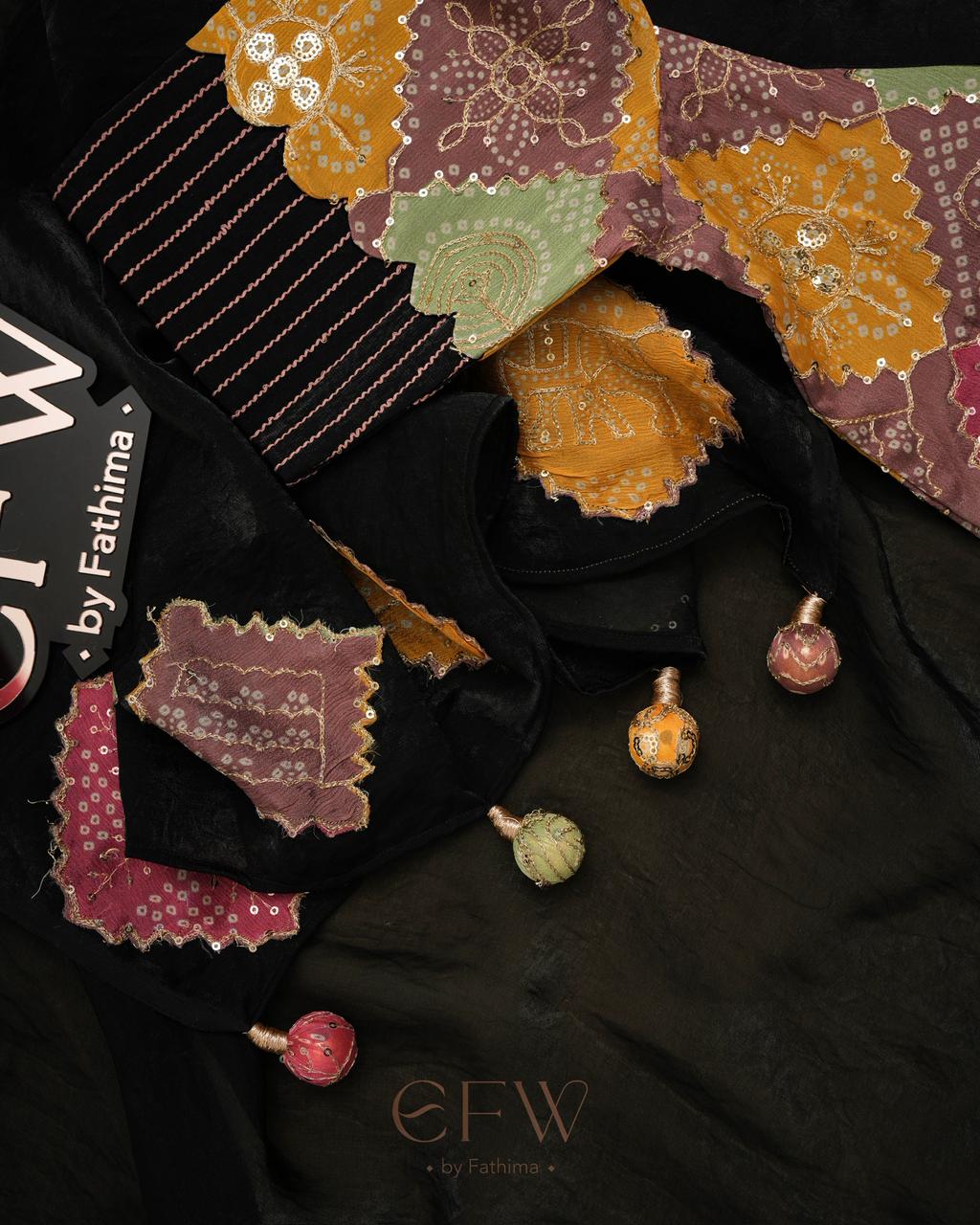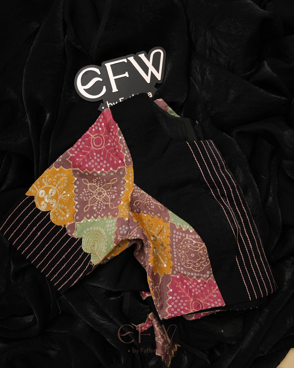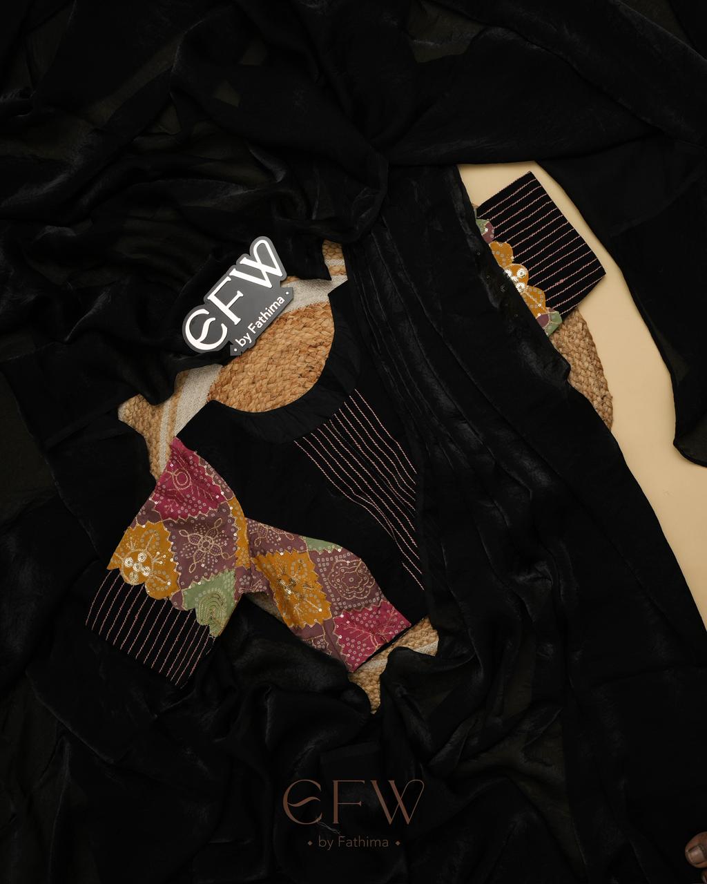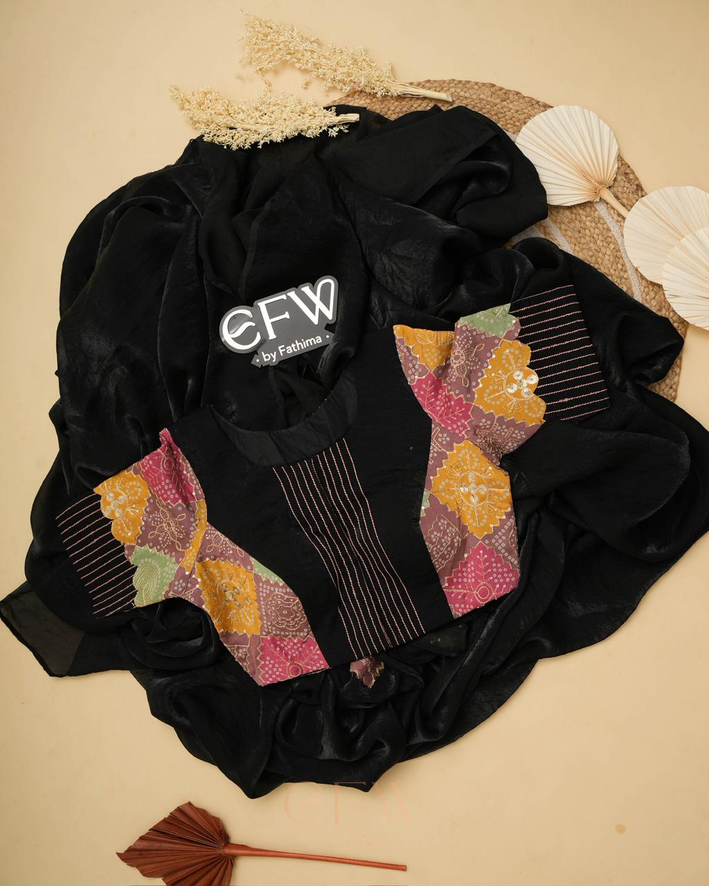 - Blouse: Multi-patchwork (bandhani + solids)