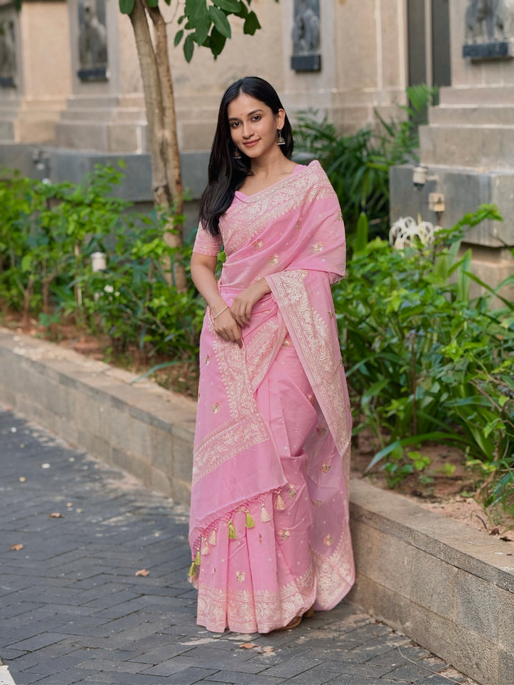 Product Name: Pastel Pink Chikankari Embroidered Saree with Bespoke Net Blouse