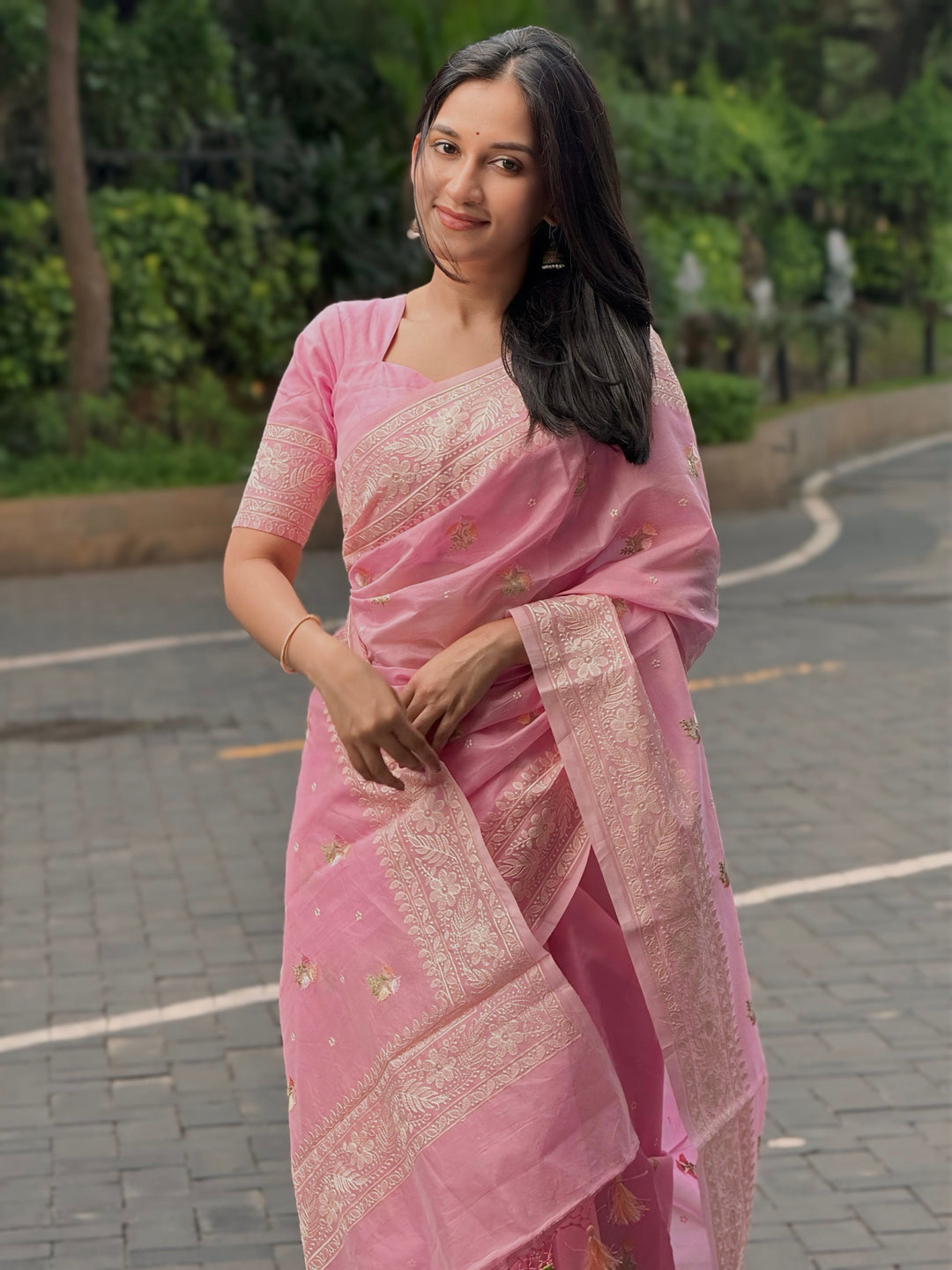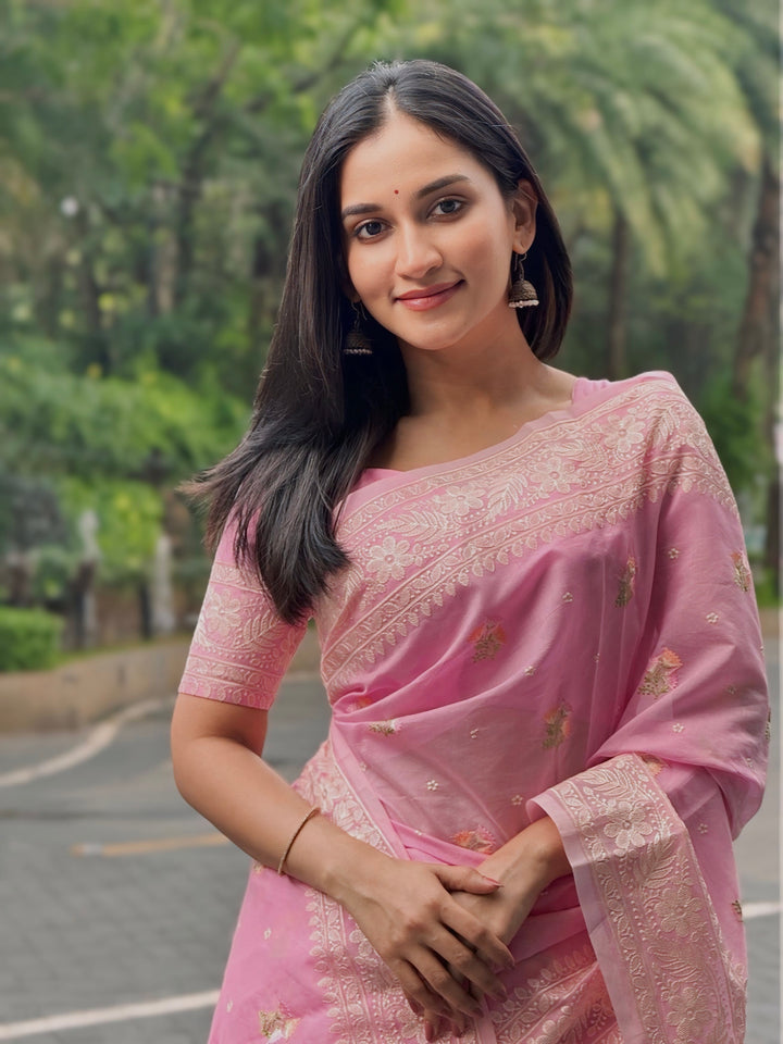 Step into timeless elegance with our pastel pink saree, a true masterpiece of craftsmanship. Featuring intricate chikankari work and delicate floral embroidery, this saree exudes grace and sophistication. The lightweight fabric drapes beautifully, making it perfect for any occasion.