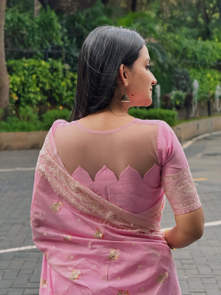 Paired with a custom-designed net blouse, this ensemble blends traditional artistry with modern aesthetics. The sheer net fabric adds a touch of glamor, while the bespoke design ensures a perfect fit. The soft pink shade complements all skin tones, making you feel effortlessly luxurious and confident.