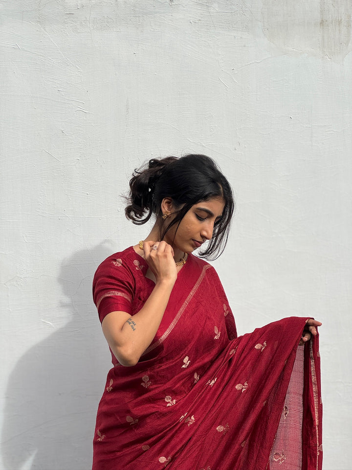 Ready to steal the spotlight? This gorgeous pure viscose khadi silk saree in a fabulous maroom shade is the ultimate showstopper! With a fancy jacquard border and golden zari work, it’s got all the drama you need to slay the day. Paired with a same kahdhi blouse because why not go extra, right?