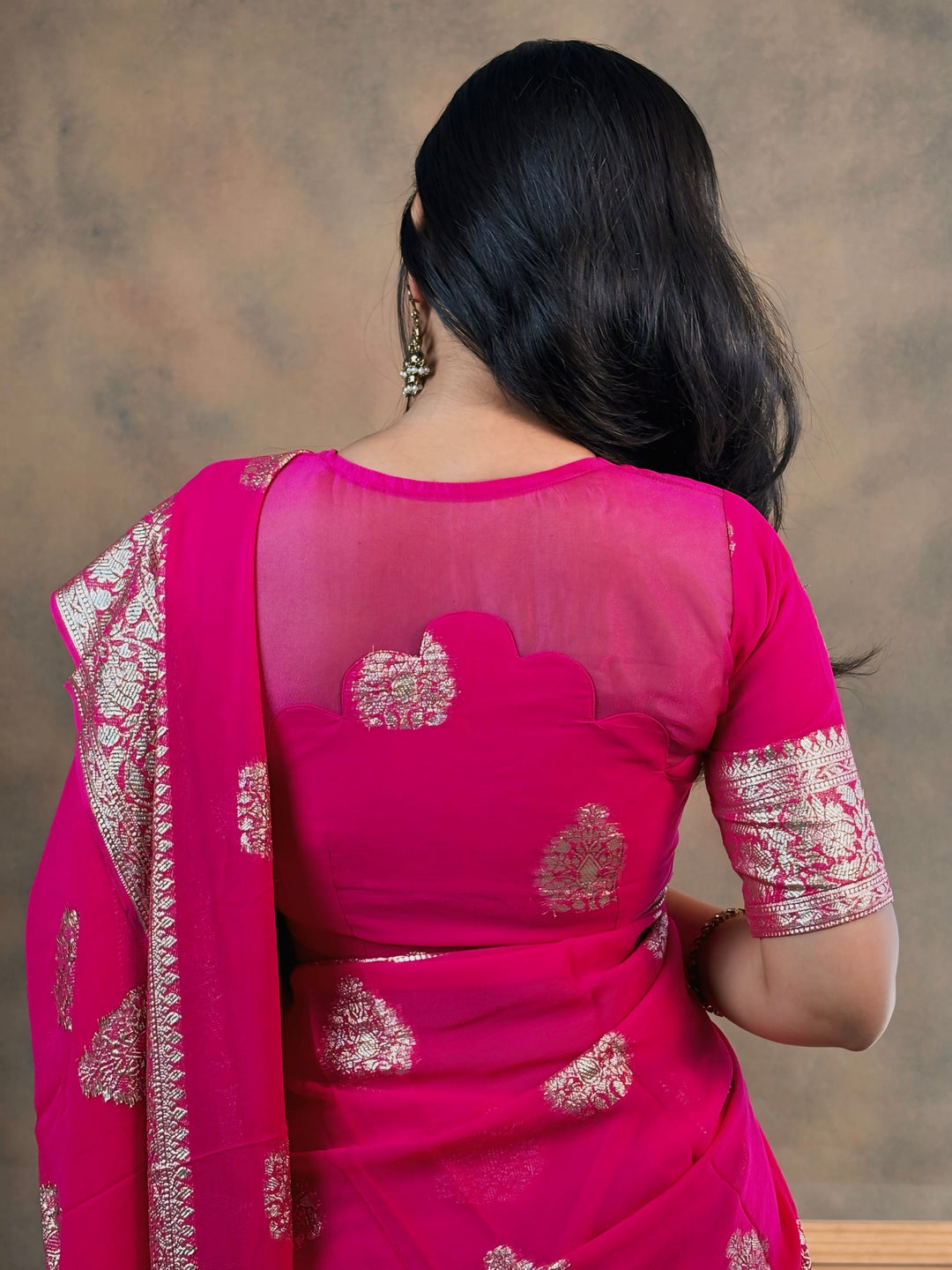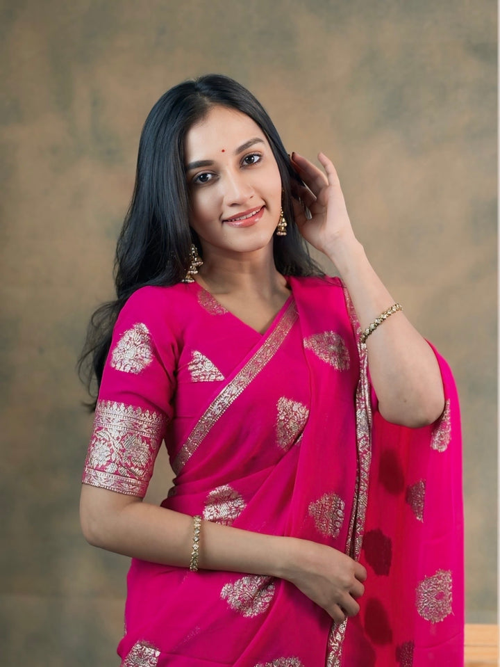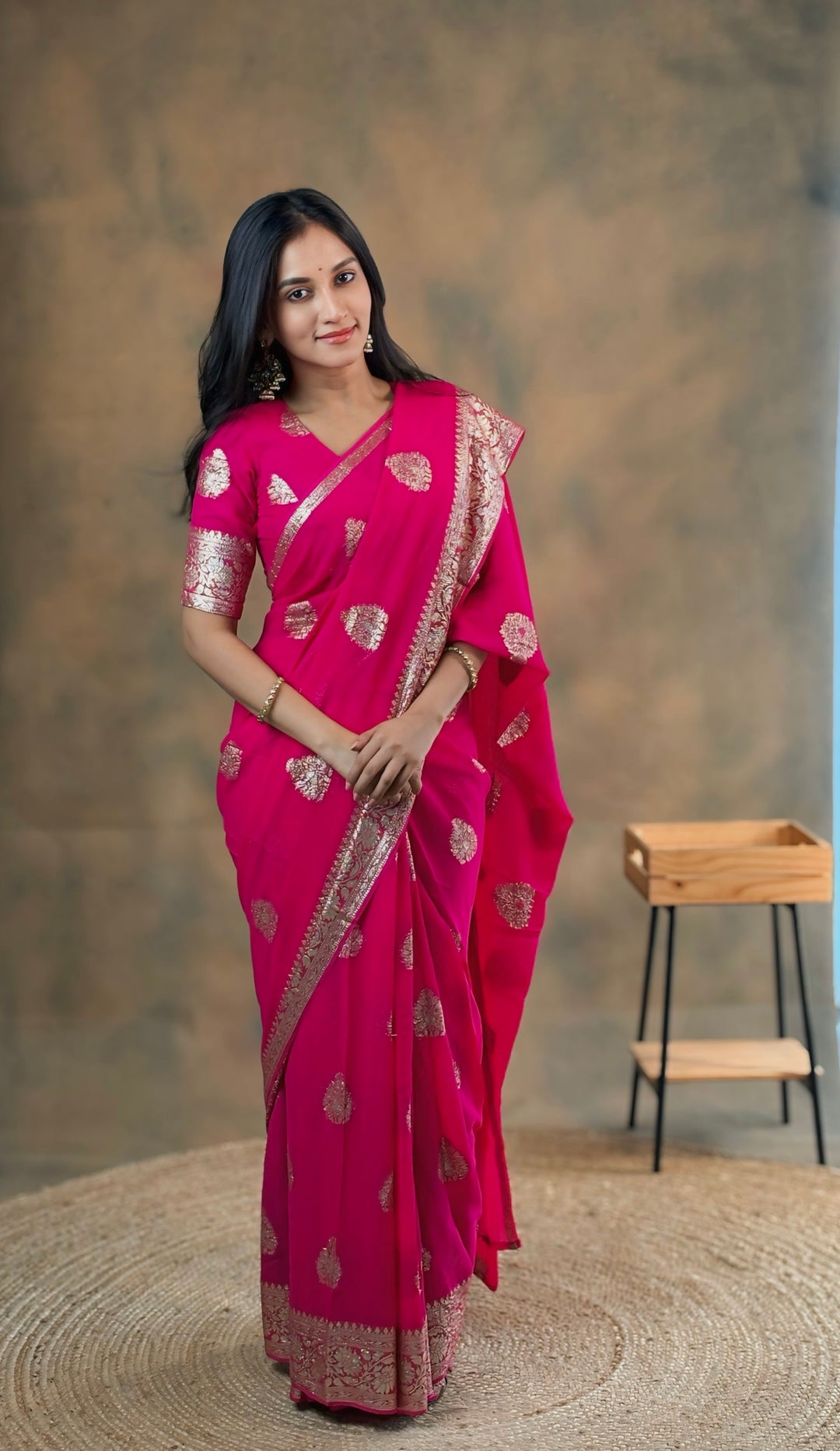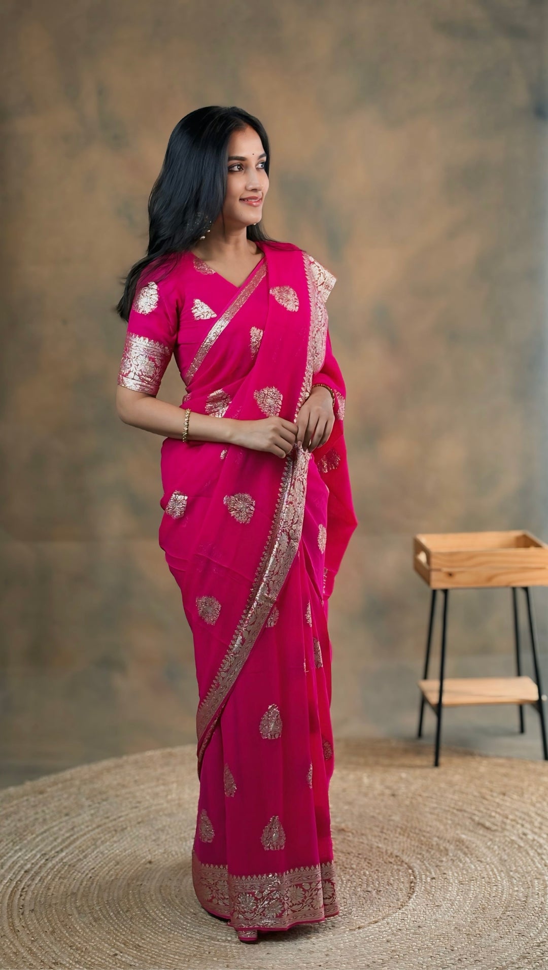 Calling all soft saree lovers! Don't miss this chance to stand out! Our exquisite royal Georgette saree boasts a captivating shimmer with all-over mini silver zari. ✨