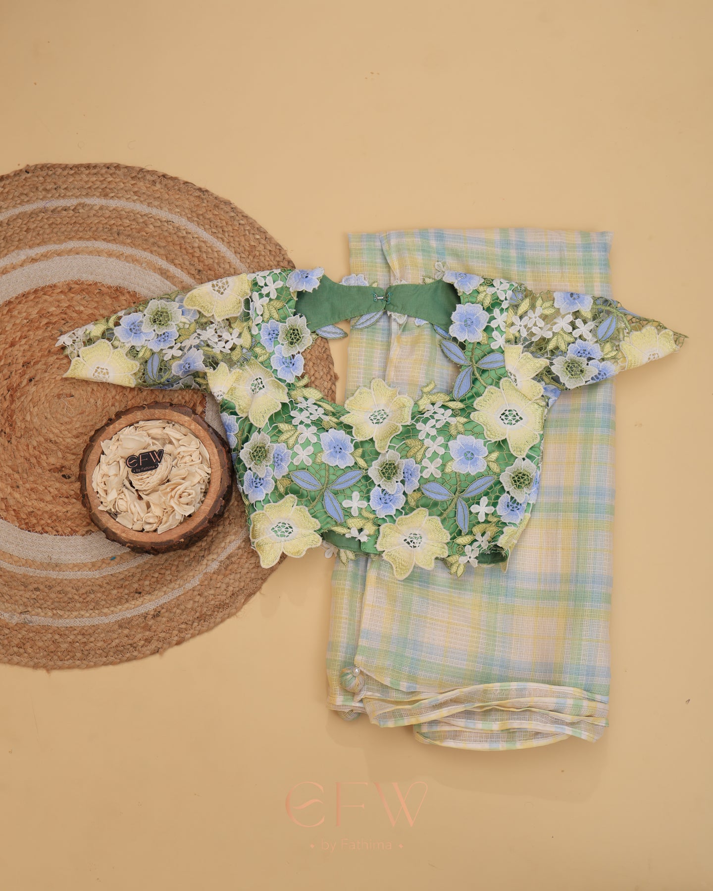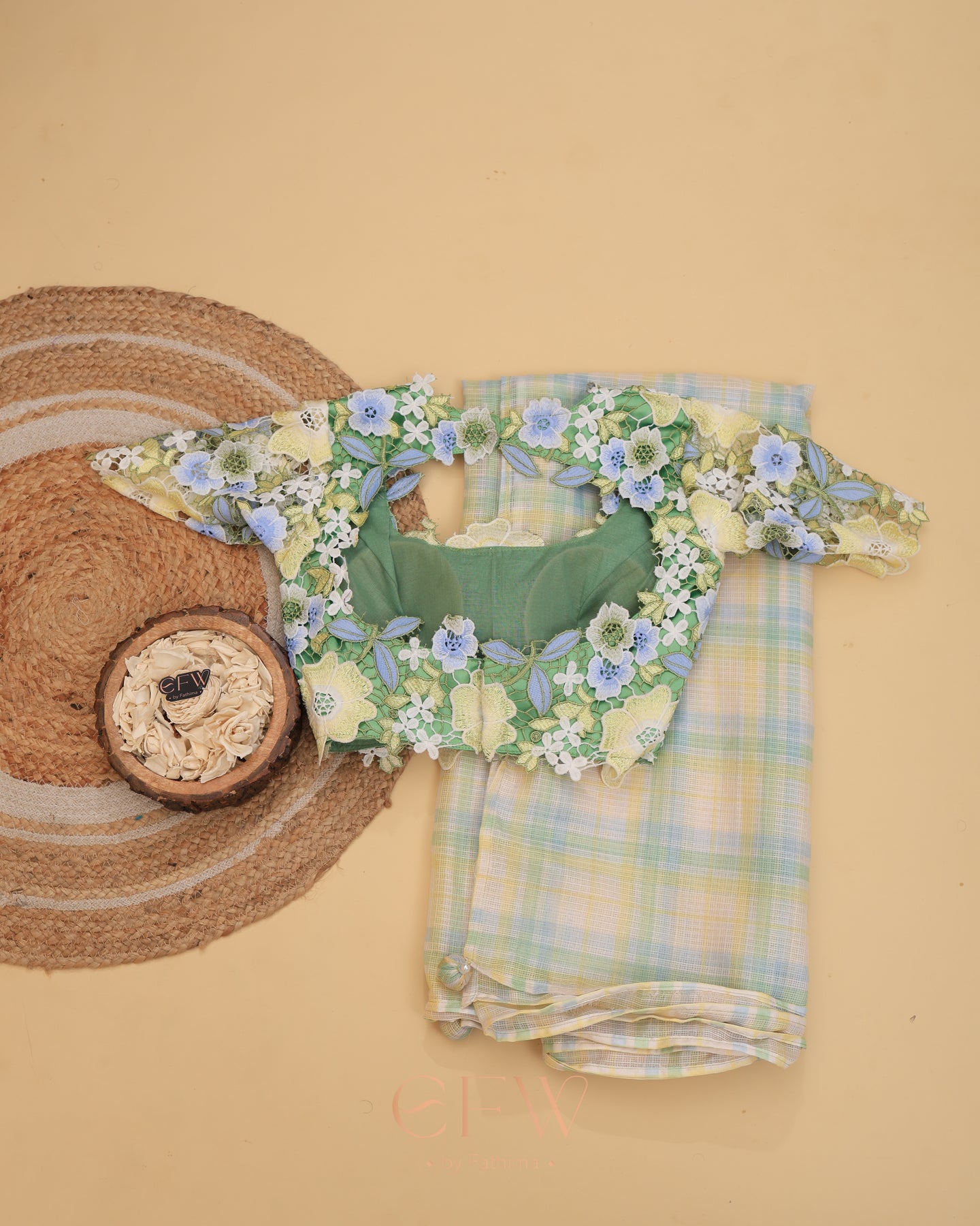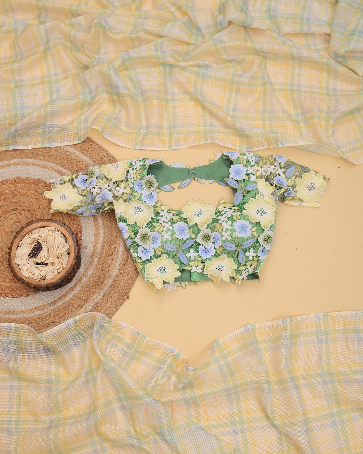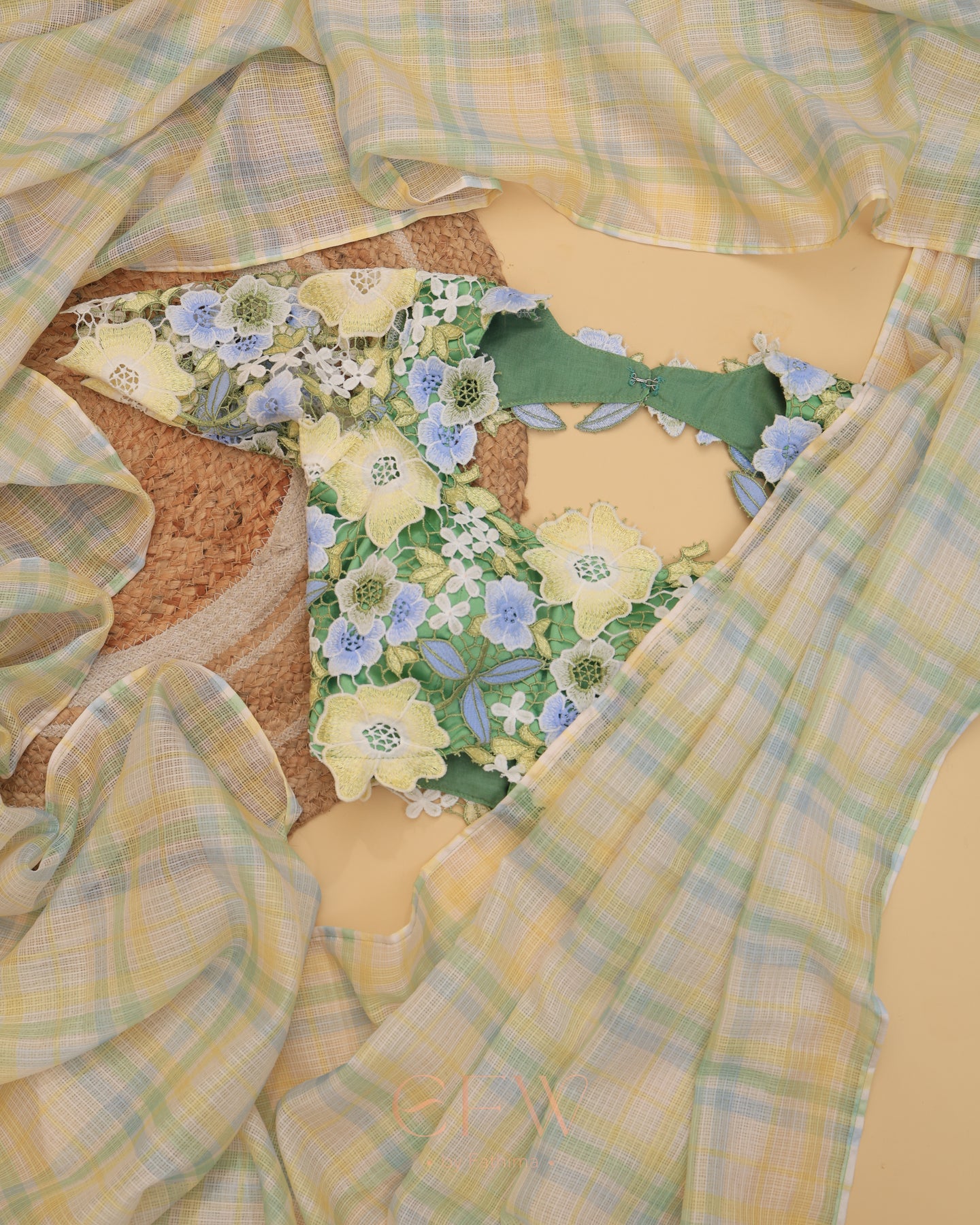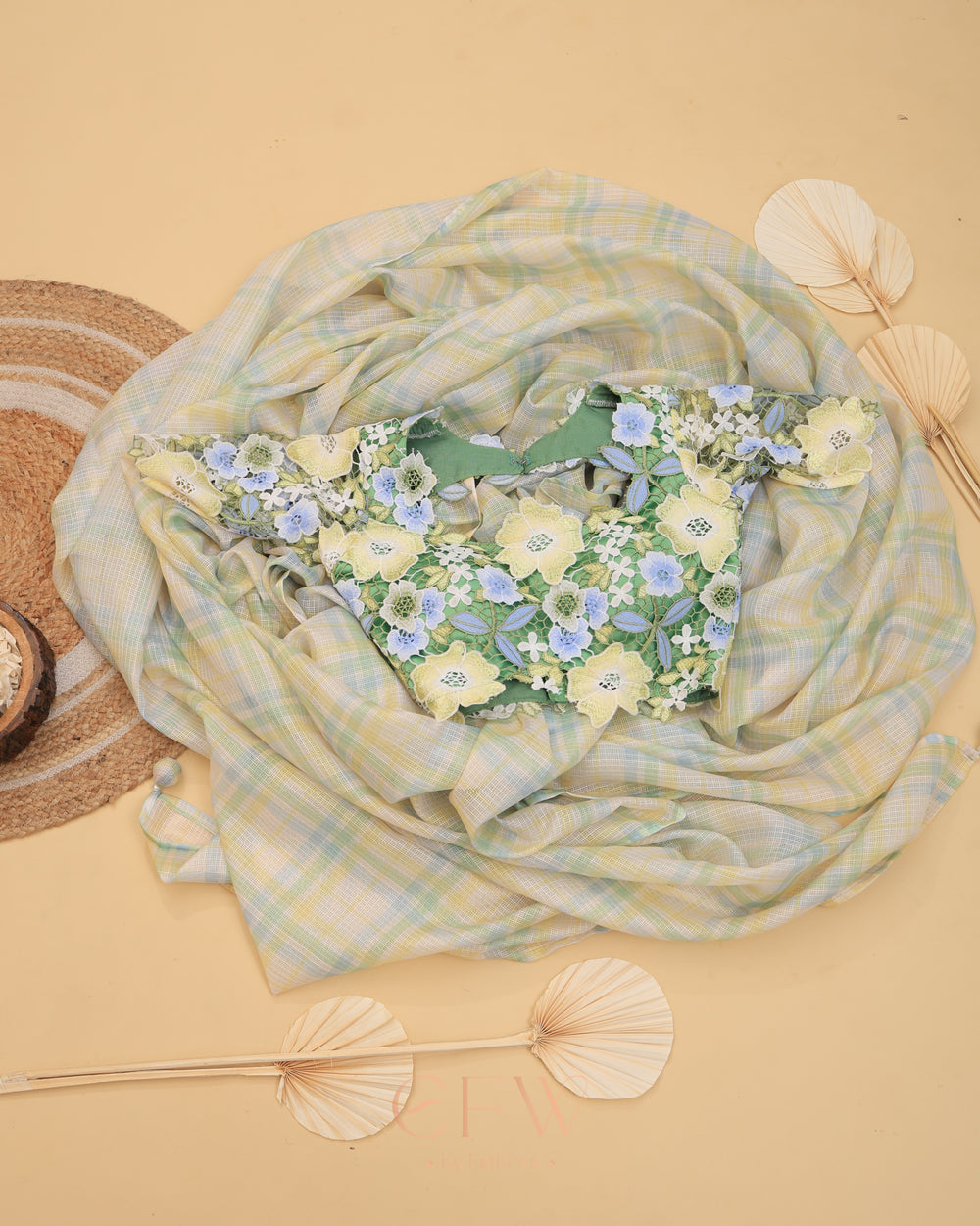 A creation that carries the warmth of morning light — this scratch-built Kota saree is woven in pastel yellow, soft green, and sky-blue checks, each shade flowing seamlessly into the next like sunlight across a courtyard. Feathery in texture and effortless in drape, it offers a rare balance of ease and elegance.