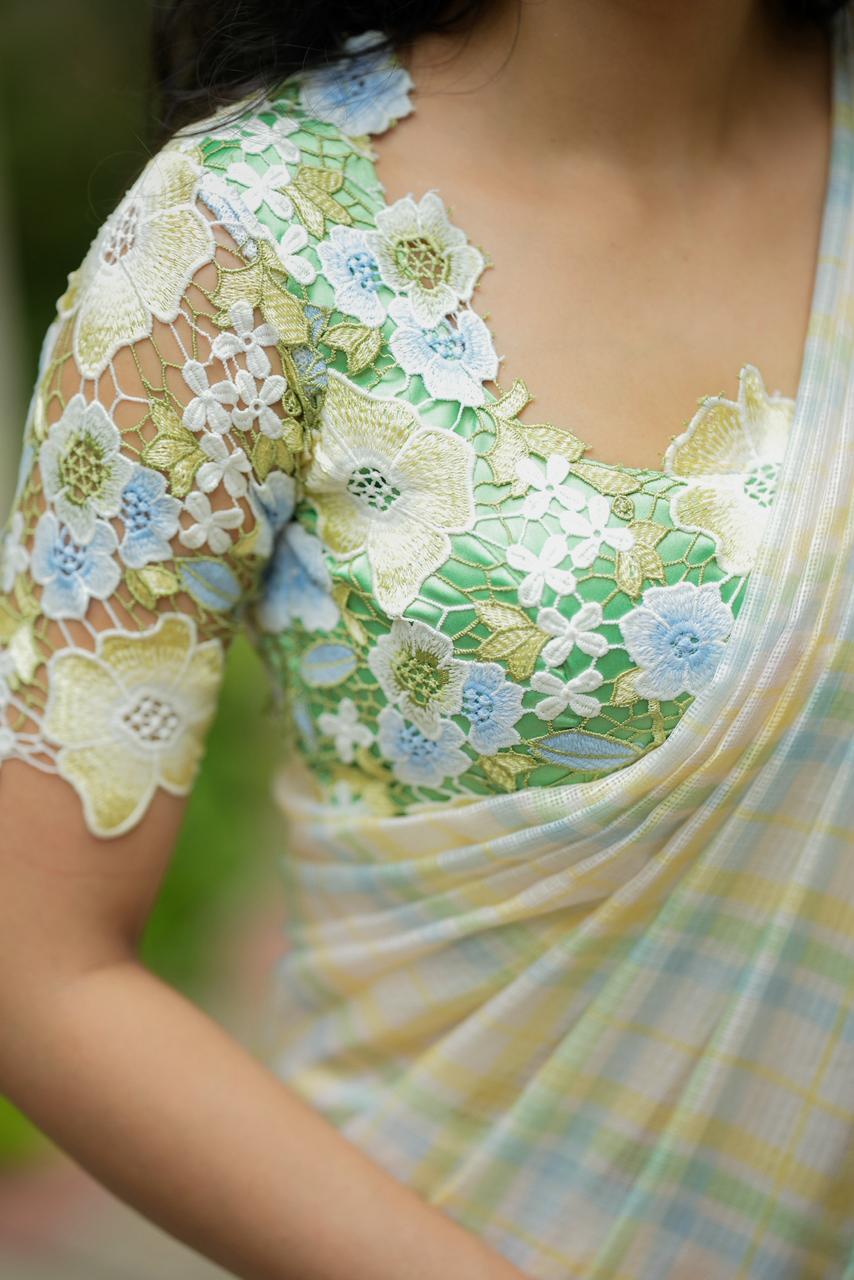 The saree is paired with a hand-crafted 3D floral blouse, where delicate blooms are stitched in subtle hues, adding dimension without weight. It is refined, understated, and unmistakably luxurious.