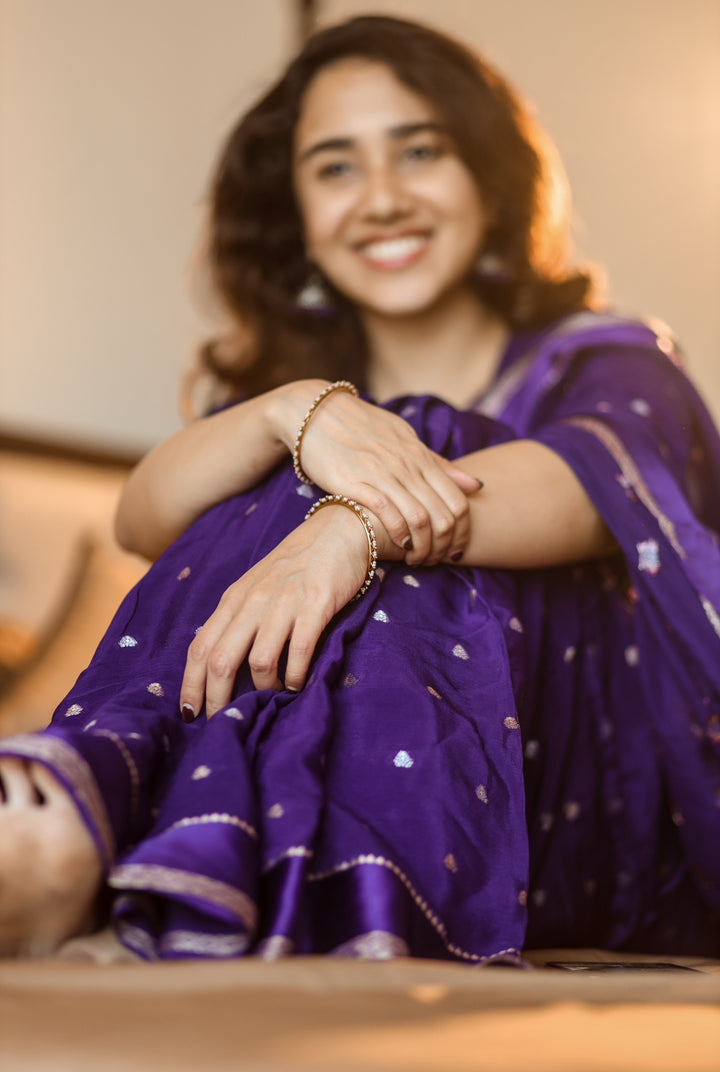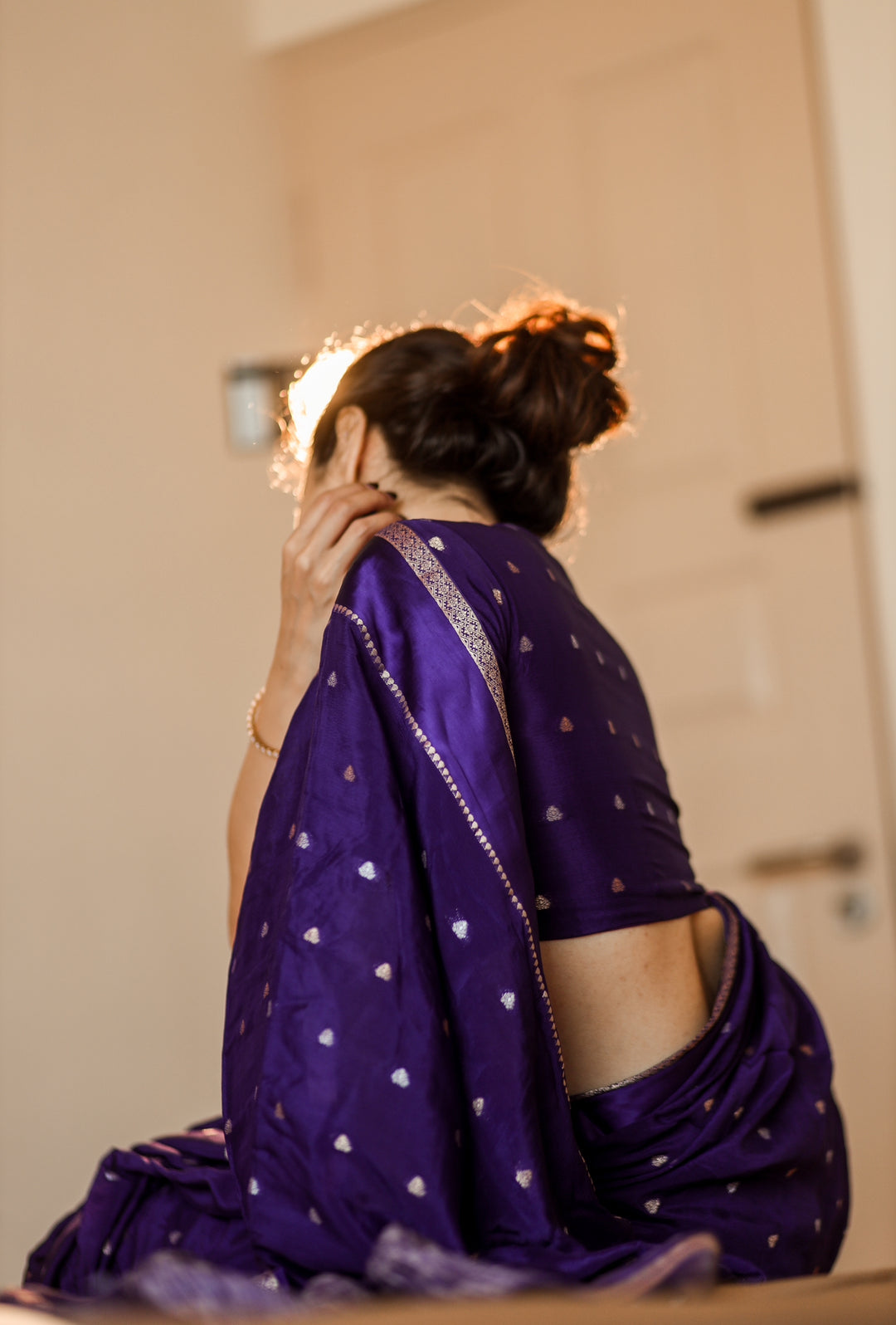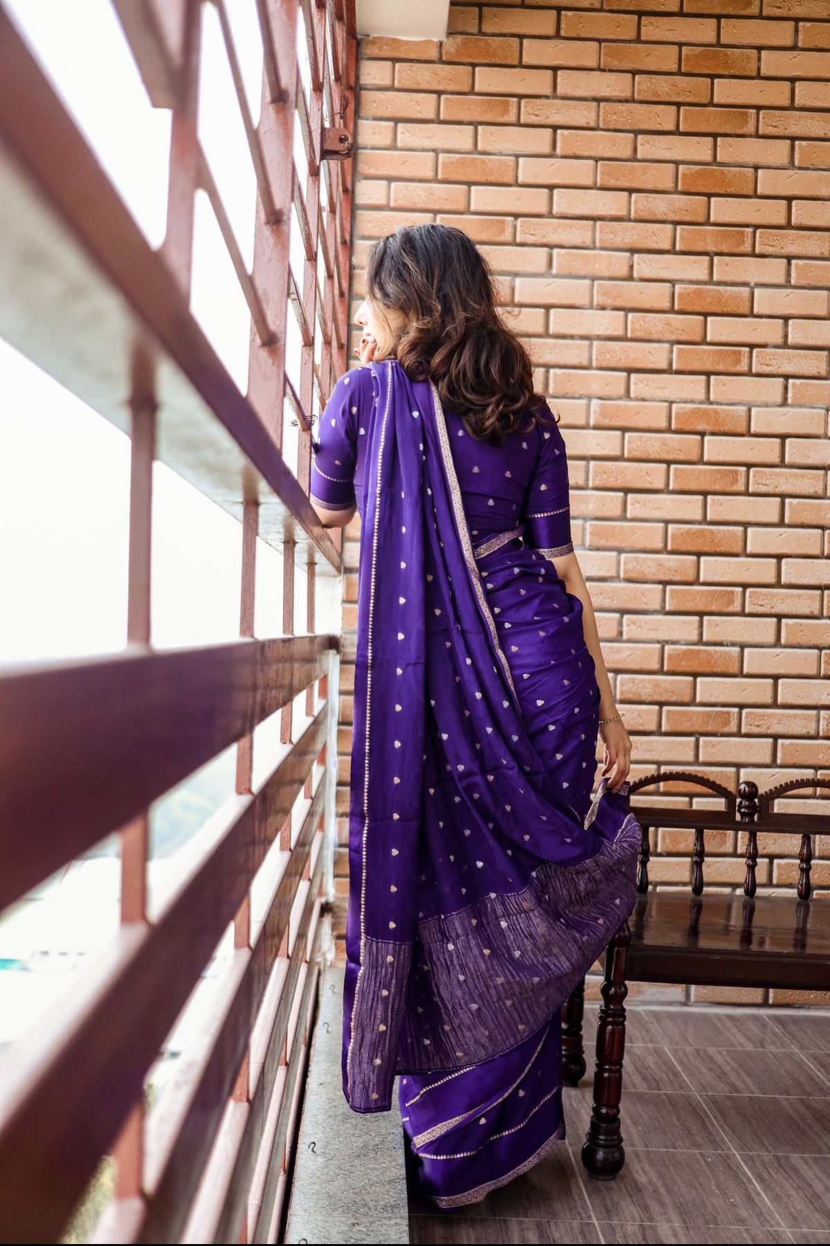 Introducing our exquisite Pure Chinnon saree, expertly crafted with intricate zari weaving and a sumptuous satin silk border. This luxurious piece combines traditional richness with a modern touch, creating a mesmerizing flow when draped. Its high-neck back and closed V-neck front design add to its grace and sophistication. The stunning Russian violet hue exudes royalty and elegance, making it the perfect choice for any occasion. Our model effortlessly showcases this saree's vintage-inspired elegance.