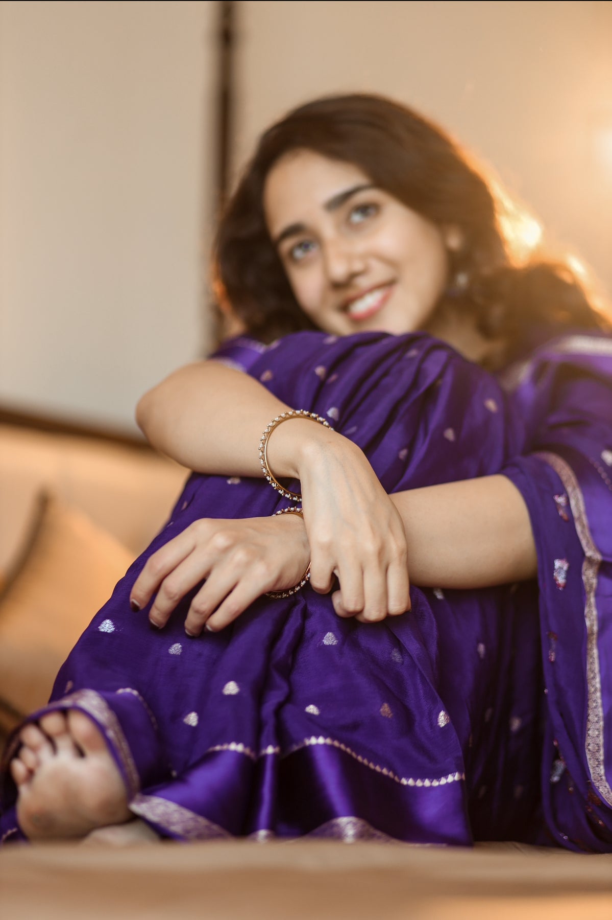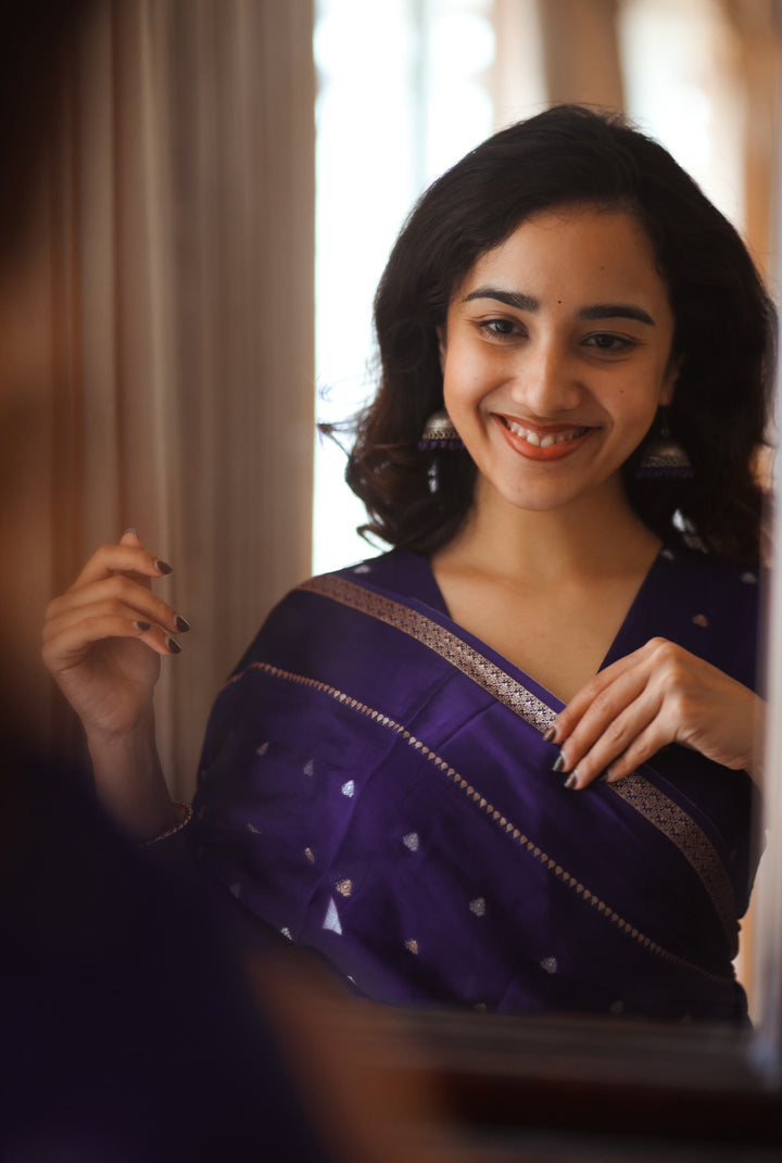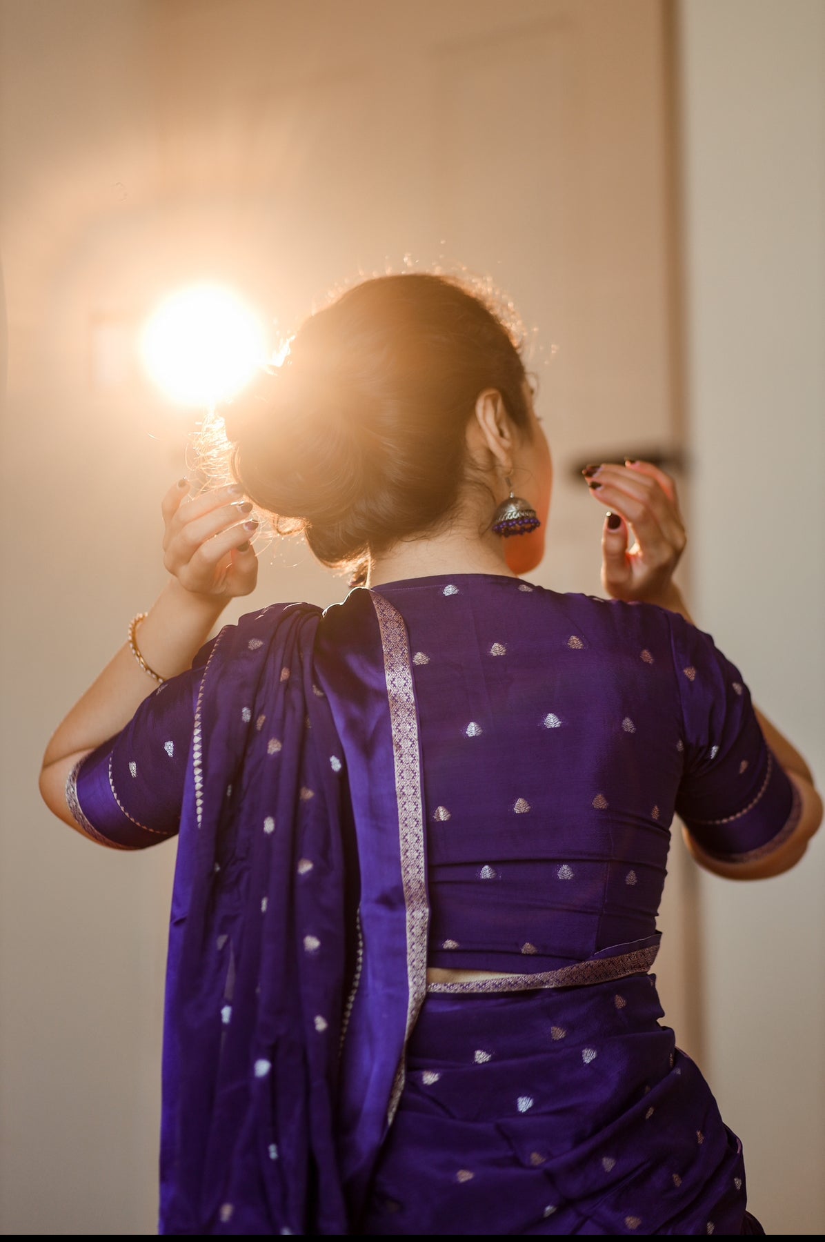 Introducing our exquisite Pure Chinnon saree, expertly crafted with intricate zari weaving and a sumptuous satin silk border. This luxurious piece combines traditional richness with a modern touch, creating a mesmerizing flow when draped. Its high-neck back and closed V-neck front design add to its grace and sophistication. The stunning Russian violet hue exudes royalty and elegance, making it the perfect choice for any occasion. Our model effortlessly showcases this saree's vintage-inspired elegance.